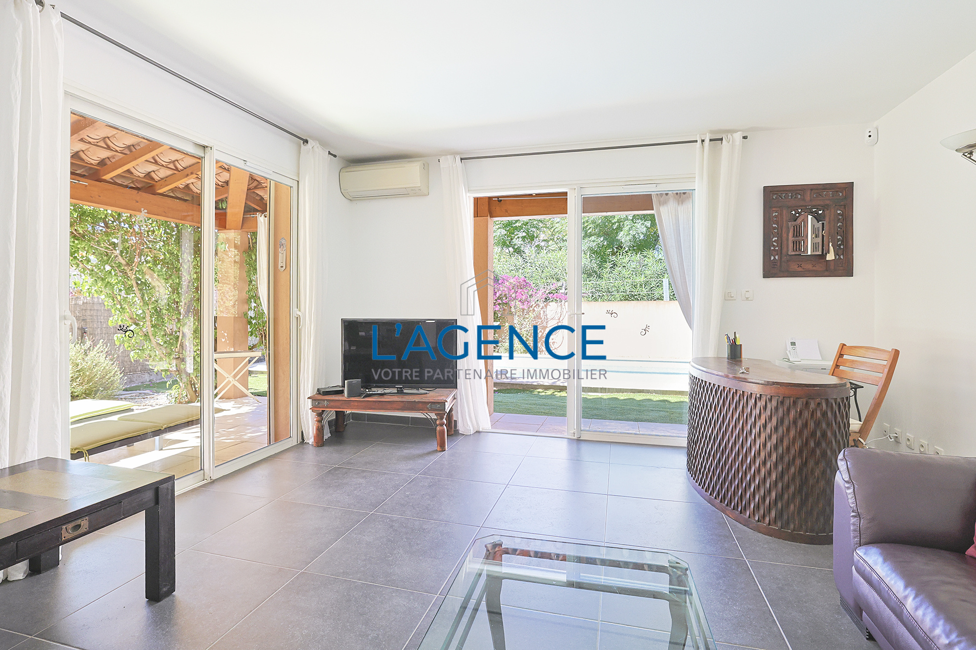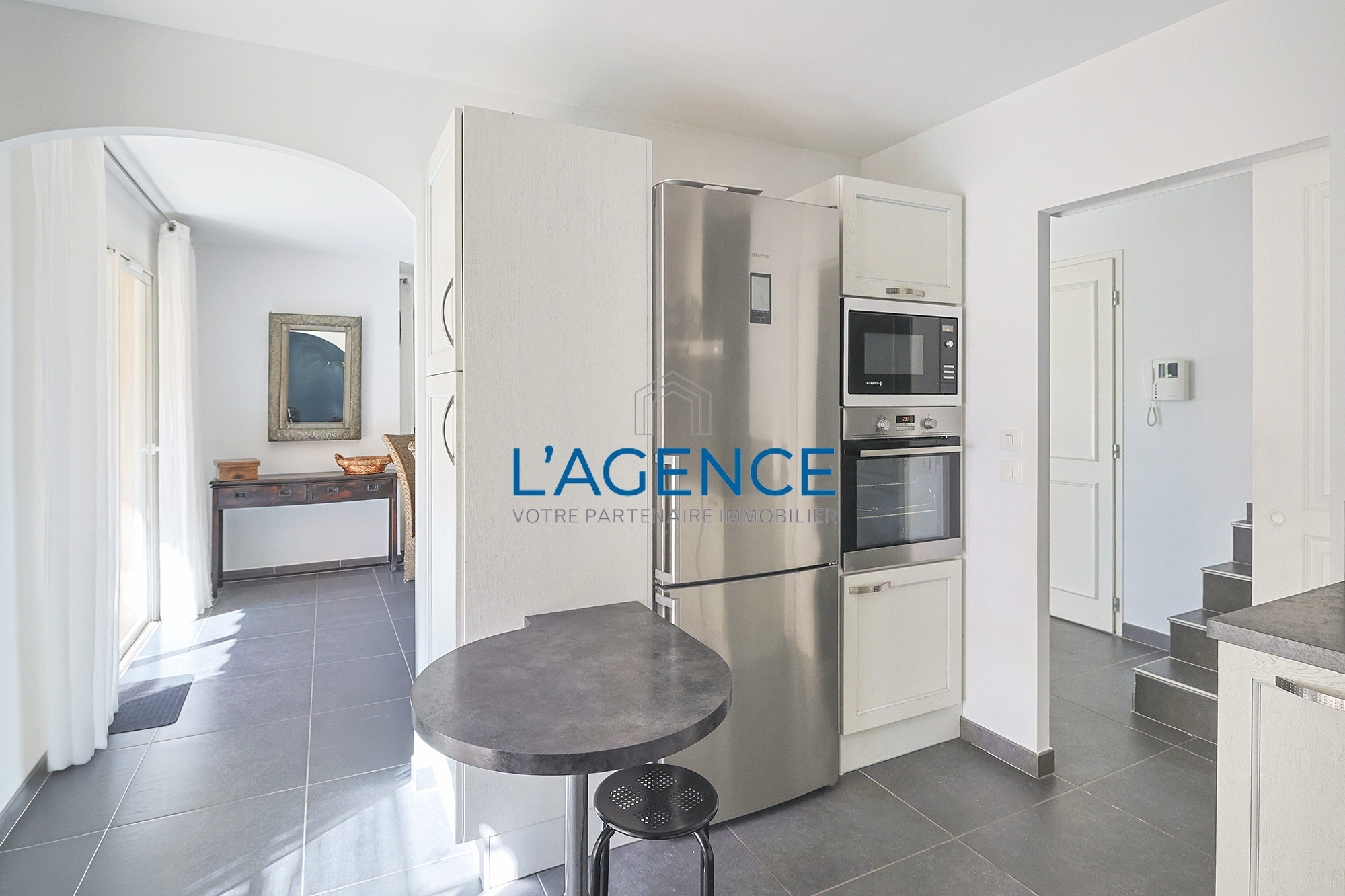 Des l'entrée un grand salon séjour de 40 m2 avec de grandes baies vitrées ouvrant sur les terrasses et la piscine . Cuisine semi ouverte entiérement équipée et aménagée. Chambre de plain pied avec salle d'eau et dressing . Buanderie , cellier .
