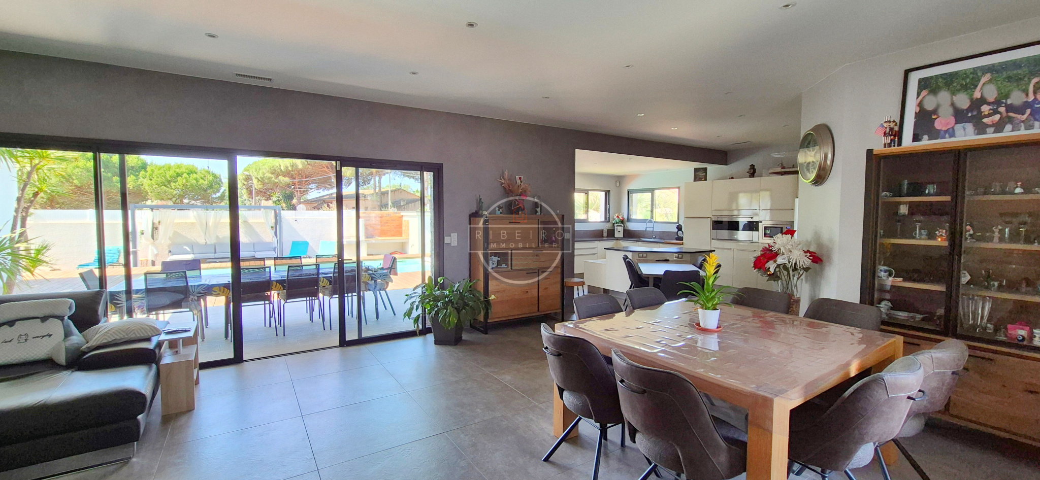 À quelques pas de la plage, cette villa contemporaine de plain-pied incarne l'harmonie parfaite entre espace, confort et modernité.