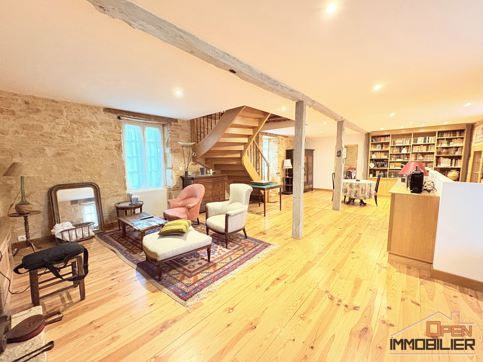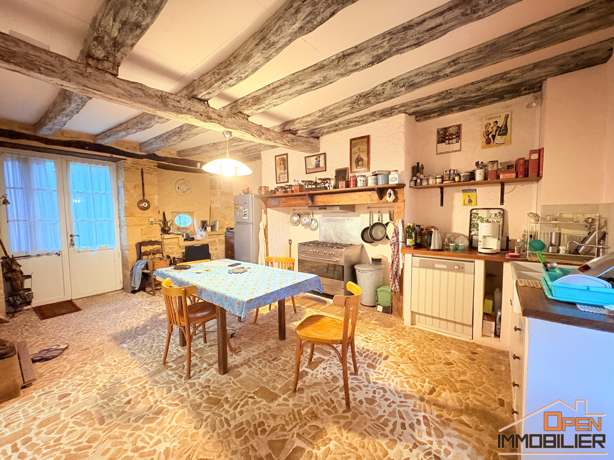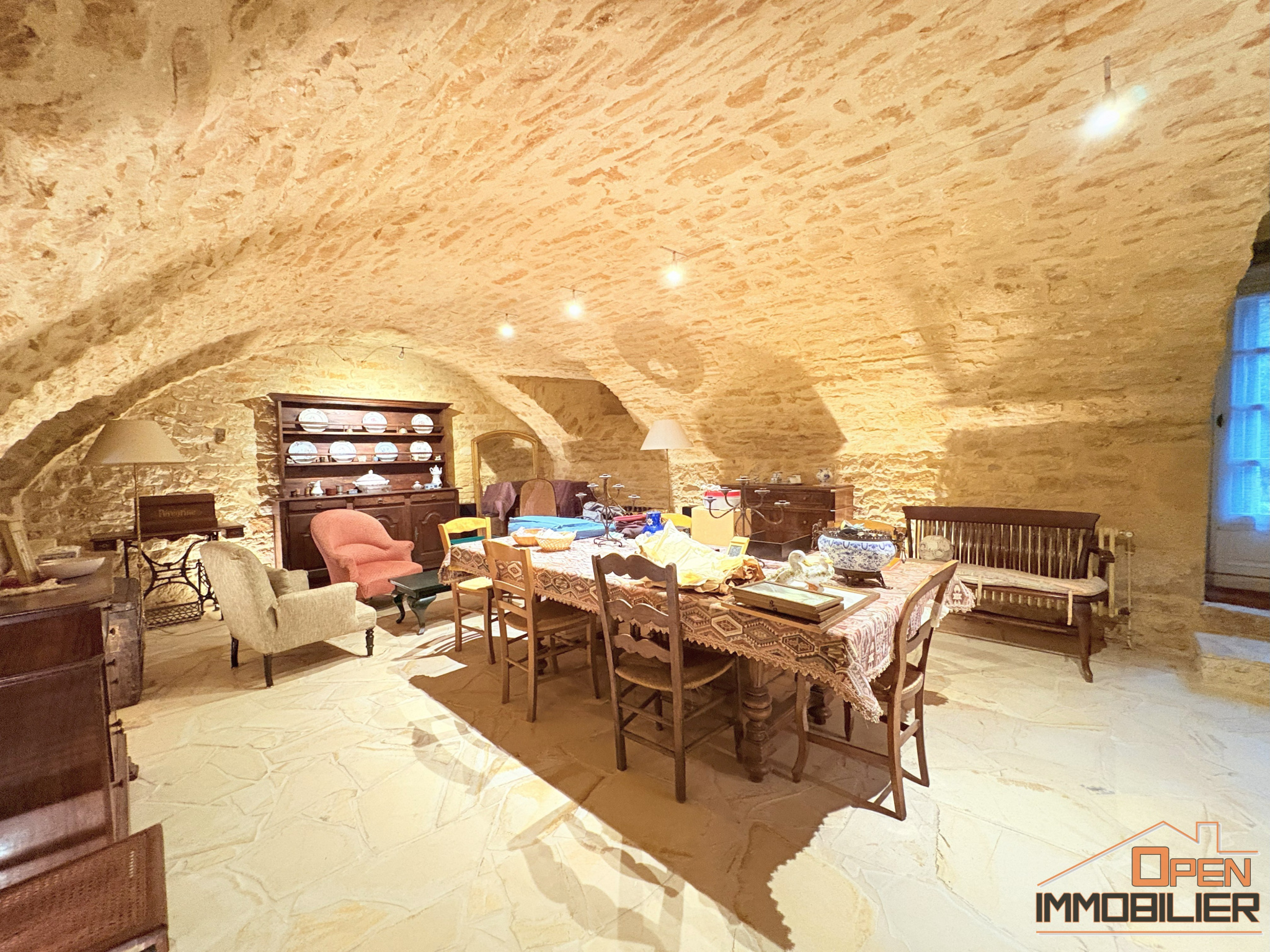 La propriété est composée d'une maison principale en pierre d'environ 170m2 comprenant au rdc une entrée sur grande cuisine d'environ 24m2 avec superbe sol en pisé et cantou d'époque, toilettes avec lave-mains et magnifique salle voûtée d'environ 30m2.