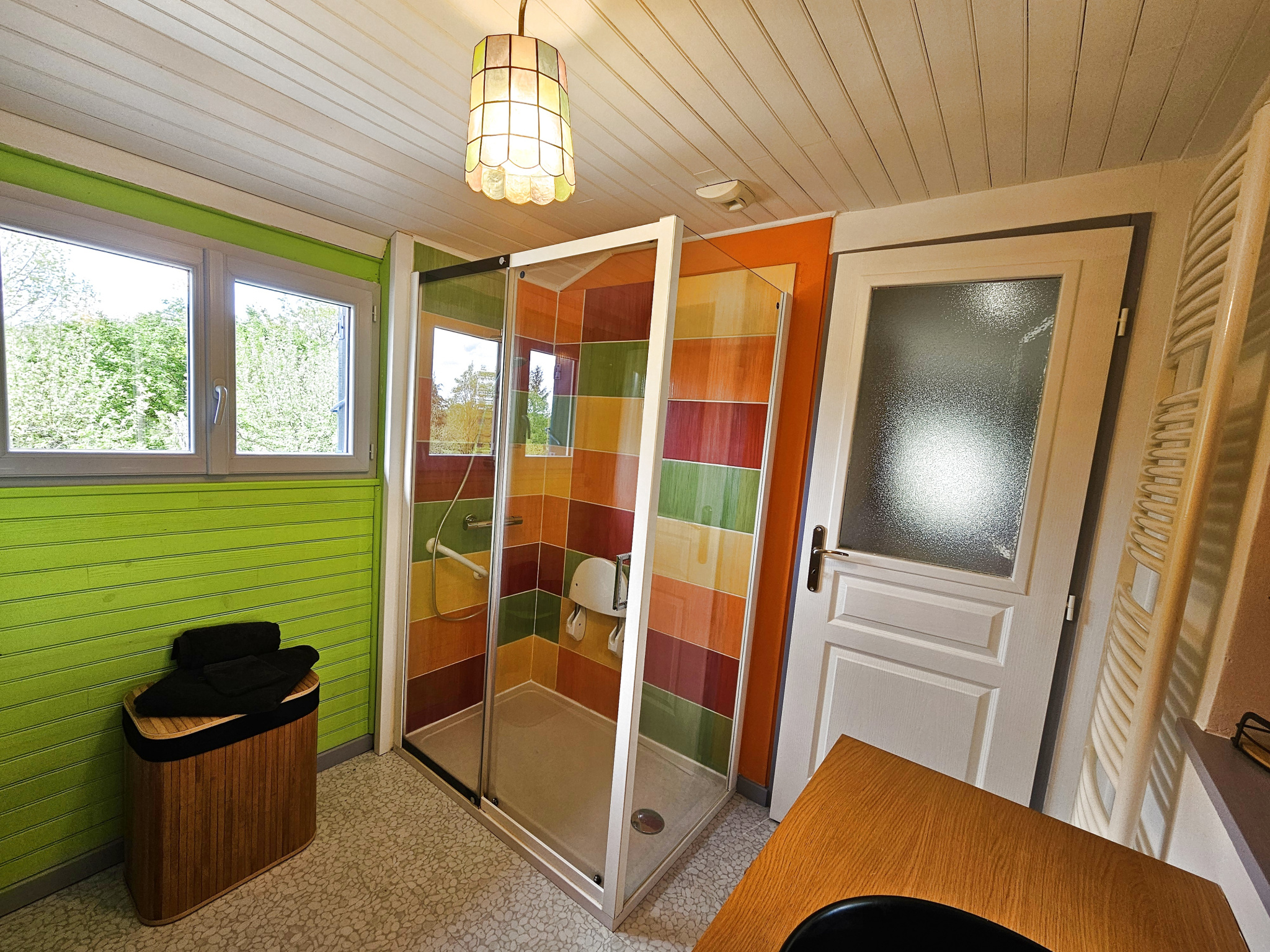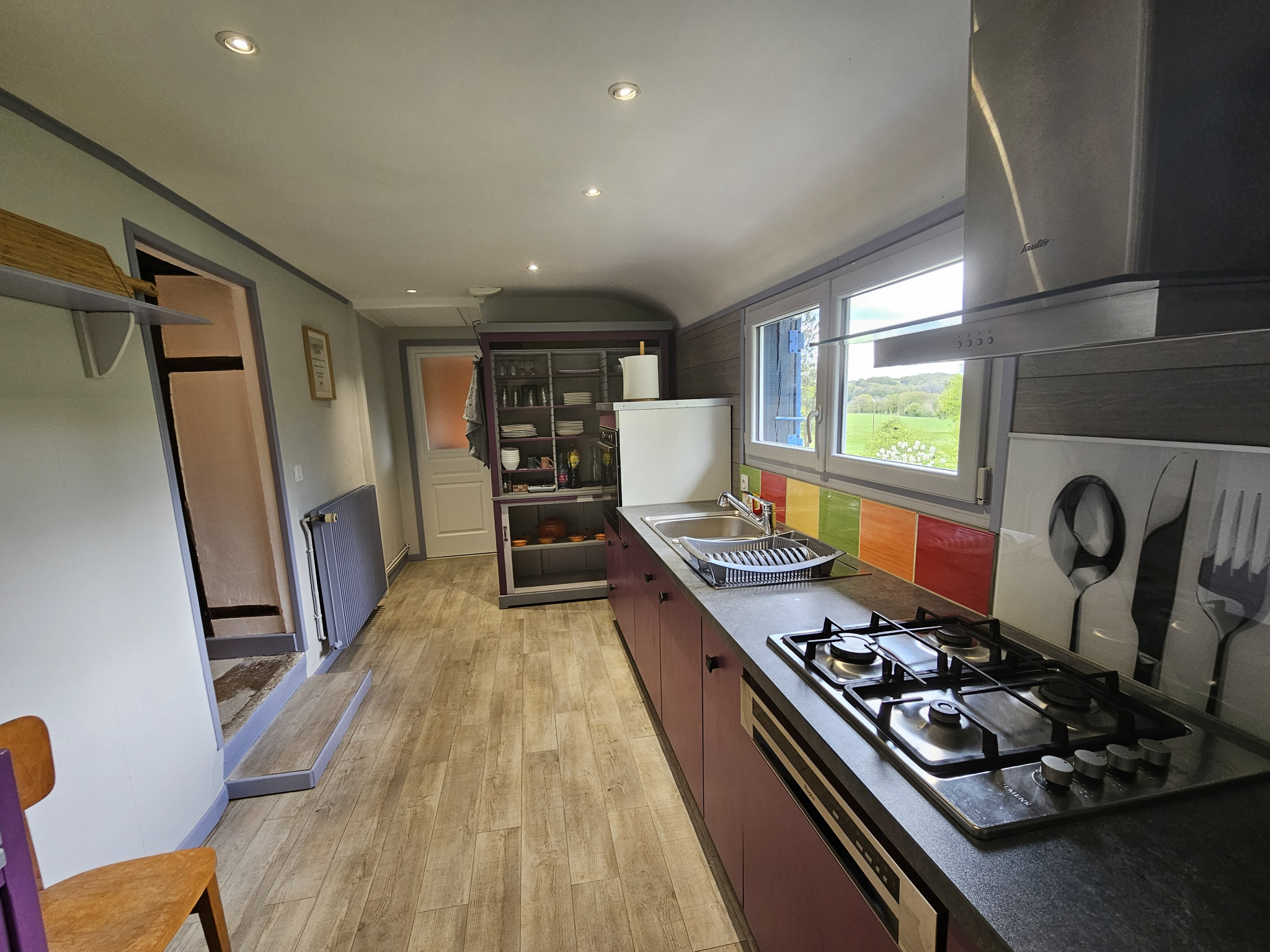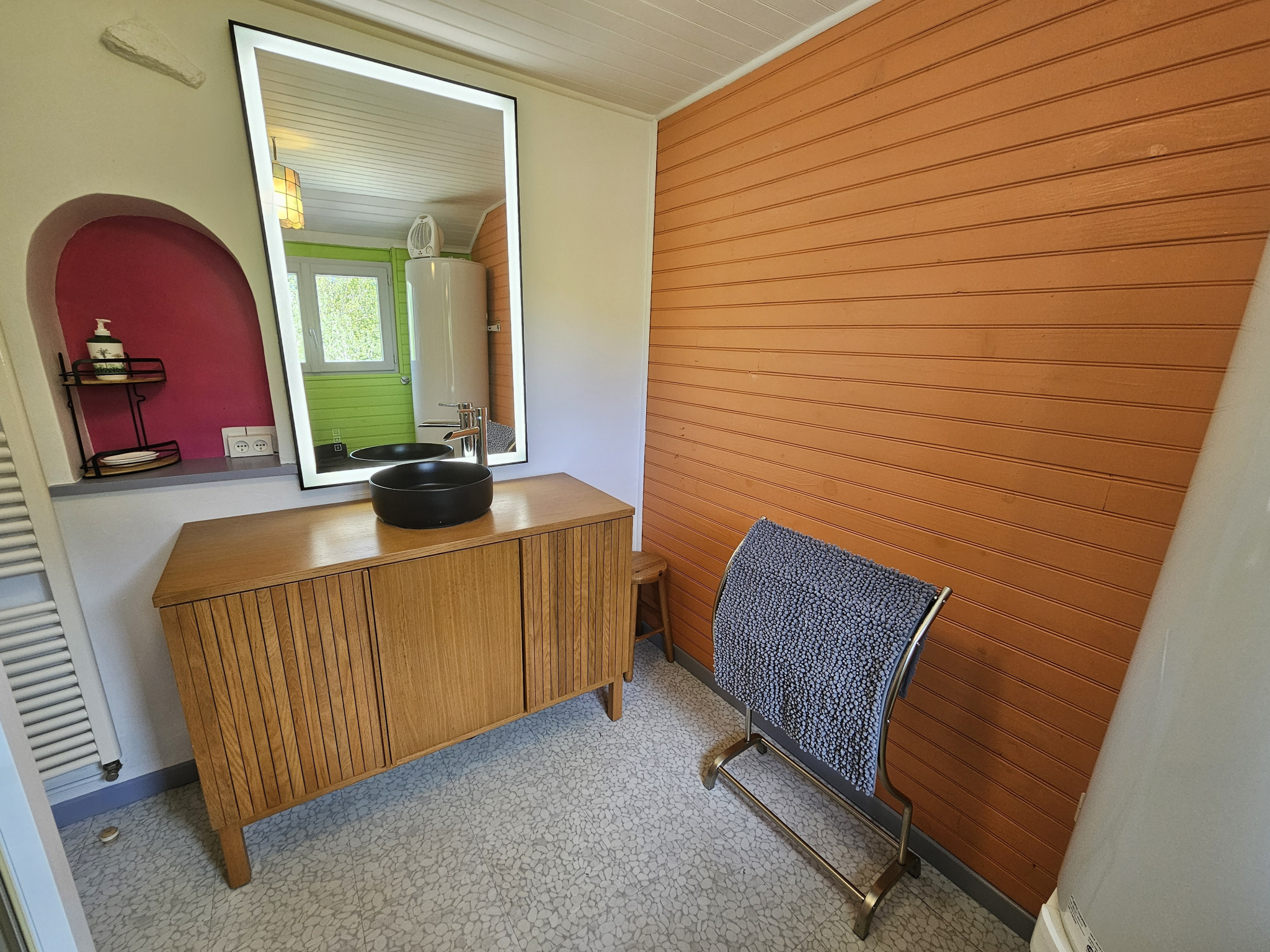 Composée au rez-de-chaussée d'une pièce de vie avec poêle à bois, un salon cosy, une buanderie, une cuisine entièrement équipée qui donne sur une terrasse couverte. Egalement une salle d'eau avec vasque sur meuble et miroir éclairé, et un WC séparé.