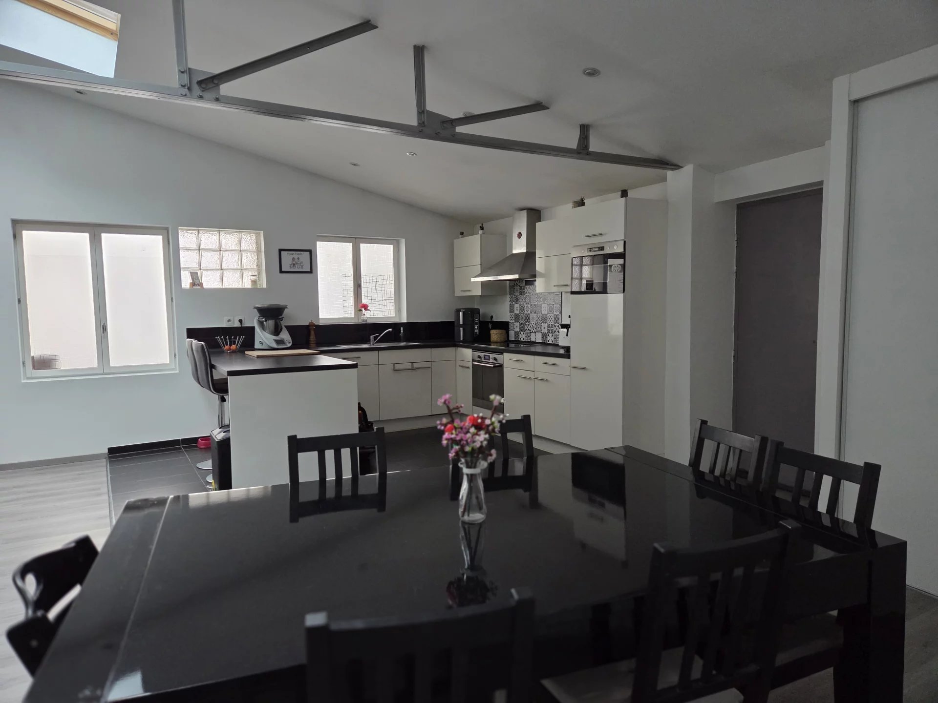 Dès l'entrée, on découvre un vaste espace de vie d'environ 60 m², baigné de lumière et sublimé par ses poutres métalliques apparentes, qui lui confèrent un esprit atelier résolument actuel. Cet espace généreux se prête aussi bien aux moments de convivialité qu'aux instants plus intimes.