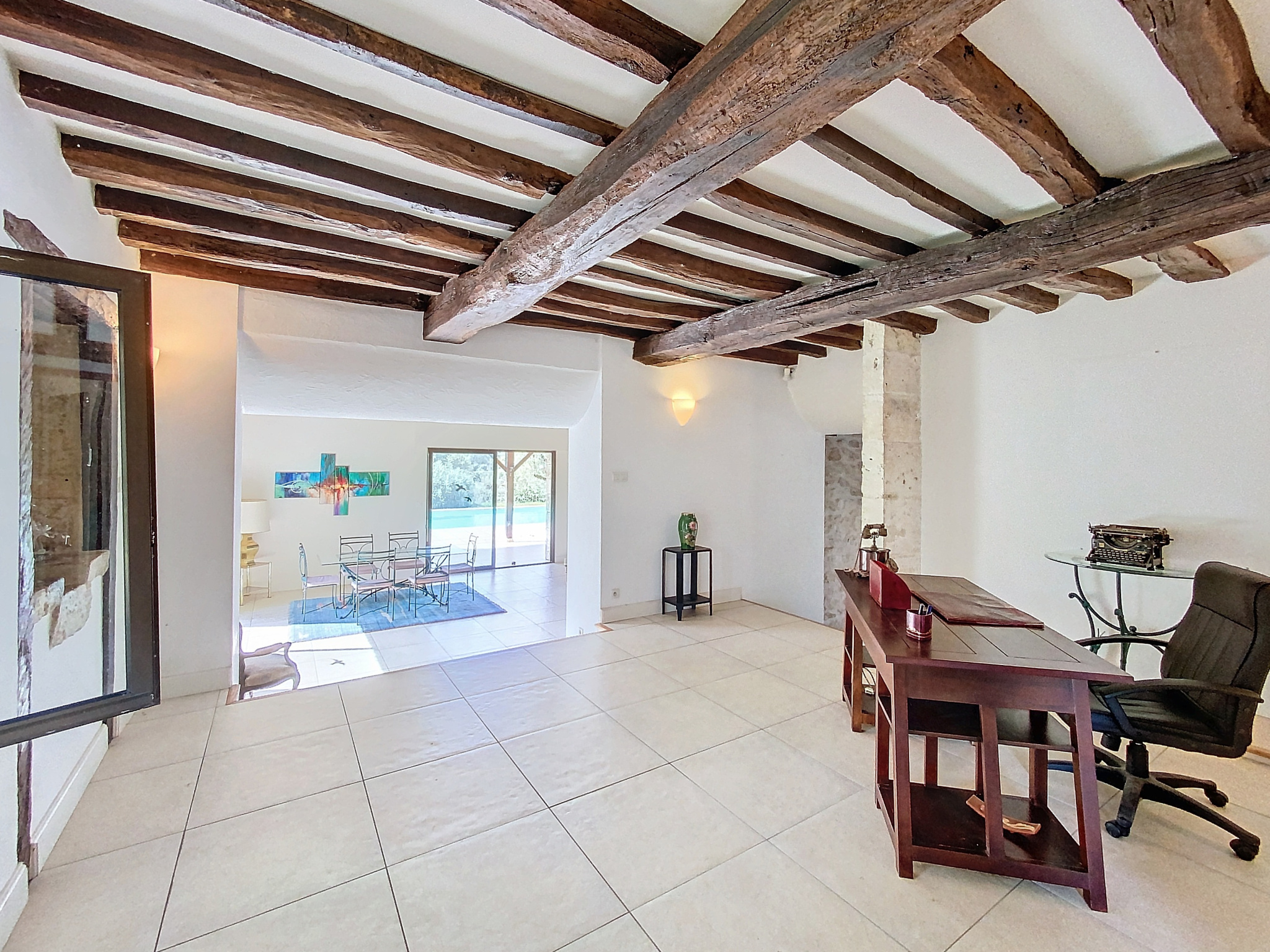 Dans la maison d'habitation principale, un vaste vestibule avec vestiaire et toilettes donne accès à une cuisine spacieuse ainsi qu'à un vaste espace rassemblant la salle à manger, le salon TV ainsi que le salon d'été dont les vastes baies vitrées s'ouvrent sur la terrasse suivie de la piscine.
