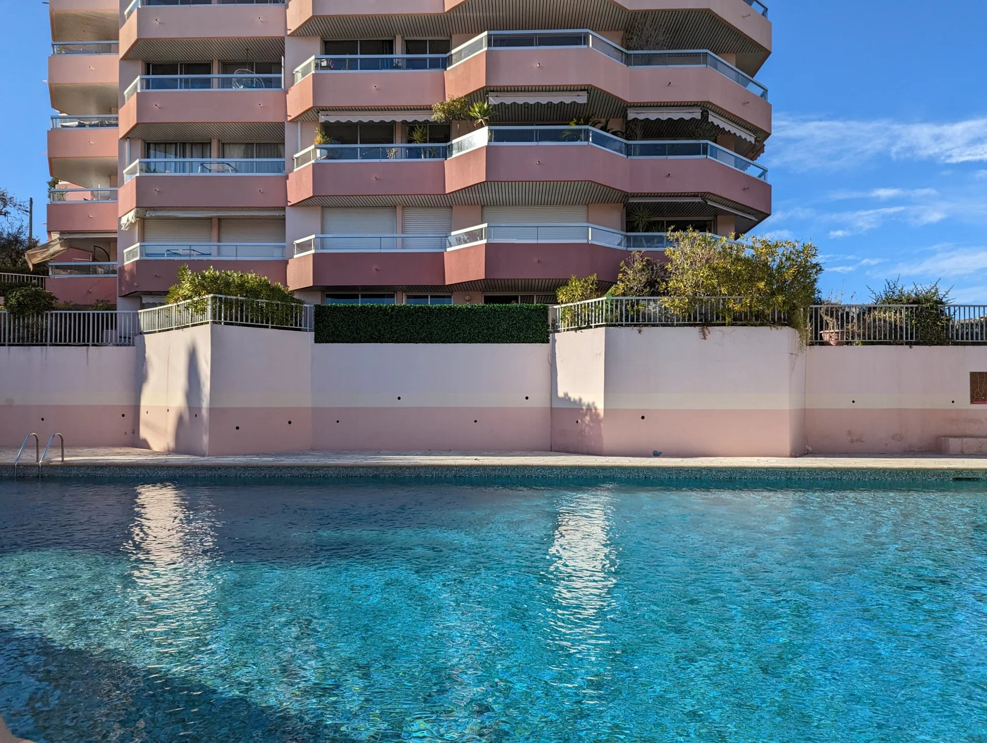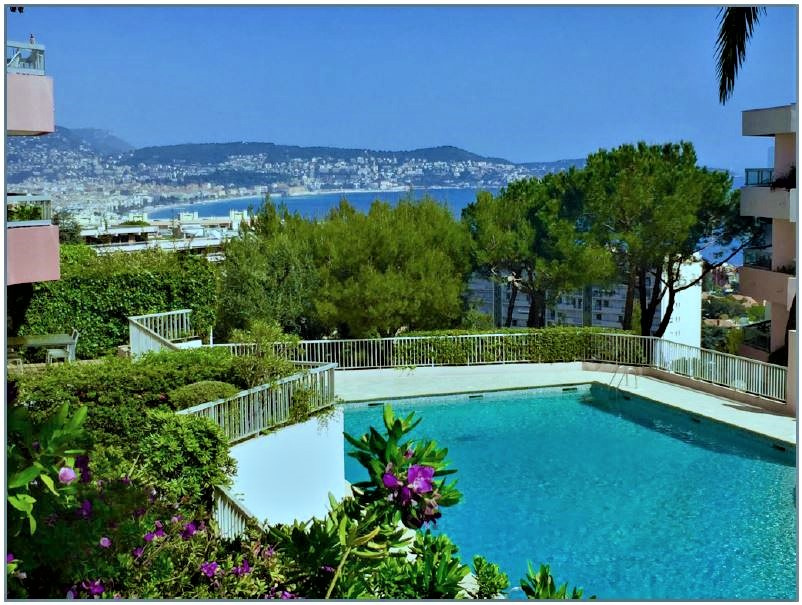 Nice Fabron. Dans superbe résidence avec piscine. Au calme absolu, Spacieux 2 pièces traversant avec balcons et terrasse profonde. Vue dégagée mer et collines, grand séjour lumineux. Chambre au calme absolu avec balcon. Cuisine indépendant équipée avec balcon. Nombreux rangements, WC indépendant, salle de bains. Cave et garage en sous-sol de la résidence