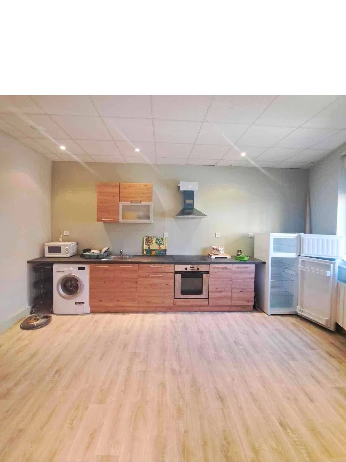 Une cuisine semi-équipée moderne avec électroménager (four, plaques, hotte, micro-ondes, lave-linge, réfrigérateur?),