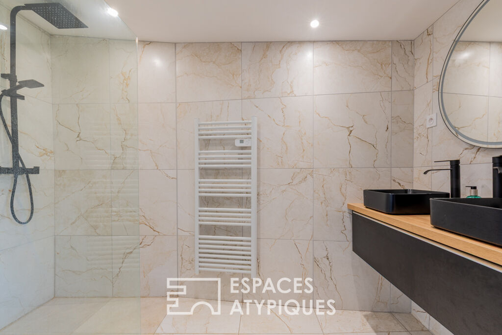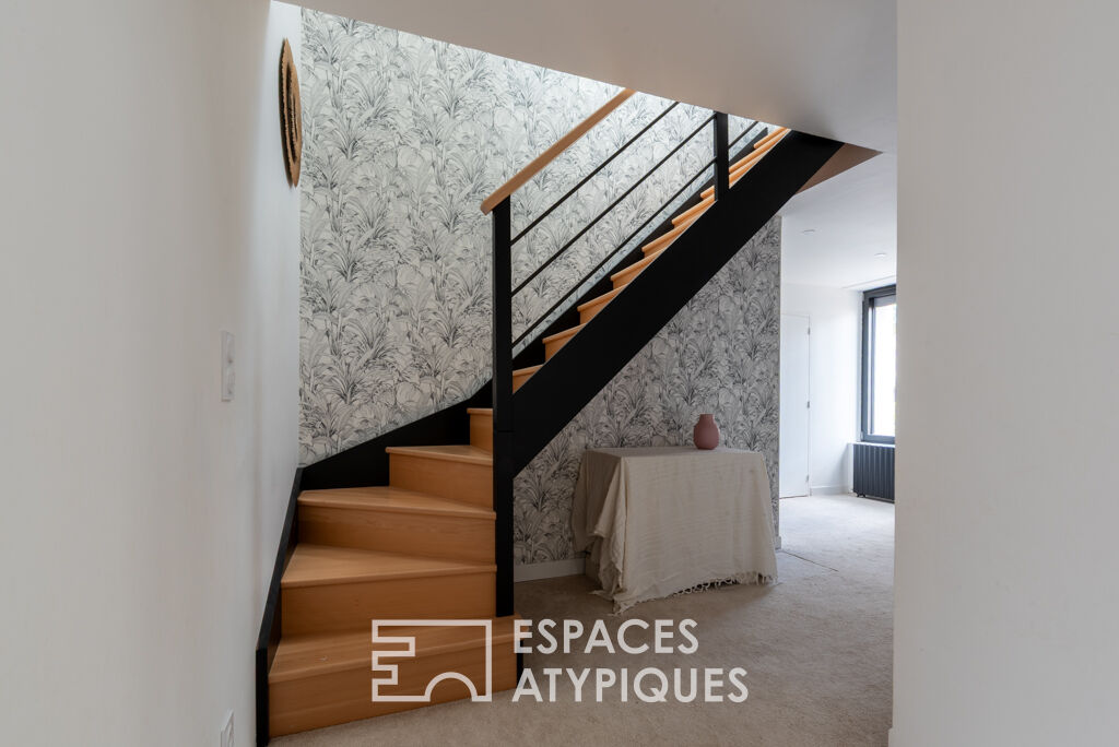 En plein coeur de Saint-Aubin-d'Aubigné, cette maison de ville de 178 m² déploie ses volumes sur trois niveaux et prend place sur un terrain clos et arboré de 262 m². Rénovée avec soin, elle conjugue le charme de l'ancien et le confort contemporain. Parquets en bois, poutres apparentes et belles hauteurs sous plafond soulignent l'authenticité de ce lieu de vie, complété par une terrasse, un jardin intime et un garage. Dès l'entrée, les lignes épurées et les matériaux nobles donnent le ton. Le rez-de-chaussée accueille une cuisine dînatoire aménagée et équipée, à la fois fonctionnelle et baignée de lumière. Une arrière-cuisine permet un espace buanderie et chaufferie discret et pratique. Le salon-séjour, sublimé par une cheminée en marbre, profite d'une double exposition et d'un accès direct à la terrasse, offrant ainsi un espace de vie convivial et chaleureux, idéal pour recevoir. A l'étage, un large palier dessert deux chambres sur parquet aux volumes agréables, dont l'une à double exposition, une salle de bain avec douche, ainsi qu'une suite parentale élégante, dotée de son propre dressing et d'une salle d'eau avec double douche. Le dernier niveau dévoile une chambre mansardée ainsi qu'un vaste espace à aménager selon les envies : salon intimiste, bureau, salle de jeux ou salle de sport. Une architecture propice à l'inspiration et à la créativité. A l'extérieur, la terrasse prolonge les espaces de vie vers un jardin confidentiel et arboré. Le garage complète ce bien pensé pour la vie de famille. La maison profite d'un emplacement central, à proximité immédiate des commerces, des écoles et des transports, dans un environnement calme et recherché. CLASSE ÉNERGIE : B CLASSE CLIMAT : A Montant moyen estimé des dépenses annuelles d'énergie pour un usage standard, établi à partir des prix de l'énergie de l'année 2021, 2022, 2023 (abonnements compris) : entre 1360 euros et 1890 euros (Diagnostics réalisés après Juillet 2021) Les informations sur les risques auxquels ce bien est exposé sont disponibles sur le site Géorisques : www.georisques.gouv.fr Pour plus d'informations et photos www.espaces-atypiques.com Contact : Bastien DELESTREE - 06 09 68 16 23 bastien.delestree@espaces-atypiques.com Agent Commercial EI - RSAC 984 714 139 RENNES Bastien DELESTREE (EI) Agent Commercial - Numéro RSAC : 984 714 139 - Rennes.