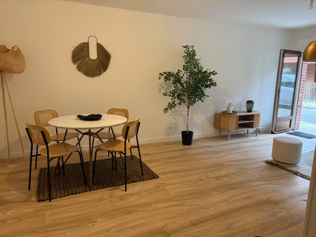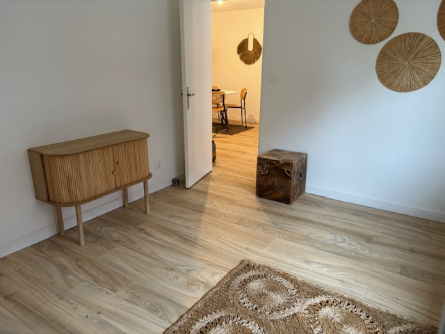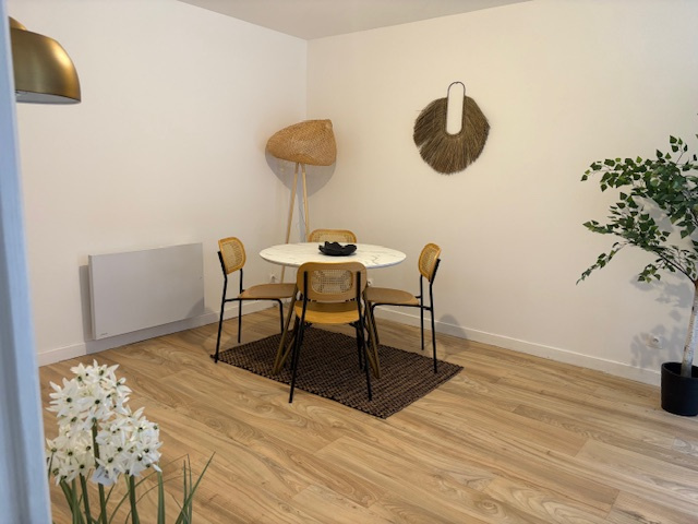 F2 en rdc complétement refait à neuf comprend (en cours de finition) : Entrée sur séjour ouvert sur cuisine aménagée et équipée, salle de bains + wc, chambre.
