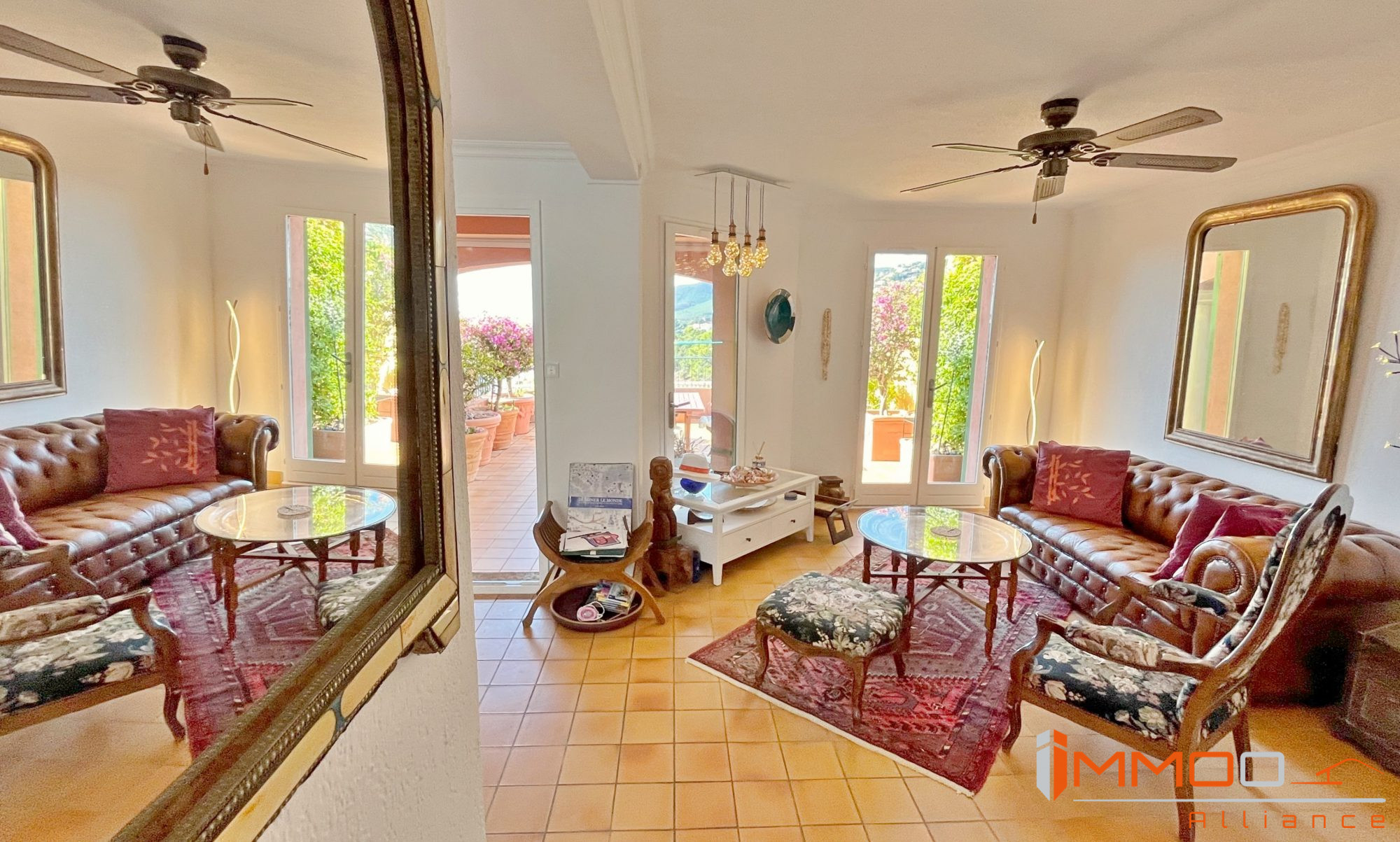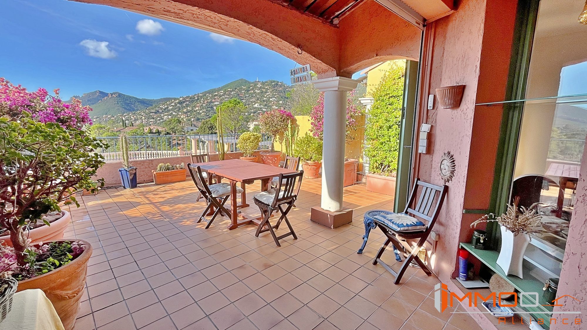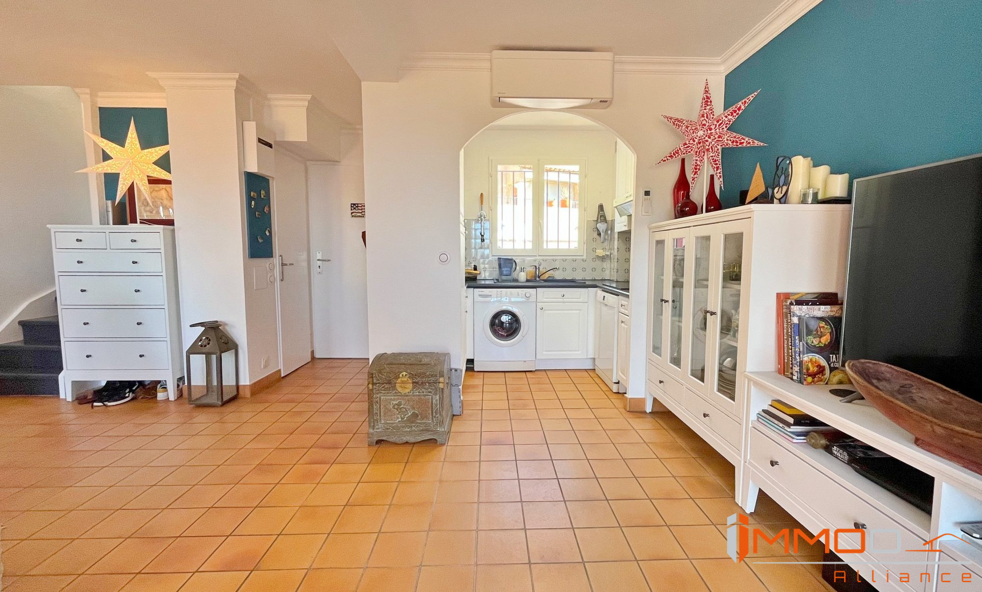 Dans un cadre de vie idyllique avec une vue imprenable sur la mer et le massif de l'Estérel, cette charmante maison mitoyenne bénéficie d'un espace de vie largement optimisé grâce à sa vaste terrasse de 37 m² exposée sud-ouest. Véritable prolongement du séjour, cet espace extérieur généreux enrichit considérablement la surface de vie globale pour une surface totale de près de 65m2.