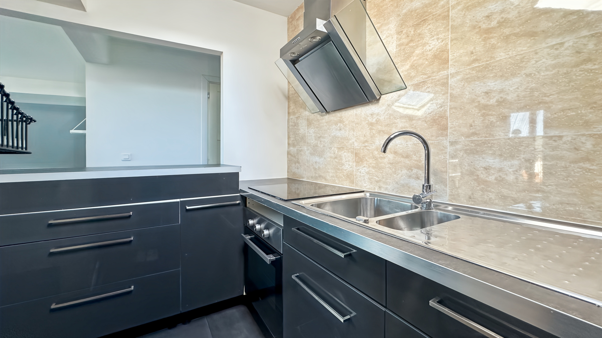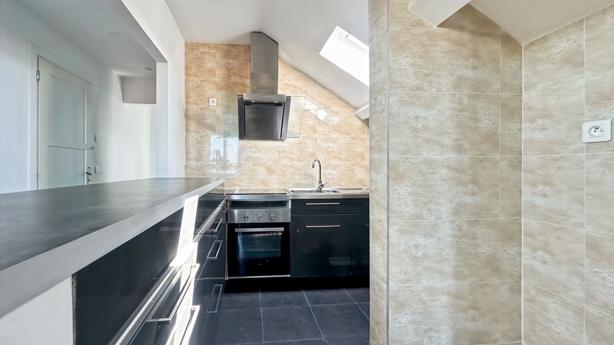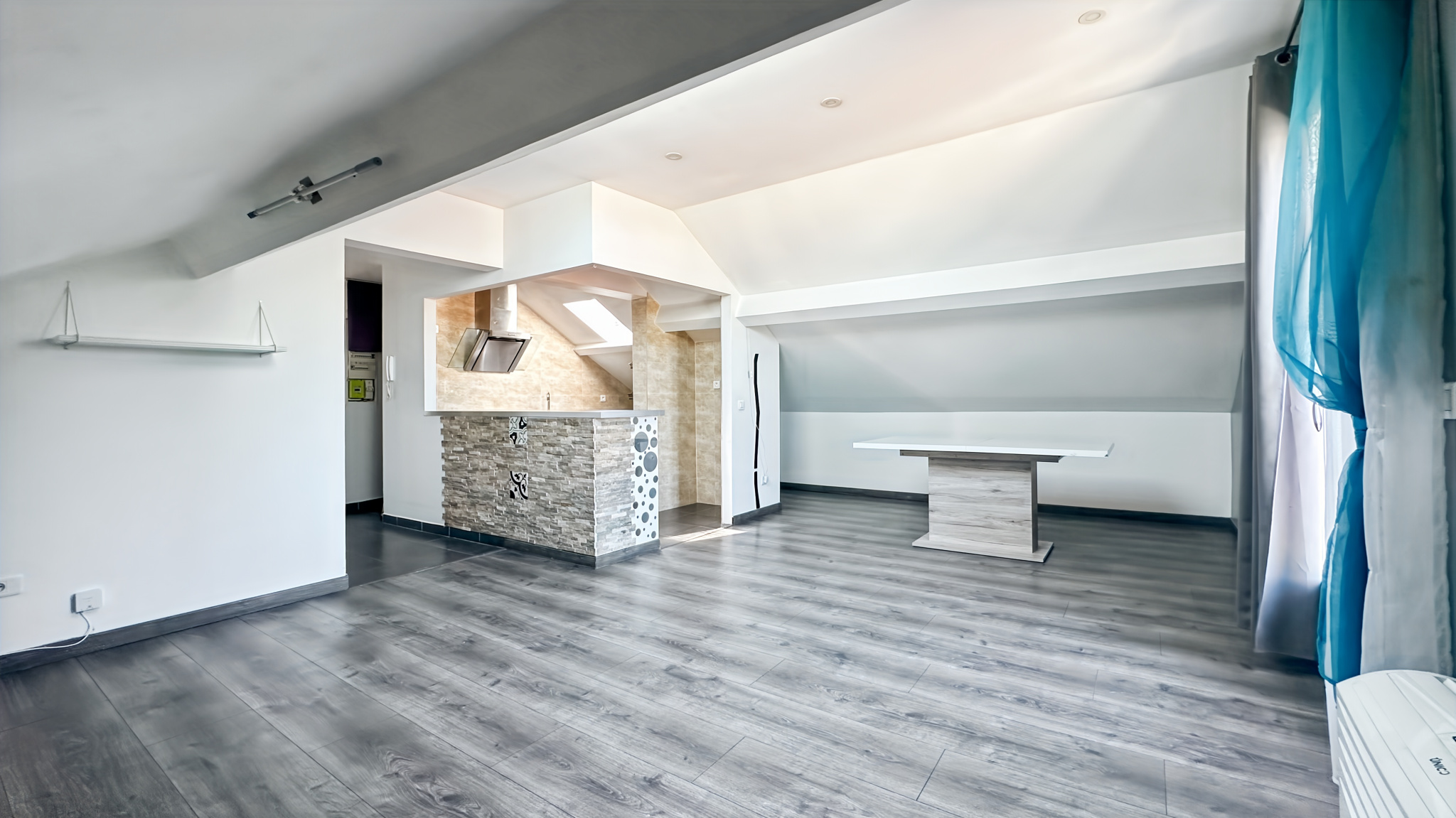 Une entrée menant sur une lumineuse pièce de vie avec sa cuisine moderne, aménagée et équipée (four plaque hotte),
