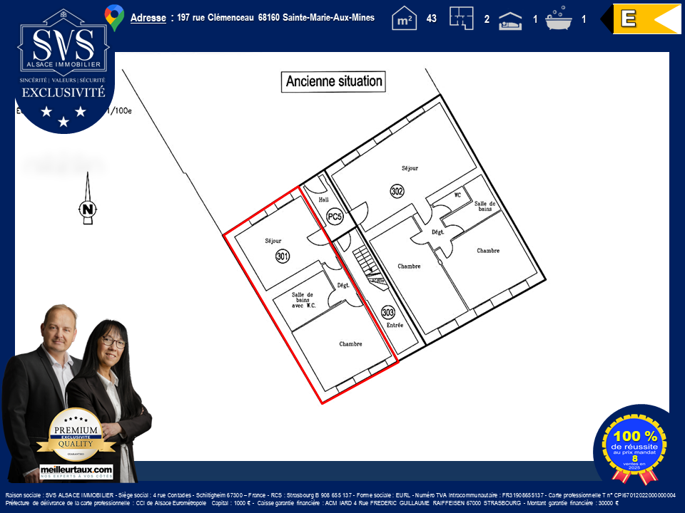 Raison sociale : SVS ALSACE IMMOBILIER - Siège social : 4 rue Contades - Schiltigheim 67300 France RCS : Strasbourg B 908 655 137 - Forme sociale : EURL - Numéro TVA Intracommunautaire : FR31908655137 - Carte professionnelle T no CPI67012022000000004 Préfecture de délivrance de la carte professionnelle : CCI de Alsace Eurométropole Capital : 1000 EUR - Caisse garantie financière : ACM IARD 4 Rue FREDERIC GUILLAUME RAIFFEISEN 67000 STRASBOURG - Montant garantie financière : 30000 EUR.