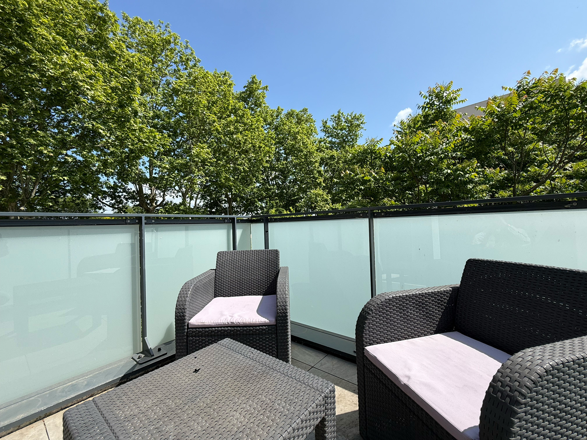 La pièce de vie baignée de lumière de 20 m2 s'ouvre sur une terrasse de plus de 4 m2 sans aucun vis-à-vis.