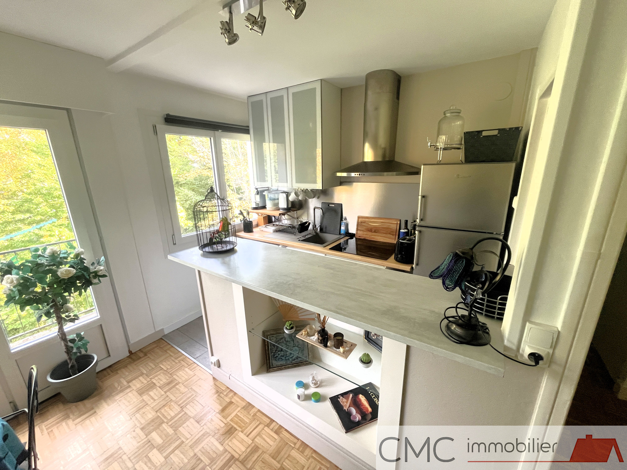 Il se compose d'une cuisine aménagée et entièrement équipée, ouverte sur un salon-séjour offrant un espace de vie convivial et moderne, avec un accès direct au balcon donnant sur une vue boisée.