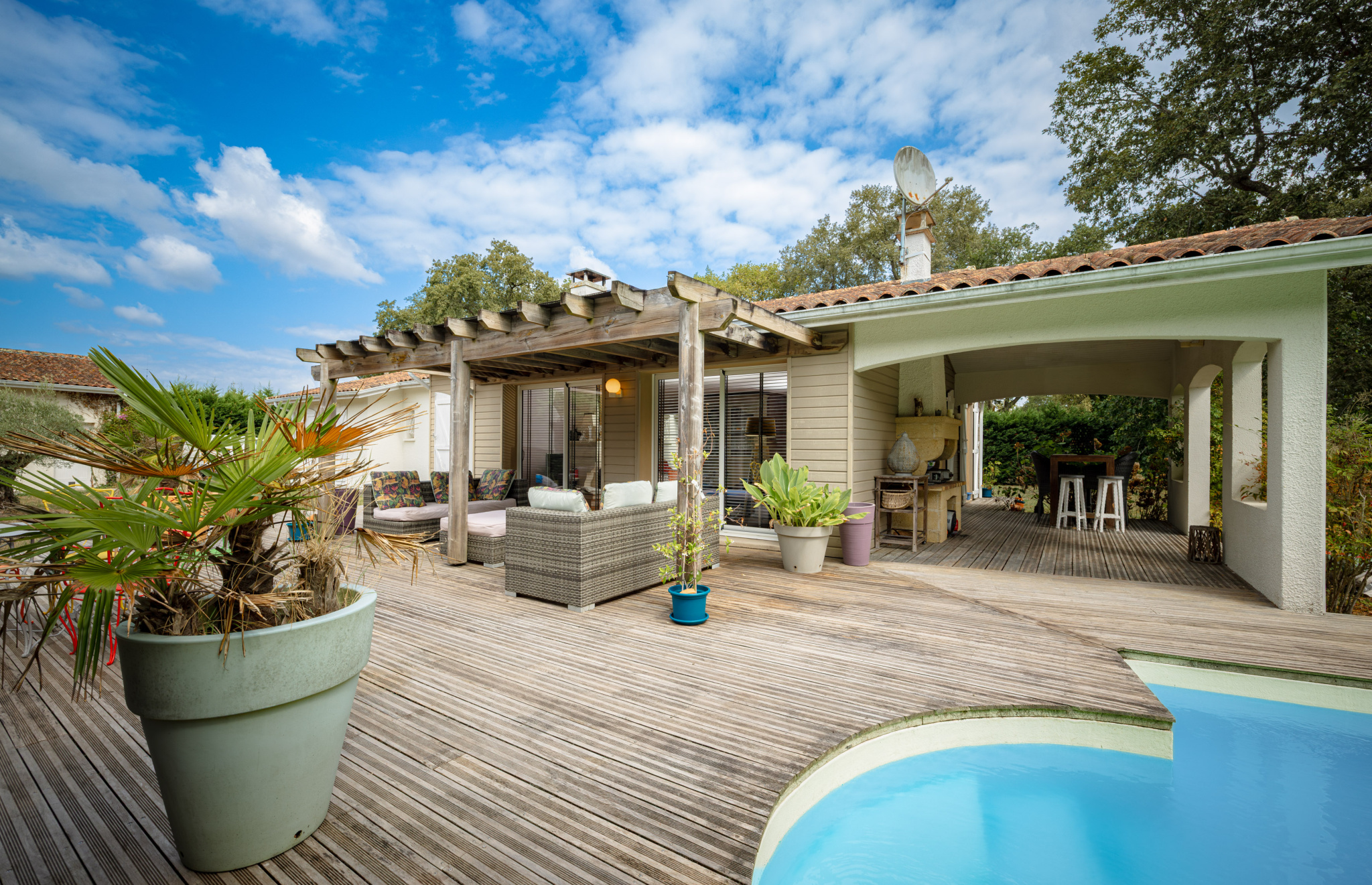 À l'extérieur, vous profiterez d'une piscine chauffée 11 x 5 m entourée d'une grande terrasse aménagée en salon d'été, avec un espace repas couvert de 23 m2 agrémenté d'un barbecue, idéal pour recevoir famille et amis.
