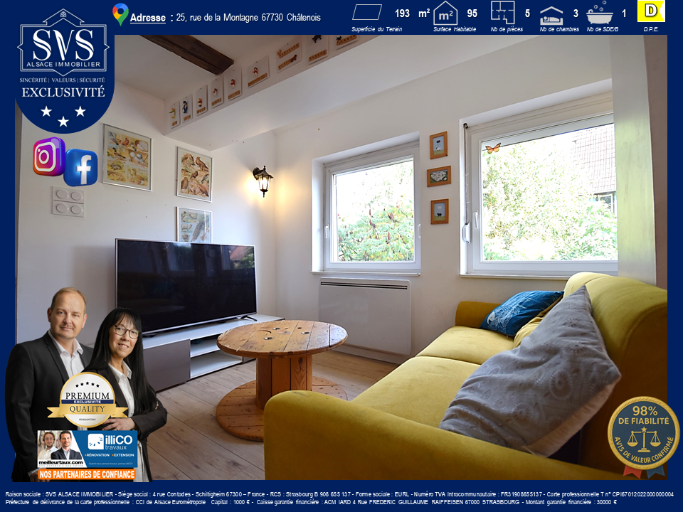 Située au coeur de l'Alsace, dans la charmante commune de Châtenois, cette maison bénéficie d'un cadre de vie agréable entre nature, histoire et commodités. À seulement quelques minutes de Sélestat, Châtenois séduit par son centre historique typique, ses maisons à colombages, ses remparts, et son clocher si reconnaissable. Le village offre toutes les commodités du quotidien : écoles, commerces de proximité, pharmacie, médecin, associations sportives et culturelles, ainsi qu'un accès rapide à la RN83 et à l'autoroute A35, facilitant les déplacements vers Strasbourg, Colmar ou même l'Allemagne.