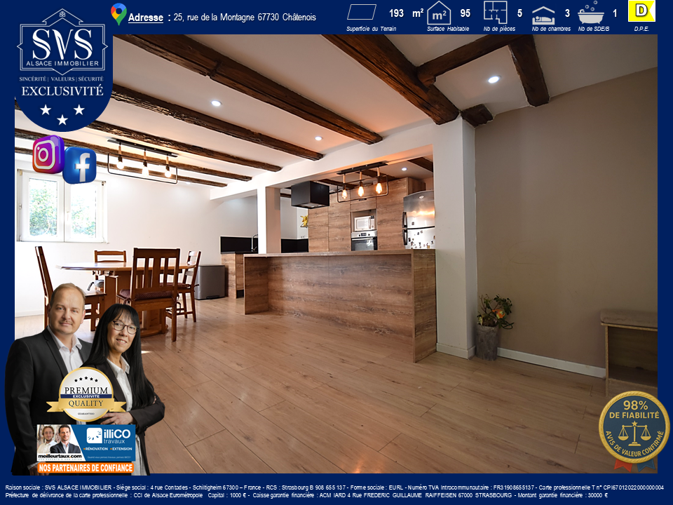 Raison sociale : SVS ALSACE IMMOBILIER - Siège social : 4 rue Contades - Schiltigheim 67300 France RCS : Strasbourg B 908 655 137 - Forme sociale : EURL - Numéro TVA Intracommunautaire : FR31908655137 - Carte professionnelle T no CPI67012022000000004 Préfecture de délivrance de la carte professionnelle : CCI de Alsace Eurométropole Capital : 1000 EUR - Caisse garantie financière : ACM IARD 4 Rue FREDERIC GUILLAUME RAIFFEISEN 67000 STRASBOURG - Montant garantie financière : 30000 EUR.