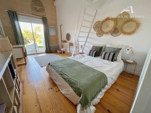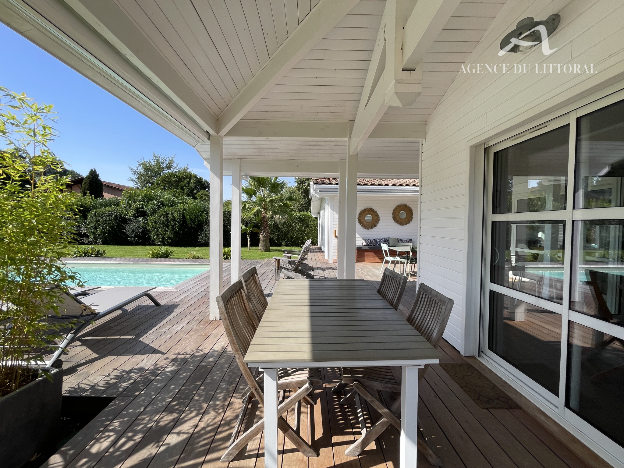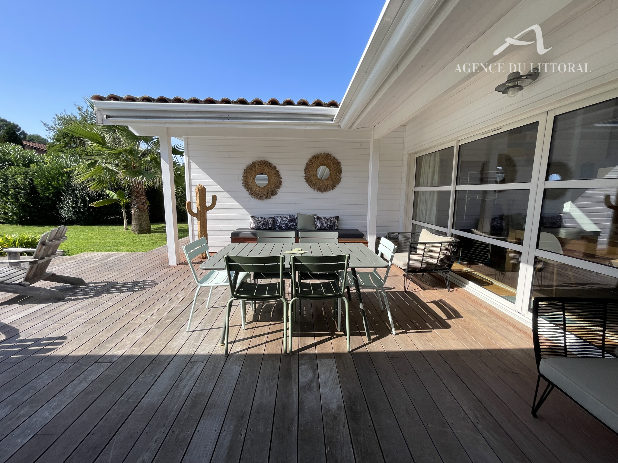 L'Agence du Littoral vous propose cette superbe Villa d'architecte construite en ossature bois en 2011 d'une surface totale d'environ 184 m2 avec une vue imprenable sur la pinède. Elle se compose d'une entrée, un vaste salon-séjour lumineux avec de belles hauteur de plafond, une cheminée insert pour les longues soirées d'hiver, une spacieuse cuisine entièrement équipée avec son coin repas ouvert sur la pièce à vivre, un cellier/buanderie, un wc indépendant, trois chambres dont une suite parentale avec salle de bains plus douche et dressing. À l'étage, vous trouverez un espace bureau, une chambre supplémentaire avec sa salle d'eau et wc. Vous serez séduit par son incroyable emplacement offrant calme et sérénité. Pour finir la propriété de 1045 m2 se compose d'un jardin clos et paysagé équipée d'un grand carport, un abri bois type cabane, une piscine chauffée de 9x3 avec volet roulant immergé entourée d'une grande terrasse bois en ipé. Coup de coeur pour cette villa aux prestations de qualité.