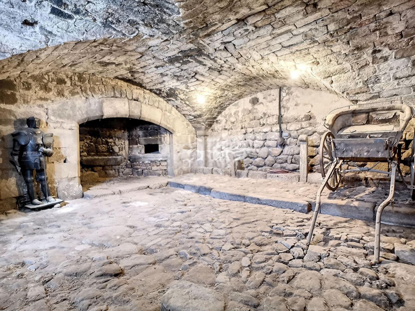 - Au rez de chaussée, une grande écurie avec un superbe plafond voûté en pierres de taille, 3 caves en voûte tout aussi splendides, une immense cheminée d'époque, une entrée avec la porte d'accès du seigneur en bas des escaliers en vis, ainsi que le cachot et les oubliettes Le tout pour une superficie de 200 M²