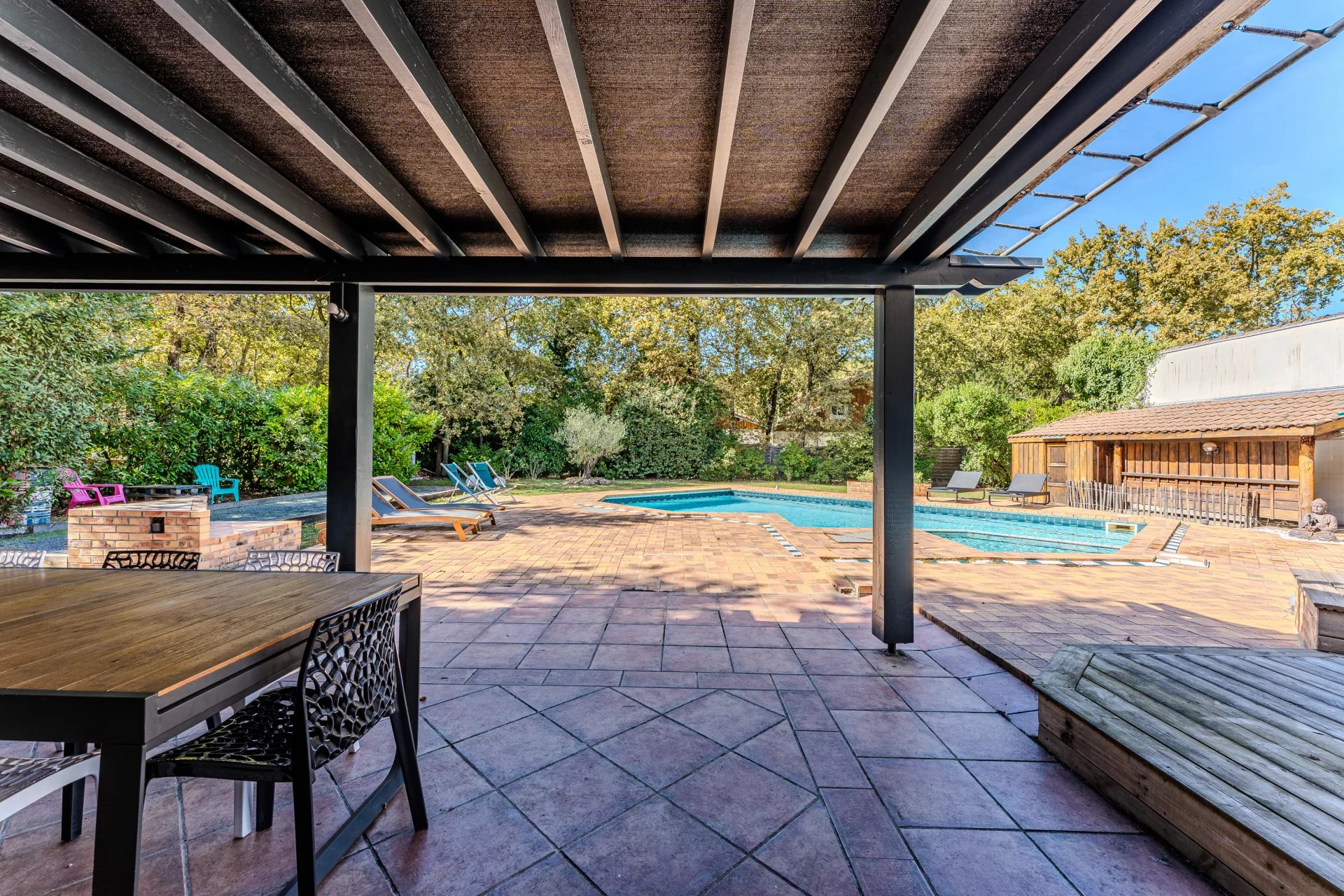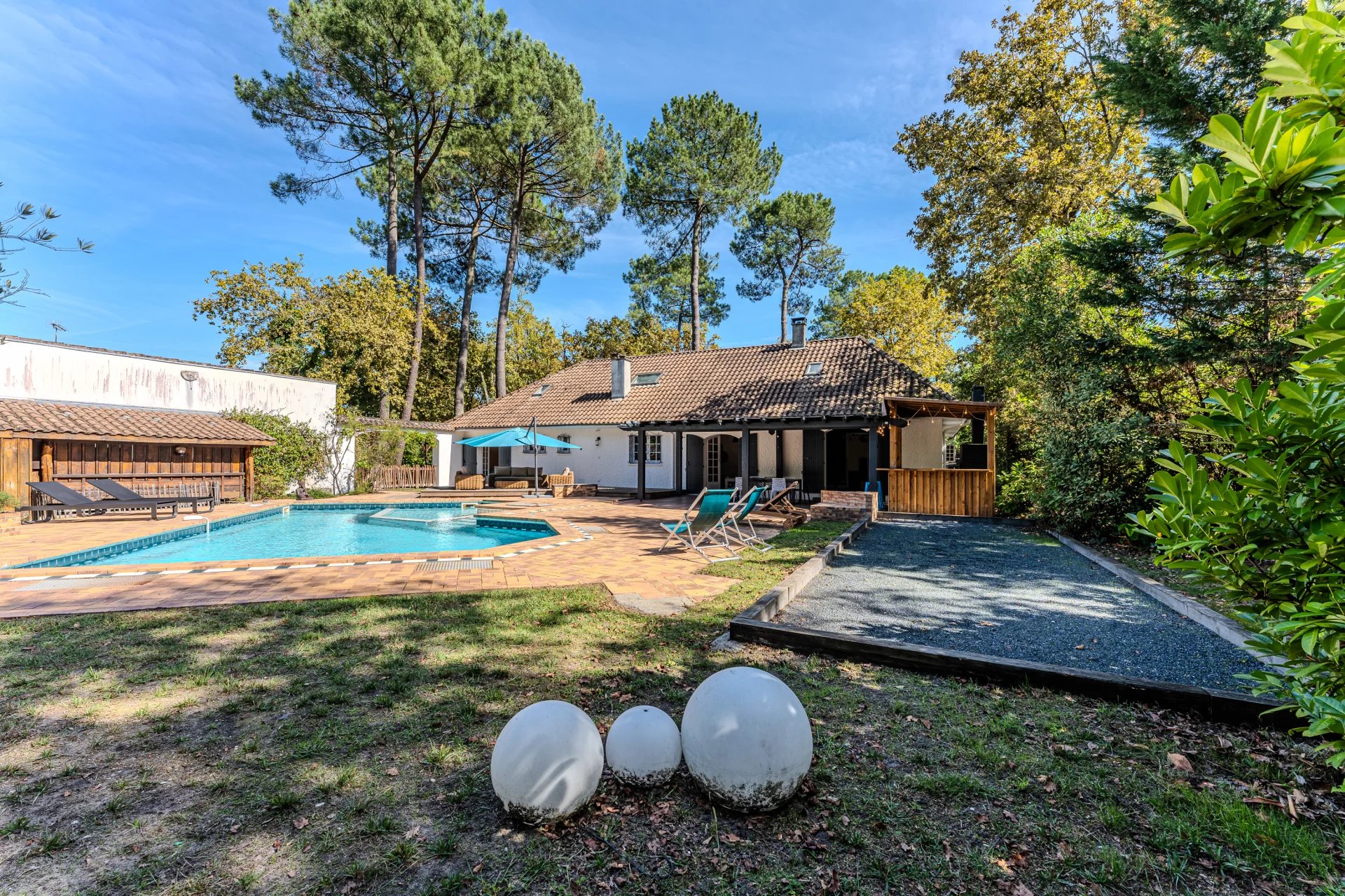 Découvrez cette magnifique maison familiale située à Cestas, nichée dans un cadre enchanteur entouré de chênes, offrant un calme absolu. Ce bien exceptionnel se trouve sur un vaste terrain, parfait pour ceux qui recherchent espace et tranquillité. La maison dispose d’un spacieux séjour/salle à manger de plus de 60m² qui invite à la convivialité, parfait pour recevoir famille et amis. Une magnifique cheminée avec poêle à bois double combustion offre chaleur et charme. La cuisine familiale est idéale pour préparer de délicieux repas en toute simplicité. Avec ses cinq chambres, chacun trouvera son espace personnel. Une salle de jeu, un bureau et un autre salon à l’étage complètent cet intérieur chaleureux, répondant aux besoins des petits comme des grands. À l’extérieur, profitez d’une belle piscine pour vous rafraîchir durant les chaudes journées d’été. La pergola et la cuisine d'été sont parfaites pour organiser des barbecues et repas en plein air. Le boulodrome réalisé pour les passionnés de pétanque ajoute une touche de loisir supplémentaire. Le vaste terrain arboré de plus de 1800m² sans vis-à-vis assure une intimité totale. Vous trouverez enfin un appentis, un garage de 46 m², et une belle cave avec régulation hygrométrique idéale pour les amateurs de vin. La maison est équipée de climatisation dans l'ensemble pour un confort optimal en toutes saisons. Cette demeure a été parfaitement entretenue et est prête à accueillir une nouvelle famille. Ne manquez pas cette opportunité unique de vivre dans un cadre idyllique à Cestas. Des services de transports scolaires sont disponibles pour faciliter l'accès aux différents établissements éducatifs de la ville La ville de Cestas offre un bon réseau scolaire et de transports, facilitant l'accès aux établissements d'enseignement pour les élèves. Les infrastructures de transport, qu'elles soient en bus, en train ou en voiture, assurent une connexion efficace à la métropole de Bordeaux et ses environs. Montant estimé des dépenses annuelles d'énergie pour un usage standard : entre 2 540 Euros et 3 520 Euros par an. Prix moyens des énergies indexés sur les années 2021/2022/2023 (abonnements compris). Honoraires charge vendeur inclus dans le prix Les informations sur les risques auxquels ce bien est exposé sont disponibles sur le site Géorisques : www.georisques.gouv.fr