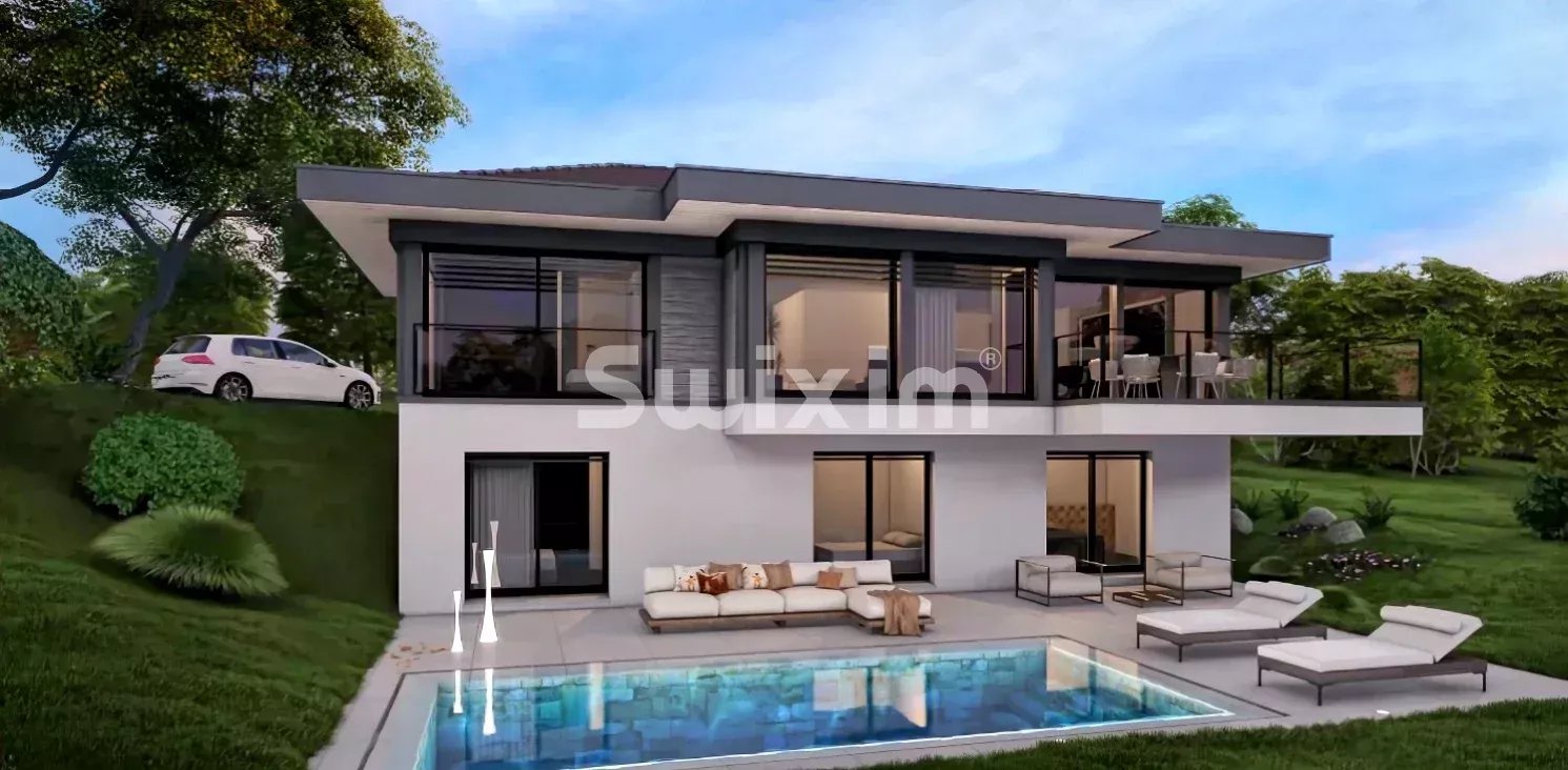REF 195aRS: Exclusivité SWIXIM Vivez l’exception à quelques pas de Genève Découvrez cette somptueuse villa contemporaine signée EDEN HOME, idéalement située à Collonges-sous-Salève, à seulement 5 minutes de la frontière Suisse et 20 minutes de l’aéroport international de Genève. Érigée dans un écrin de verdure, cette propriété d’exception de 168 m² habitables prend place sur un terrain paysager de 1302 m². Elle allie avec raffinement lignes architecturales modernes, prestations haut de gamme et cadre de vie privilégié. La villa bénéficie d’une vue dégagée sur le bassin Genevois et la chaîne du Jura, dans un environnement paisible, prisé pour sa proximité avec Genève et la qualité de son cadre naturel. L’intérieur séduit par ses volumes généreux et sa luminosité exceptionnelle, notamment grâce à de grandes baies vitrées, équipées de brise-soleil orientables pour un confort thermique optimal en toute saison. Le séjour de plus de 50 m² offre un espace de vie convivial et élégant, ouvert sur l’extérieur. Côté nuit, la maison dispose de trois belles chambres, ainsi qu’une suite parentale avec salle d’eau privative et dressing. Un garage double complète les prestations de cette villa à l’architecture résolument contemporaine. Un bien rare à découvrir sans attendre Agent commercial indépendant Swixim sur votre secteur : +33634410719 Stephany ROLANCY - Agent commercial - EI - RSAC 939 372 818 / Annecy