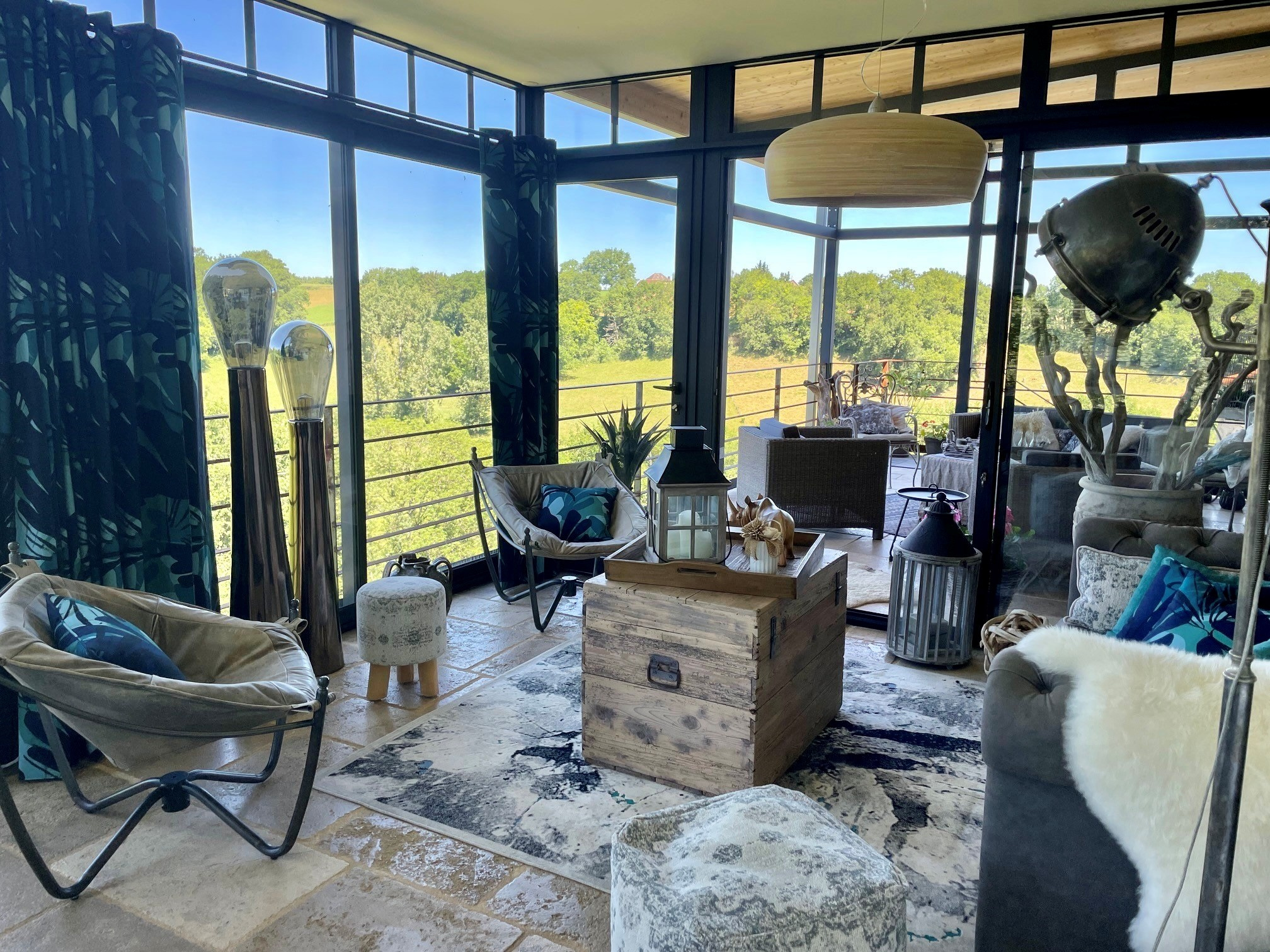 Un salon d'été lumineux avec baies vitrées ouvrant sur l'extérieur