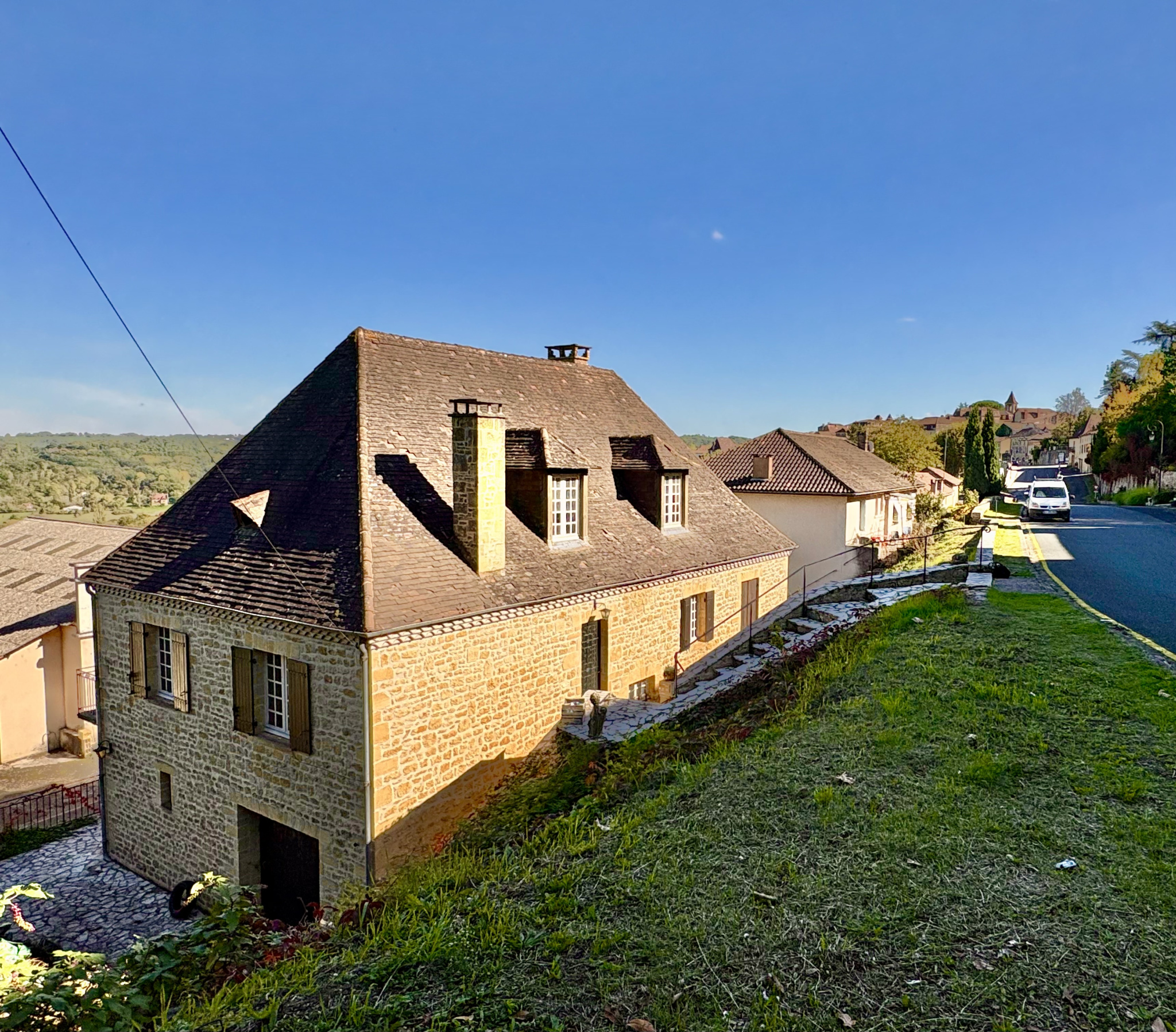 Perchée sur une petite butte, à l'intersection de deux rues, cette maison bénéficie d'une double accessibilité idéale :