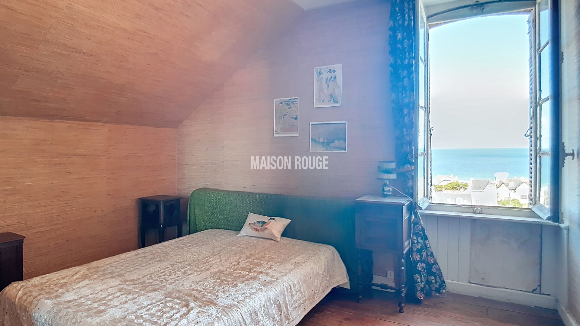 -EN EXCLUSIVITE MAISON ROUGE- Située au coeur de la prestigieuse station balnéaire du Val André et en surplomb de la mer, cette villa emblématique en pierres et briques rouges offre un cadre de vie absolument unique. Véritable propriété de caractère à rénover, elle révèle un potentiel rare, sublimé par une architecture authentique et un emplacement exceptionnel, offrant une vue à couper le souffle sur la baie de Saint-Brieuc. Implantée sur un terrain clos de murs en pierre, elle préserve toute son intimité grâce à son jardin plein de charme et sa terrasse exposée sud-est, propice aux instants de détente en extérieur. Dès les premières marches, l'entrée annonce le ton : parquet d'origine, hauteur sous plafond de plus de 3 mètres, volumes généreux. La vaste pièce de vie, baignée de lumière, s'ouvre sur une vue panoramique imprenable sur la mer. Elle se compose d'un salon élégant avec cheminée en marbre et d'un séjour attenant. Une cuisine indépendante bénéficie également d'un accès direct à la terrasse et au charmant jardin. Une salle d'eau et des WC indépendants complètent ce niveau. Un bel escalier en bois mène aux étages, chacun accueillant quatre chambres, soit huit au total. Toutes disposent d'un cabinet de toilette privatif et offrent de splendides volumes, sublimées par des vues mer à couper le souffle pour quatre d'entre elles. Un garage indépendant et une cave surélevée viennent compléter cet ensemble d'exception. Une opportunité unique d'acquérir l'une des villas les plus remarquables du Val André, à repenser et à personnaliser selon vos envies, dans un environnement privilégié où authenticité et panorama marin se rencontrent. Prix FAI : 995 600 euros dont 4.80 % honoraires TTC à la charge de l'acquéreur. Laure PENAULT (EI) Agent Commercial - Numéro RSAC : 897 819 025 - SAINT BRIEUC.