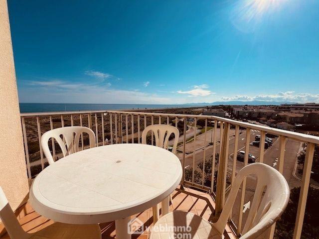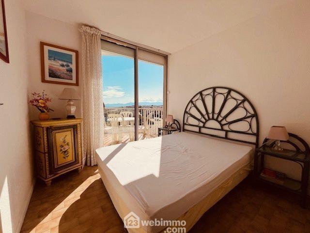 Superbe vue depuis ce T2 CABINE : séjour cuisine donnant sur terrasse vue mer, chambre avec sa terrasse vue mer et montagne, large cabine, salle d'eau et WC indépendant.