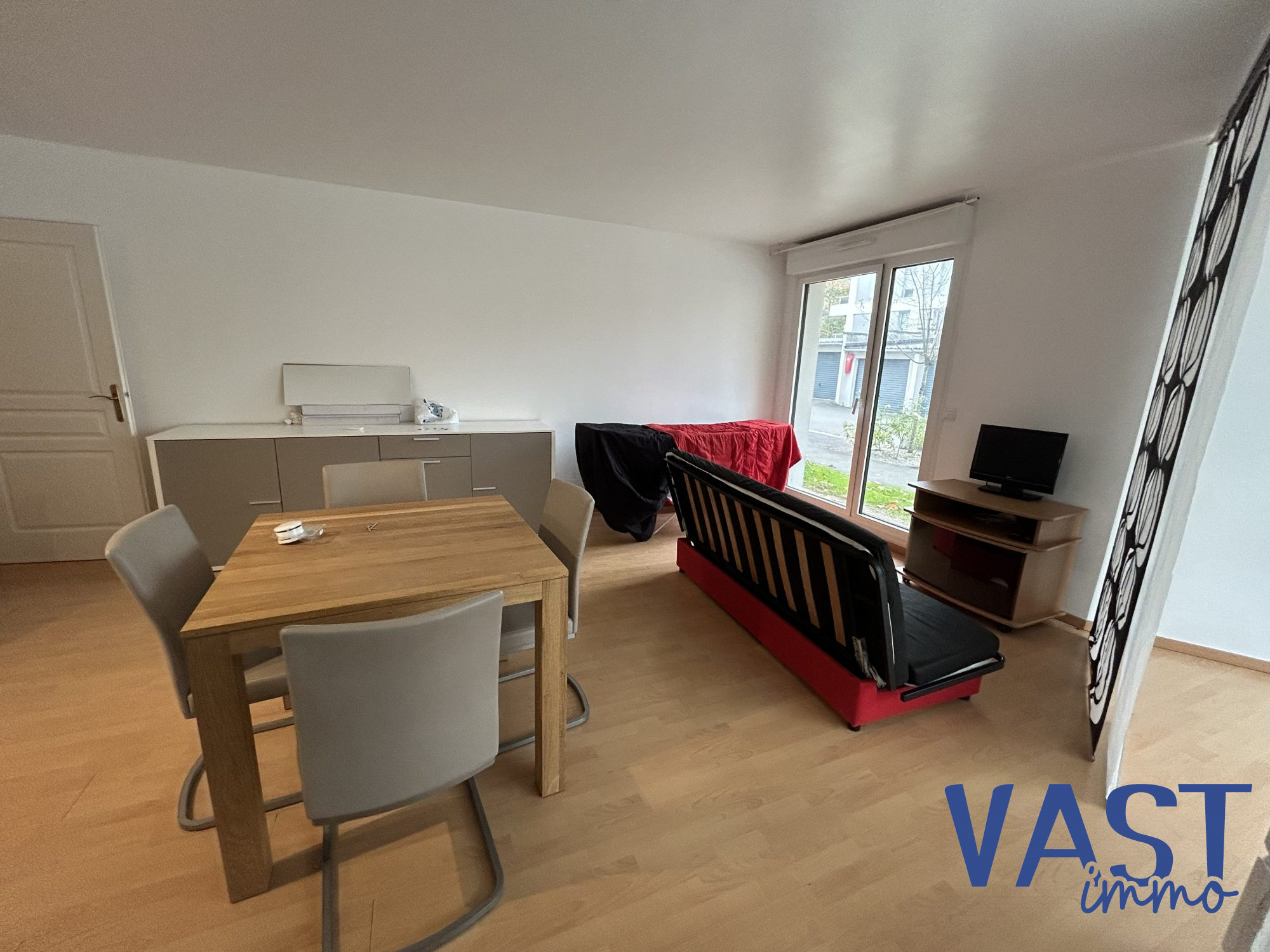 La pièce de vie lumineuse offre un bel espace salon, prolongé par un coin cuisine entièrement équipé. La salle de bain dispose d'une baignoire et d'un meuble vasque, tandis qu'un WC indépendant vient compléter l'ensemble.