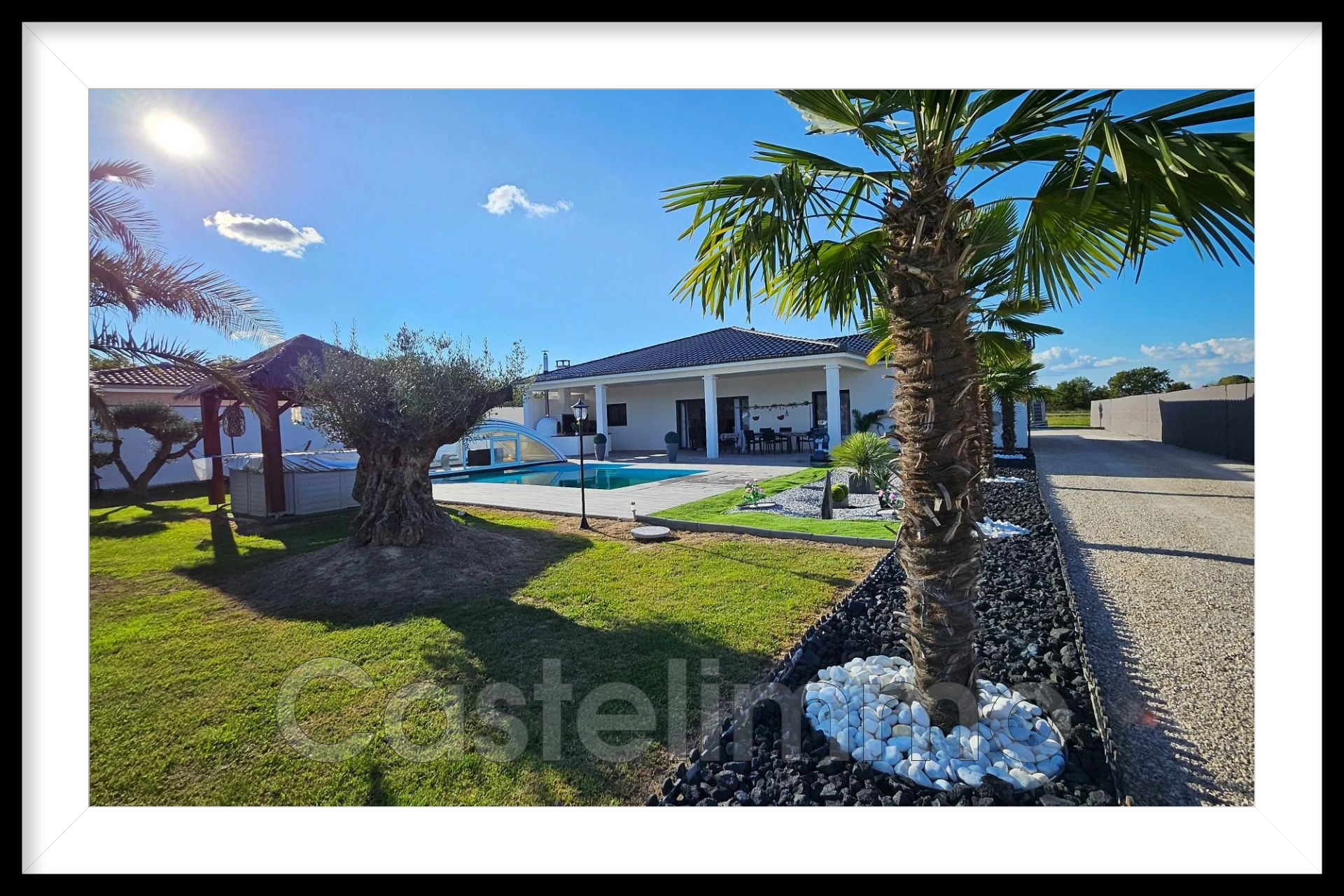Castelsarrasin, proche autoroute et commerces, 20km de Montauban, villa moderne de 2021, de 130m² habitables, plus une salle de sport de 35m², pouvant être utilisée comme quatrième chambre. Elle bénéficie d'une parcelle de 2000m² superbement aménagée, jacuzzi 6 places, piscine avec dôme, palmiers, oliviers, terrasse avec barbecue de plus de 50m² couverte. Deux garages dont un pour camping-car. À l'intérieur, magnifique pièce de vie avec baies vitrées à galandages en vis-à-vis, cuisine entièrement équipée, ilôt central avec cave à vin, trois chambres dont une avec dressing et coin bureau, superbe salle de bains balnéo et douche, double vasques, marbre ocre.