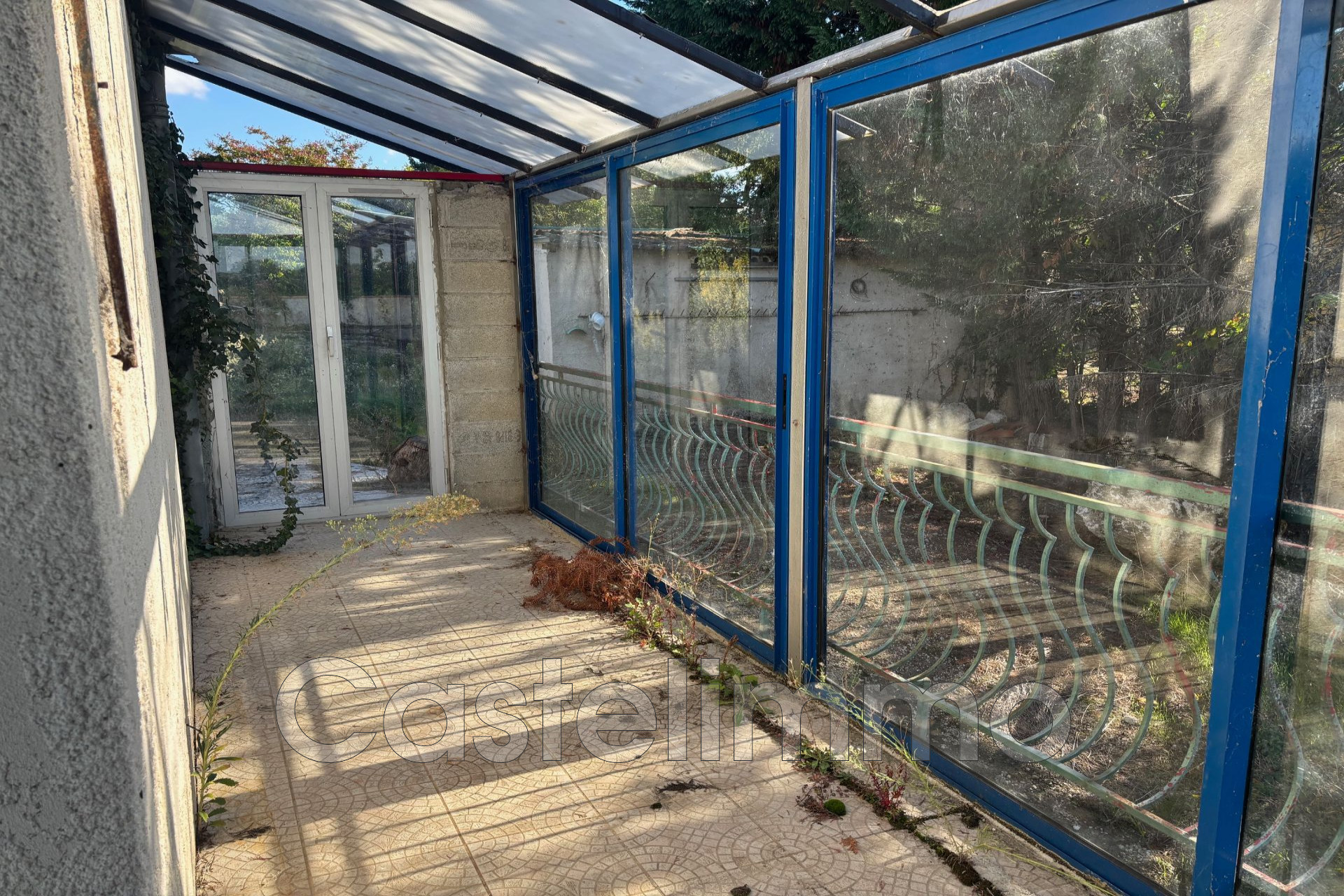 La maison mitoyenne d'un côté se compose d'une entrée/véranda de 10m², un salon avec cheminée de 35m² et une cuisine équipée de 13m².