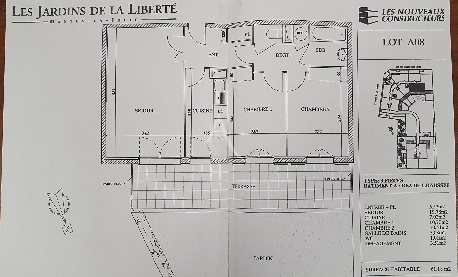 Exclusivité l'Adresse ! Mantes la Jolie, à 600 mètres de la gare et au calme, notre agence l'Adresse vous propose de venir découvrir cet appartement de 3 pièces en bon état général avec une terrasse et un jardin privatif de 60 m². Situé au sein d'une copropriété de standing construite en 2006, sécurisée et bien entretenue, cet appartement bien agencé vous propose une entrée avec rangements, une cuisine indépendante (possibilité d'ouvrir sur le salon) avec accès à la terrasse, un salon ouvert lui aussi sur l'extérieur et un coin nuit avec deux chambres, une salle de bains et des toilettes séparées. Deux places de parking en sous-sol complètent ce bien situé à proximité de toutes les commodités; représentant également un bon investissement locatif (loyer 980 euros par mois charges comprises). Compte tenu de la nouvelle réglementation à venir, la valeur simulée du DPE au 01/01/2026 passera en C - 151kw / an Copropriété de 121 lots - dont 55 lots habitation. (Pas de procédure en cours). Charges annuelles : 1678 euros.