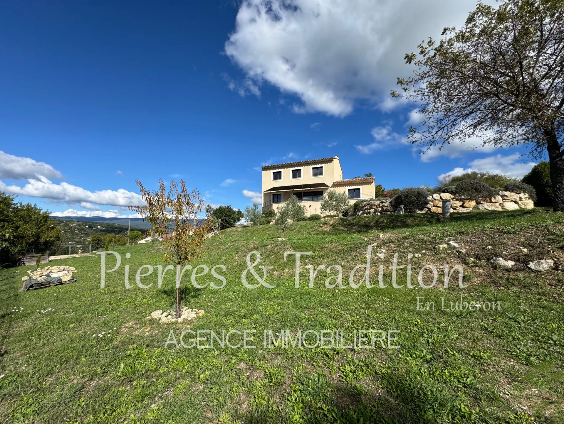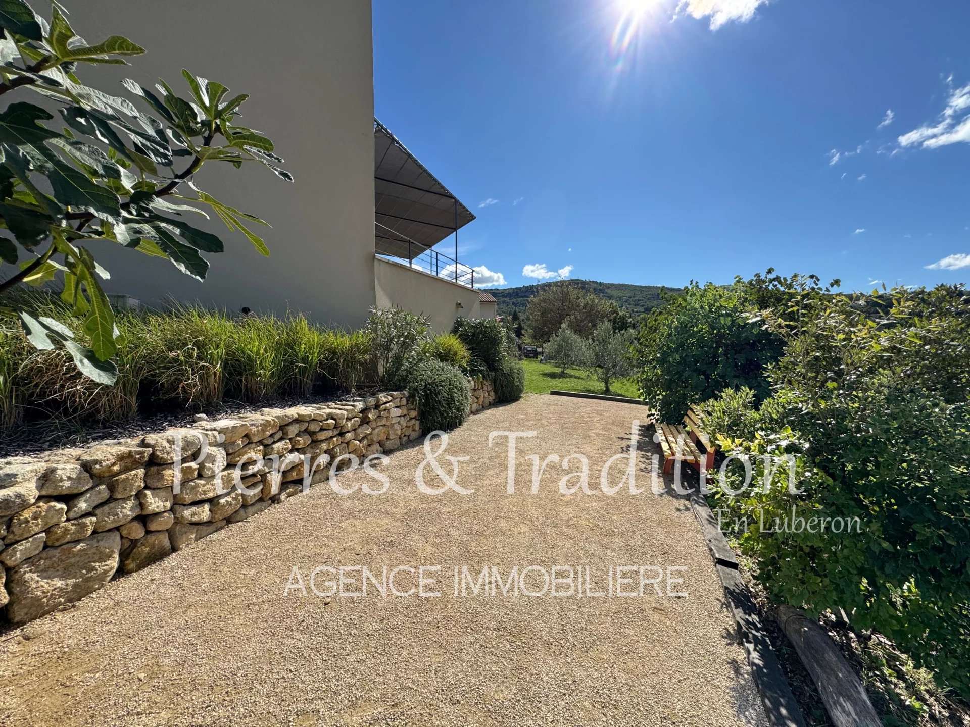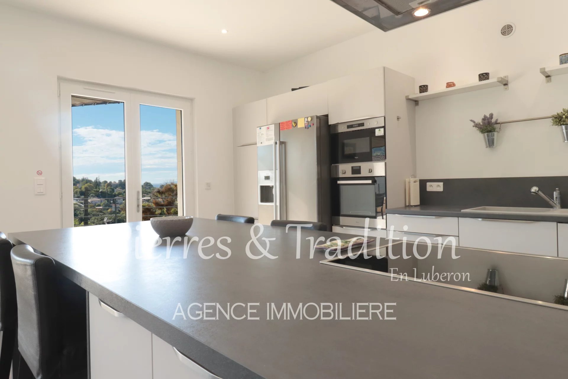 Cette jolie maison se situe à flanc de colline, bénéficiant ainsi d’une très jolie vue. De construction traditionnelle, elle présente le charme du Luberon de part sa typologie de bastide provençale ainsi que ses belles génoises en tuiles anciennes. En rez de chaussée, vous découvrirez un beau séjour avec cheminée et cuisine ouverte donnant sur la grande terrasse avec la vue et sa tonnelle, une chambre principale avec salle d’eau privative et dressing, et à l’étage, trois jolies chambres avec une grande salle de bain. A cela se rajoute un grand cellier et un garage avec porte automatique. En extérieur, l’espace parking pavé nous invite à découvrir les différents espaces avec notamment une belle piscine chauffée avec plage, une terrasse avec vue panoramique, un boulodrome et un jardin de loisir. De très bonne facture, les matériaux sont de qualité et le confort garanti : chauffage réversible au sol par pompe à chaleur, huisseries aluminium, portail automatique, volet roulant immergé pour la piscine, etc. A deux pas de toutes commodités, cette jolie maison présente beaucoup d’atouts !