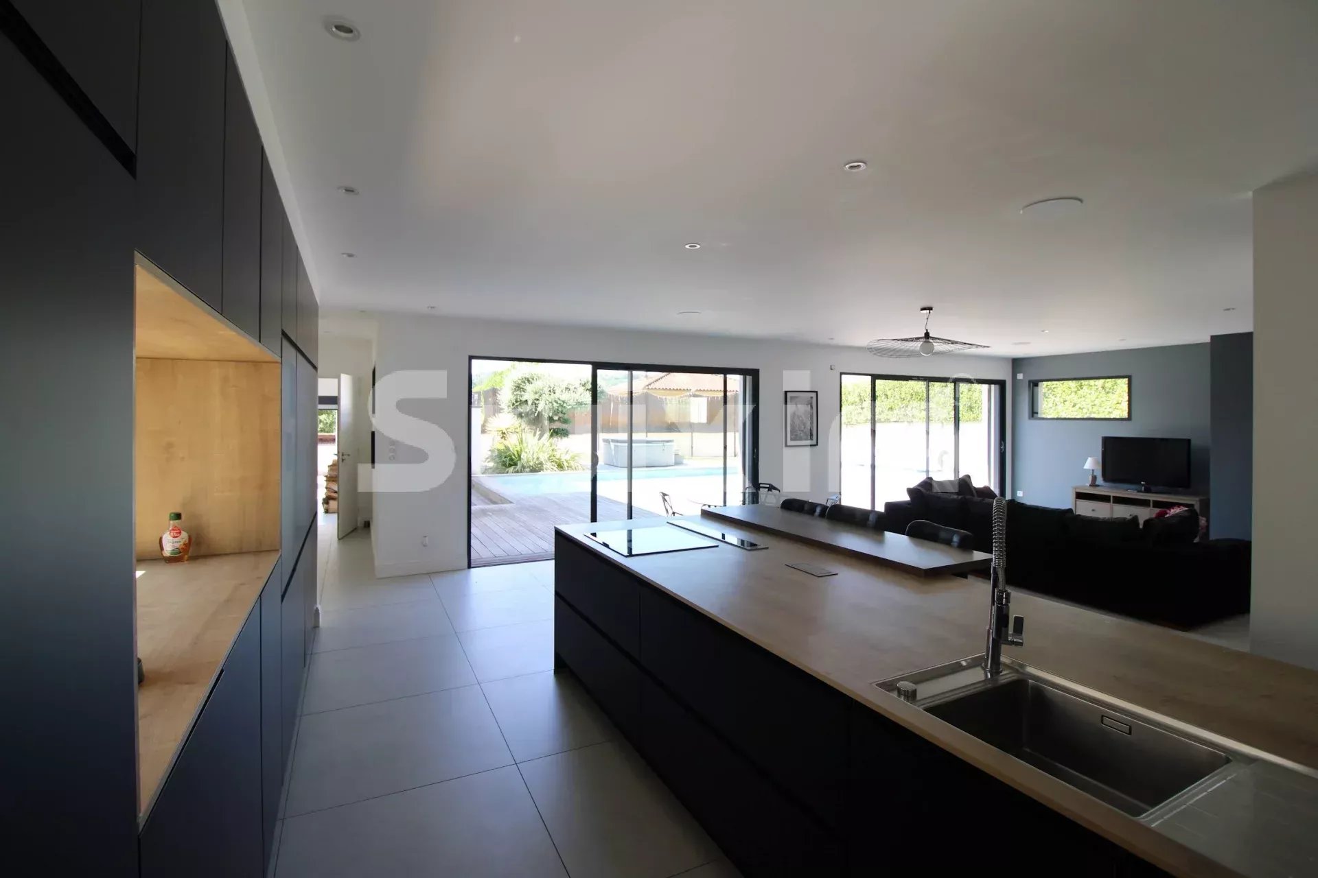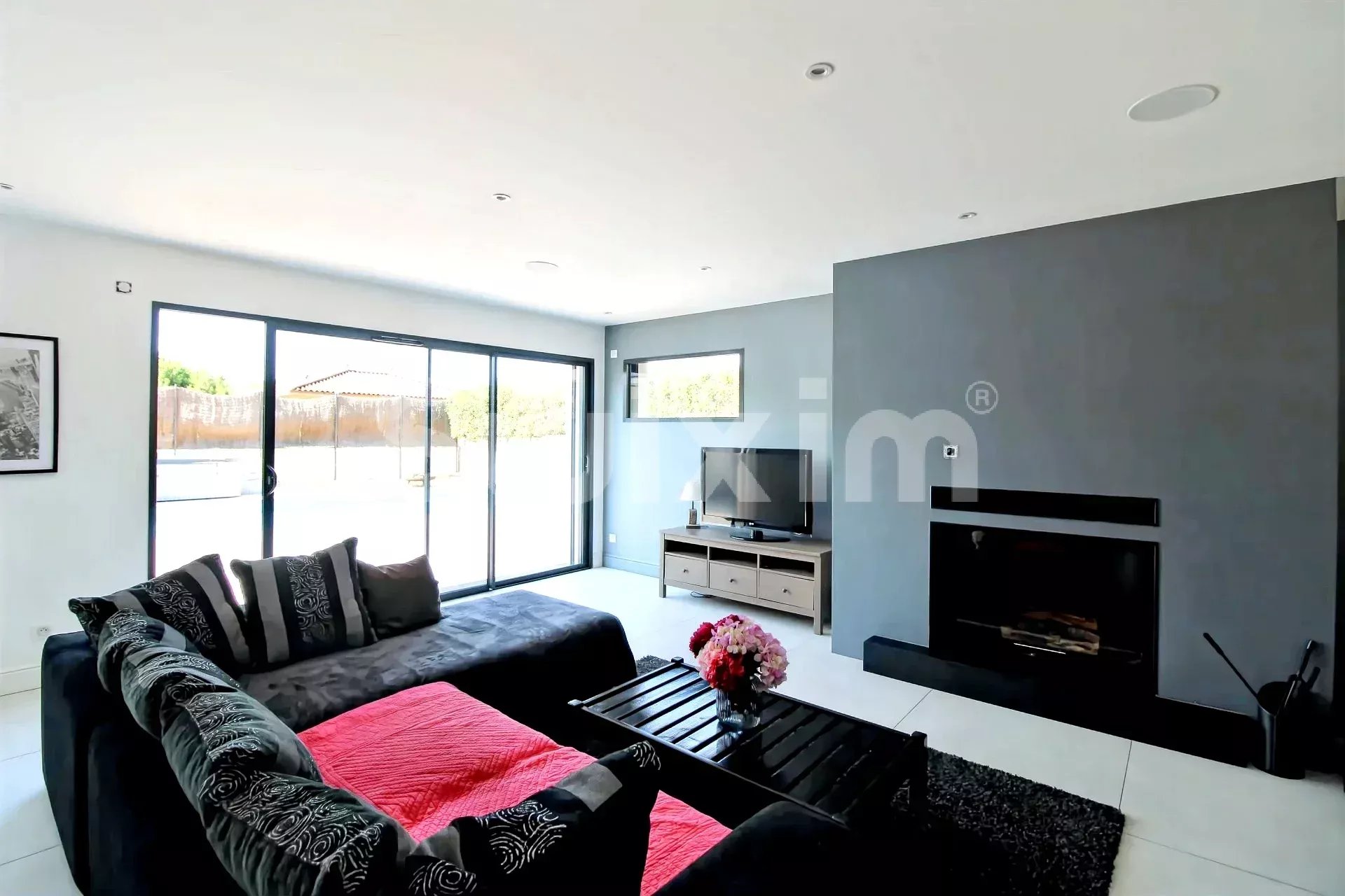 Les grandes fenêtres coulissantes du séjour permettent une luminosité naturelle exceptionnelle. Le salon doté d'une cheminée crée une atmosphère chaleureuse.