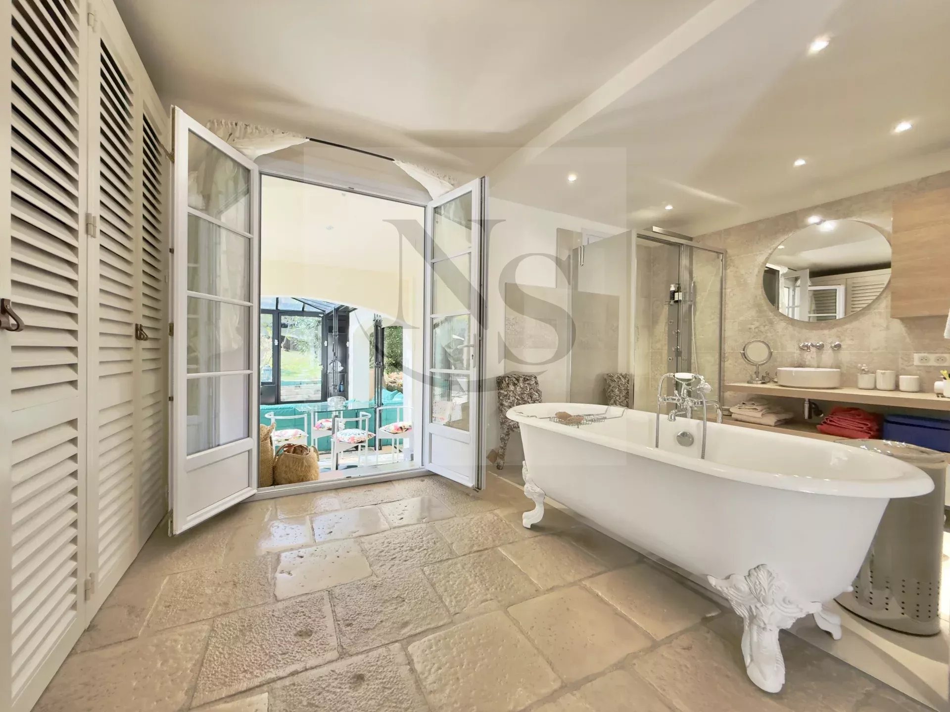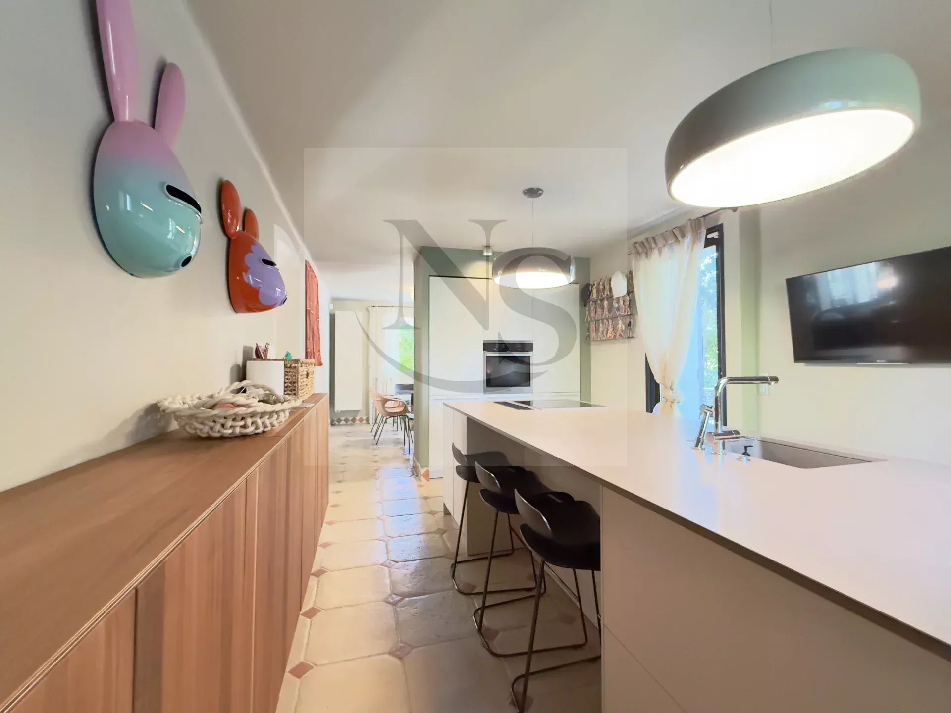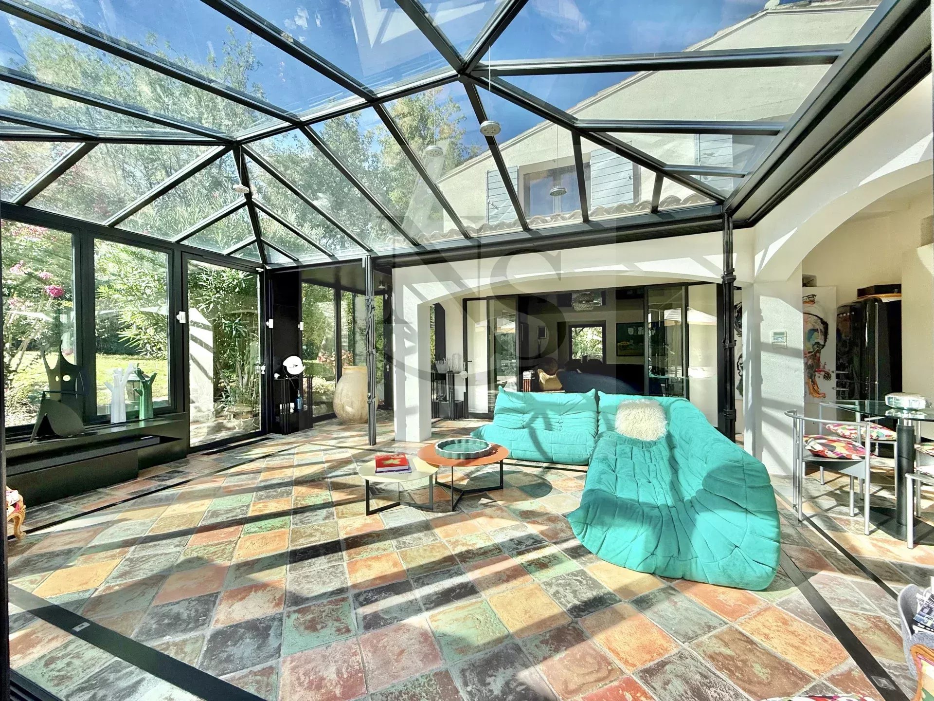 En exclusivité chez Nicolas Staes. Quartier résidentiel du Pont des Trois Sautets, à 5 minutes du Cours Mirabeau. Maison de 250 m² (8 pièces) édifiée sur 1 800 m² de terrain avec piscine chauffée et jardin paysager. Côté nuit : 5 chambres et un bureau, 2 salles de bain, 3 salles de douche. Séjour et salle-à-manger ouverts sur grande véranda et 85 m² de terrasses. Cuisine Bulthaup. Prestations pratiques : double garage, 4 stationnements et grande cave. Climatisation réversible, double vitrage, internet fibre. Environnement calme, commerces/écoles et bus à proximité. Dossier complet sur demande - David Hadida +33 6 19 35 57 98