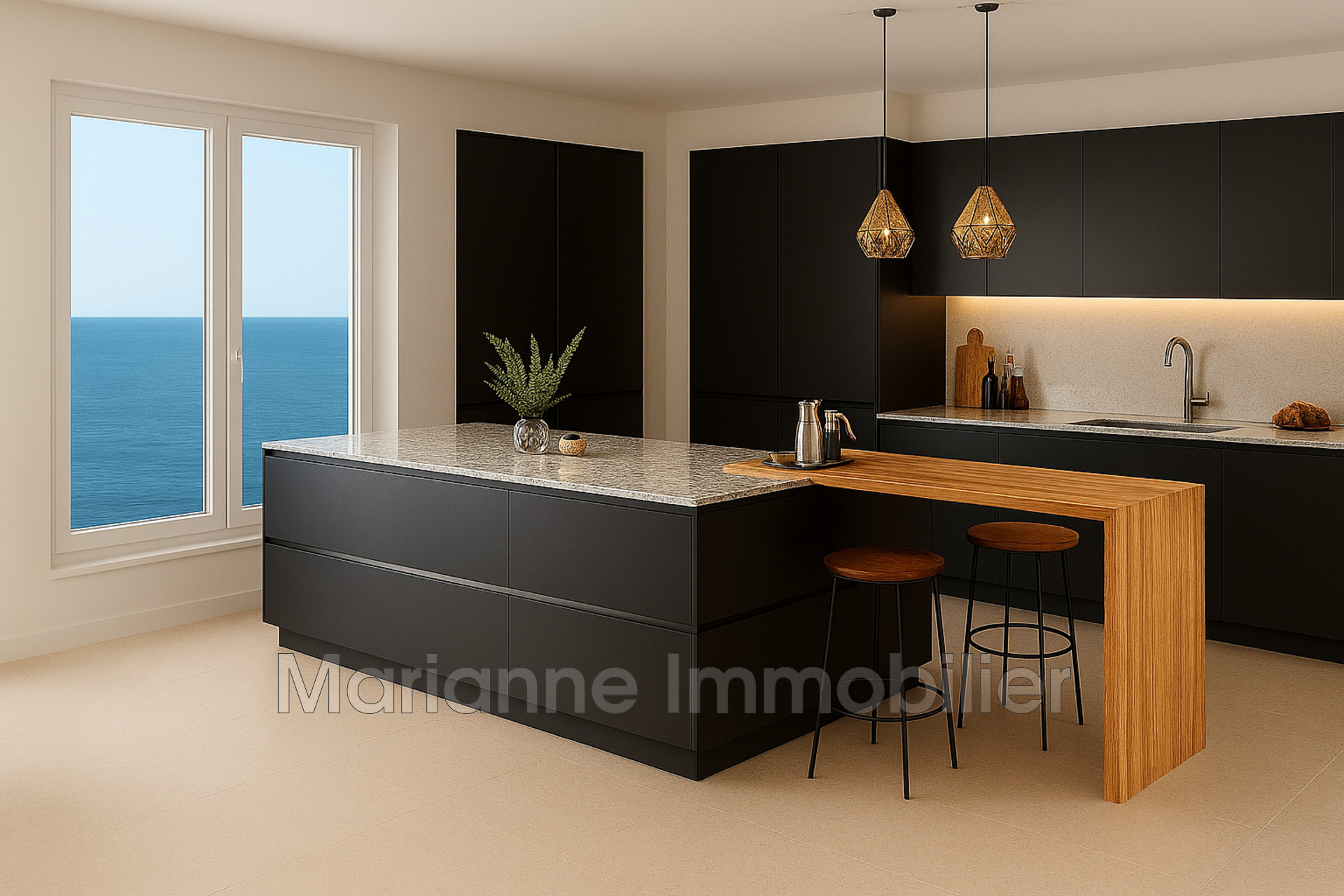 Séjour / Cuisine de 42,90 m² : volumes ouverts et lumineux, offrant un prolongement naturel vers la terrasse par de larges baies vitrées 2 vantaux.
