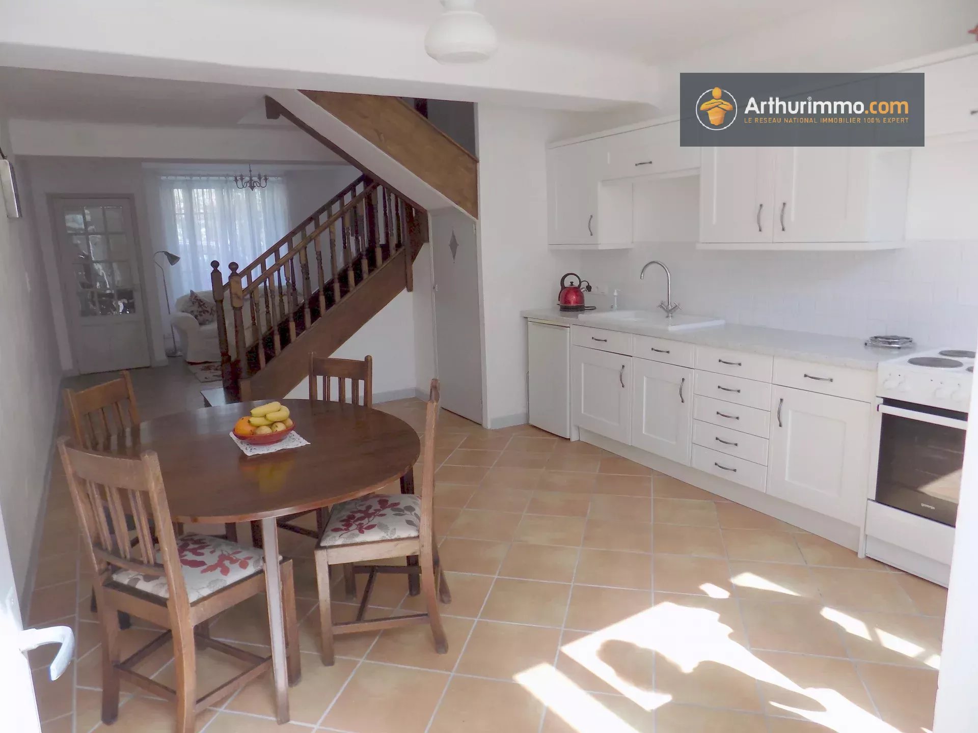- Rez-de-chaussée : Un porche d'entrée donnant accès au salon/cuisine ouvert sur la salle à manger, cette pièce est très lumineuse et aérée, avec un bel escalier qui monte au premier étage.