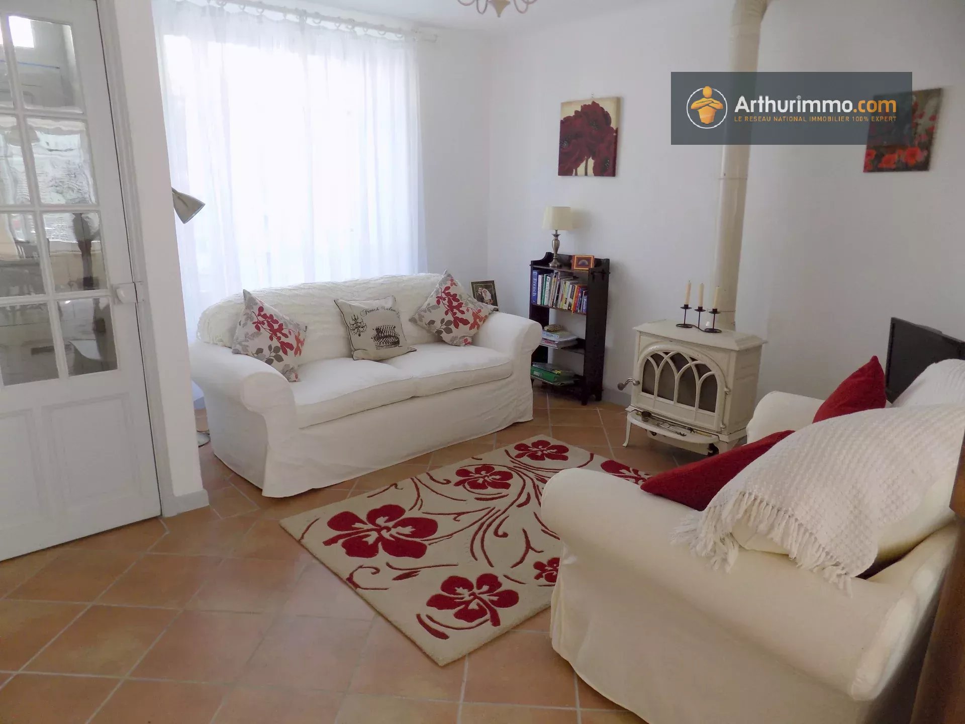 Le coin salon bénéficie d'un poêle à bois et la cuisine a été rénovée. Une porte donne sur la cour arrière.