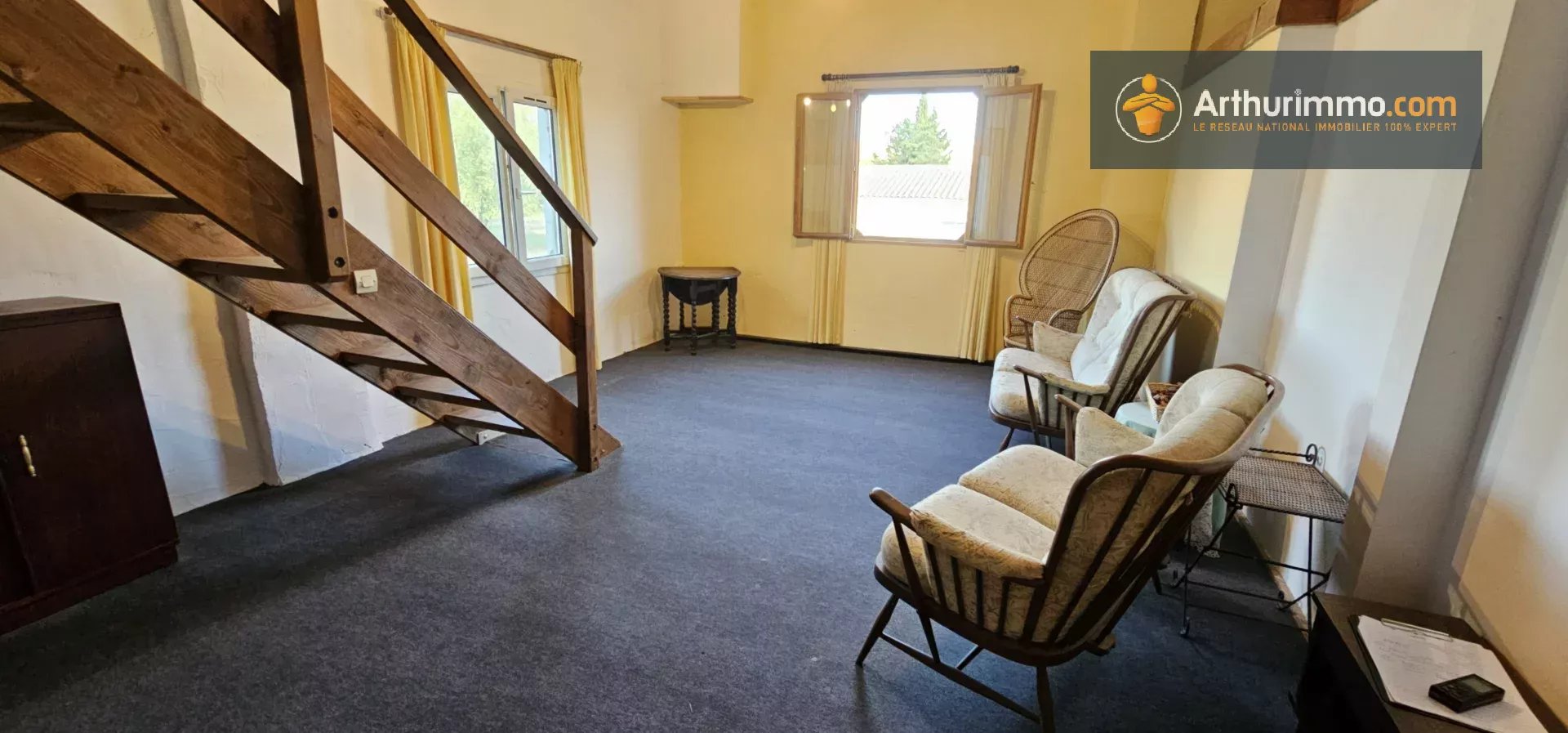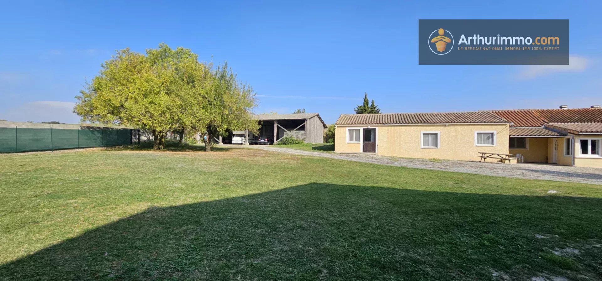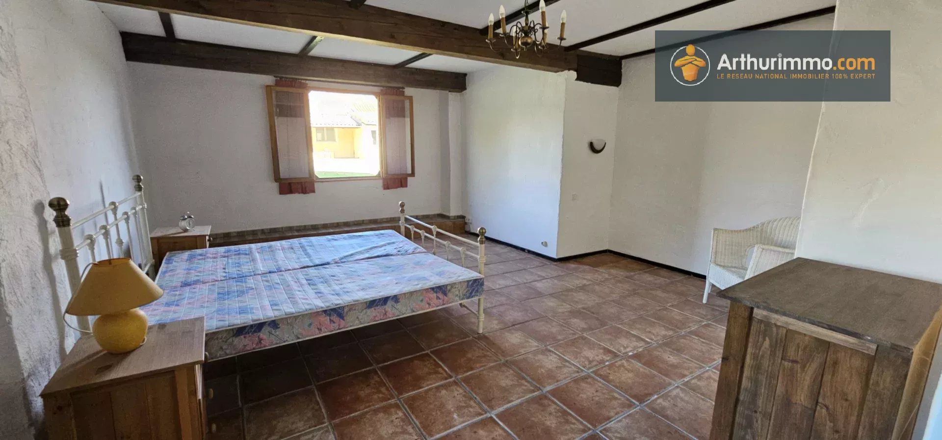 Attenante à ce bâtiment se trouve une grande maison traditionnelle en pierre (450 m² et 128 m²), prête à être rénovée. Idéale pour agrandir votre espace de vie ou de location, elle dispose de deux jardins orientés plein sud avec vue sur les Pyrénées et même d'un petit étang, ce qui ajoute au charme et à la tranquillité de la propriété.
