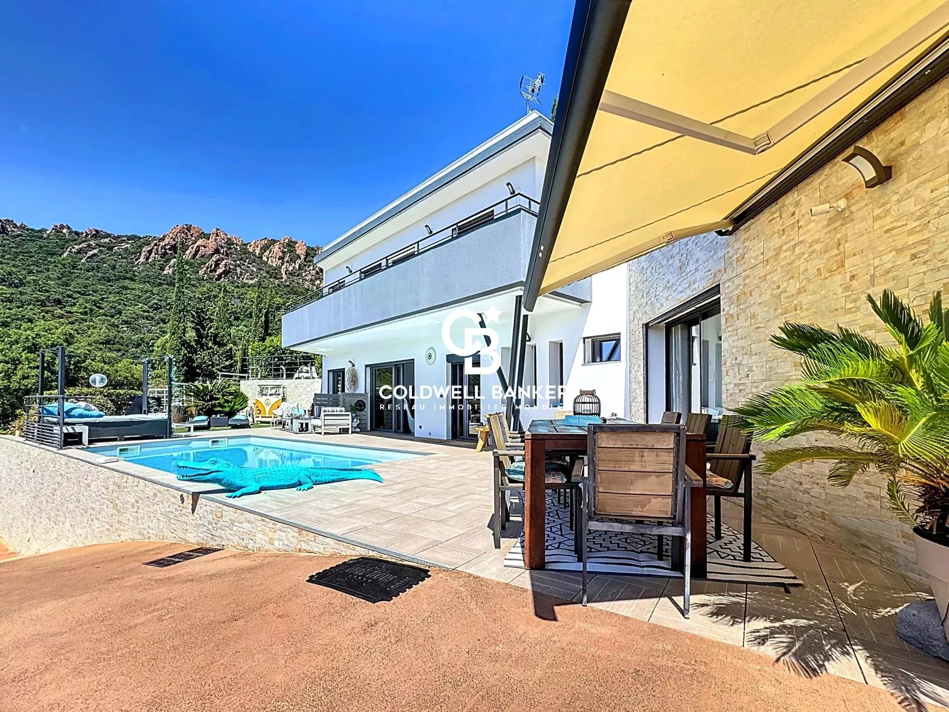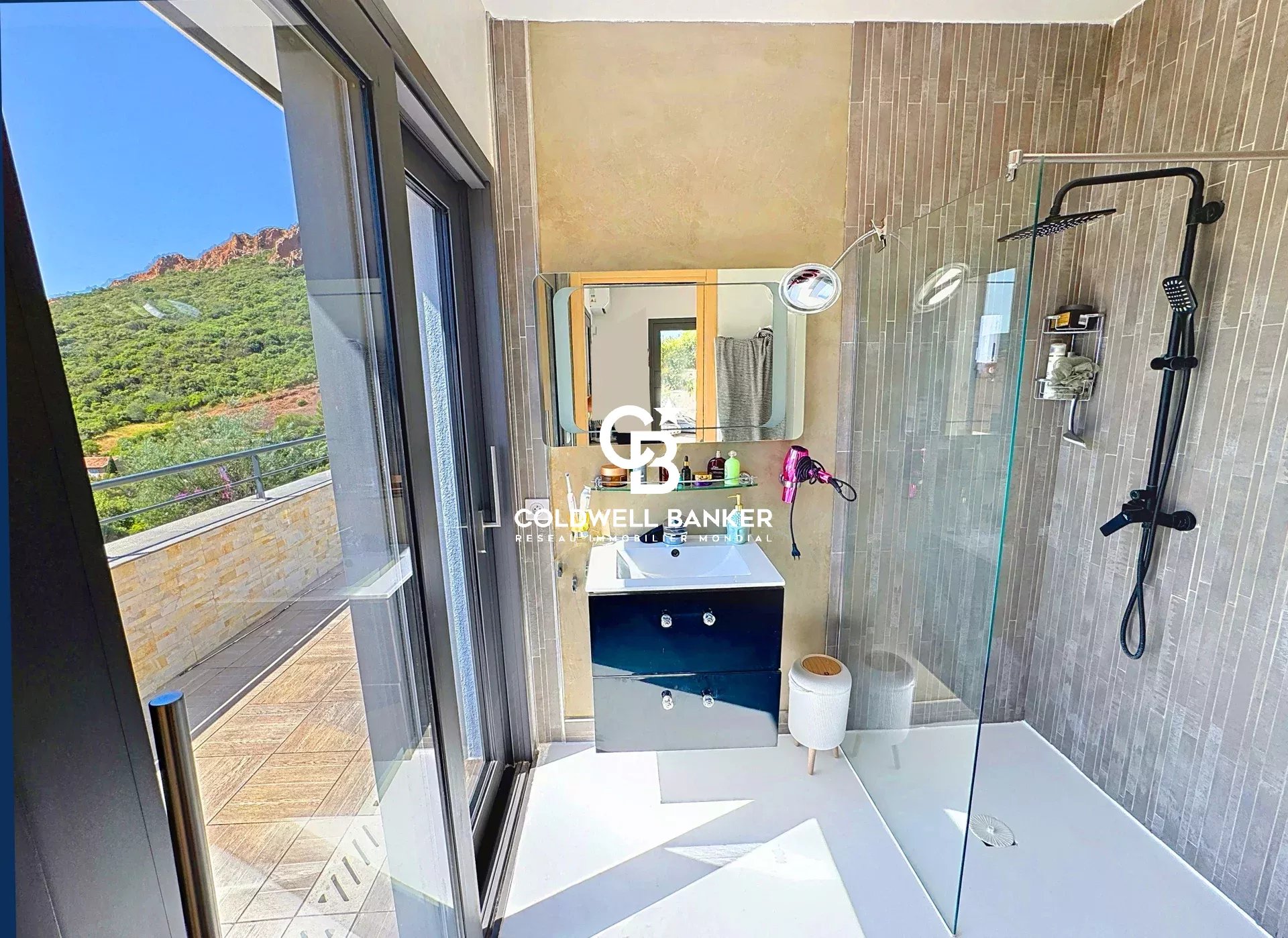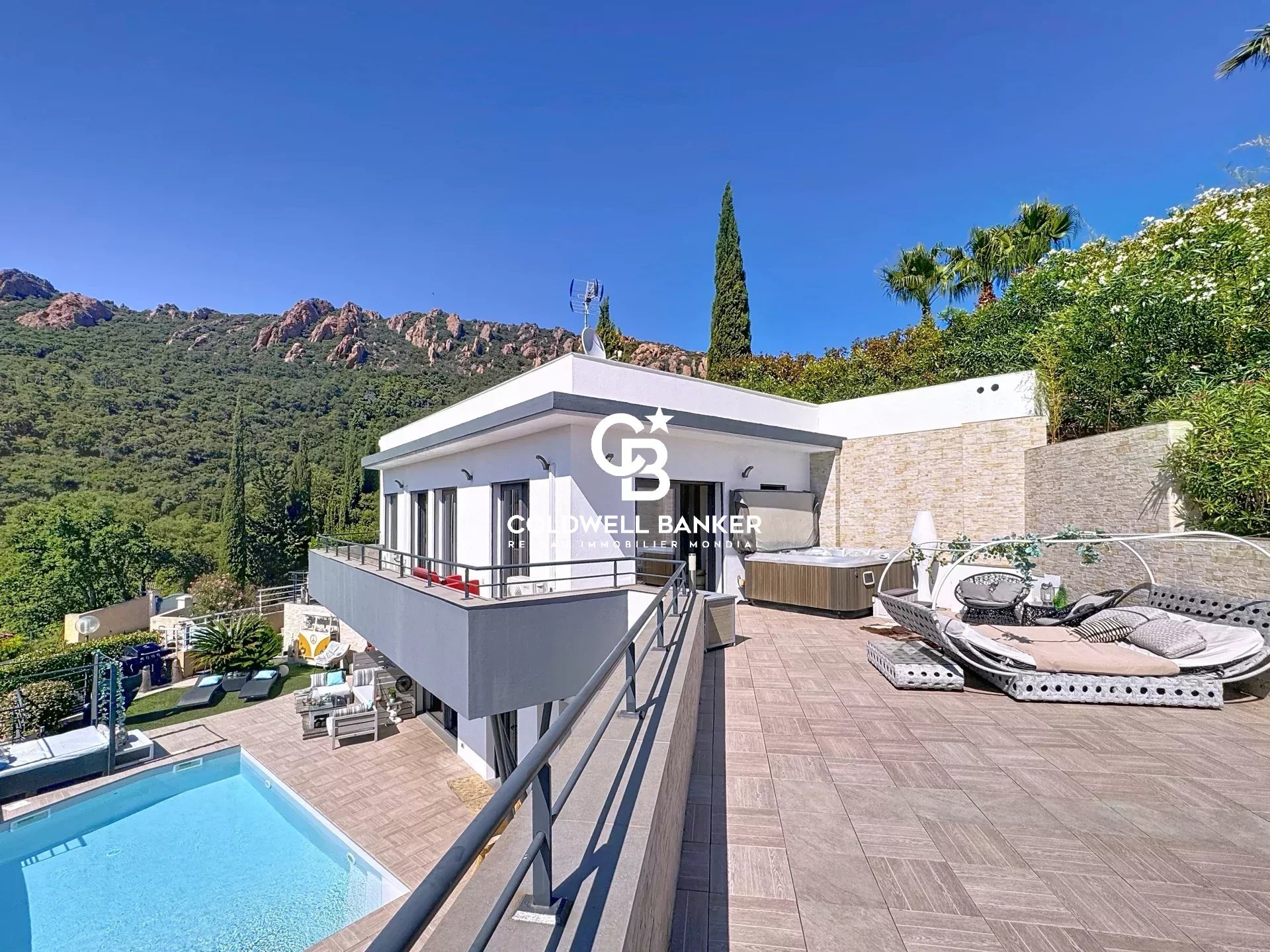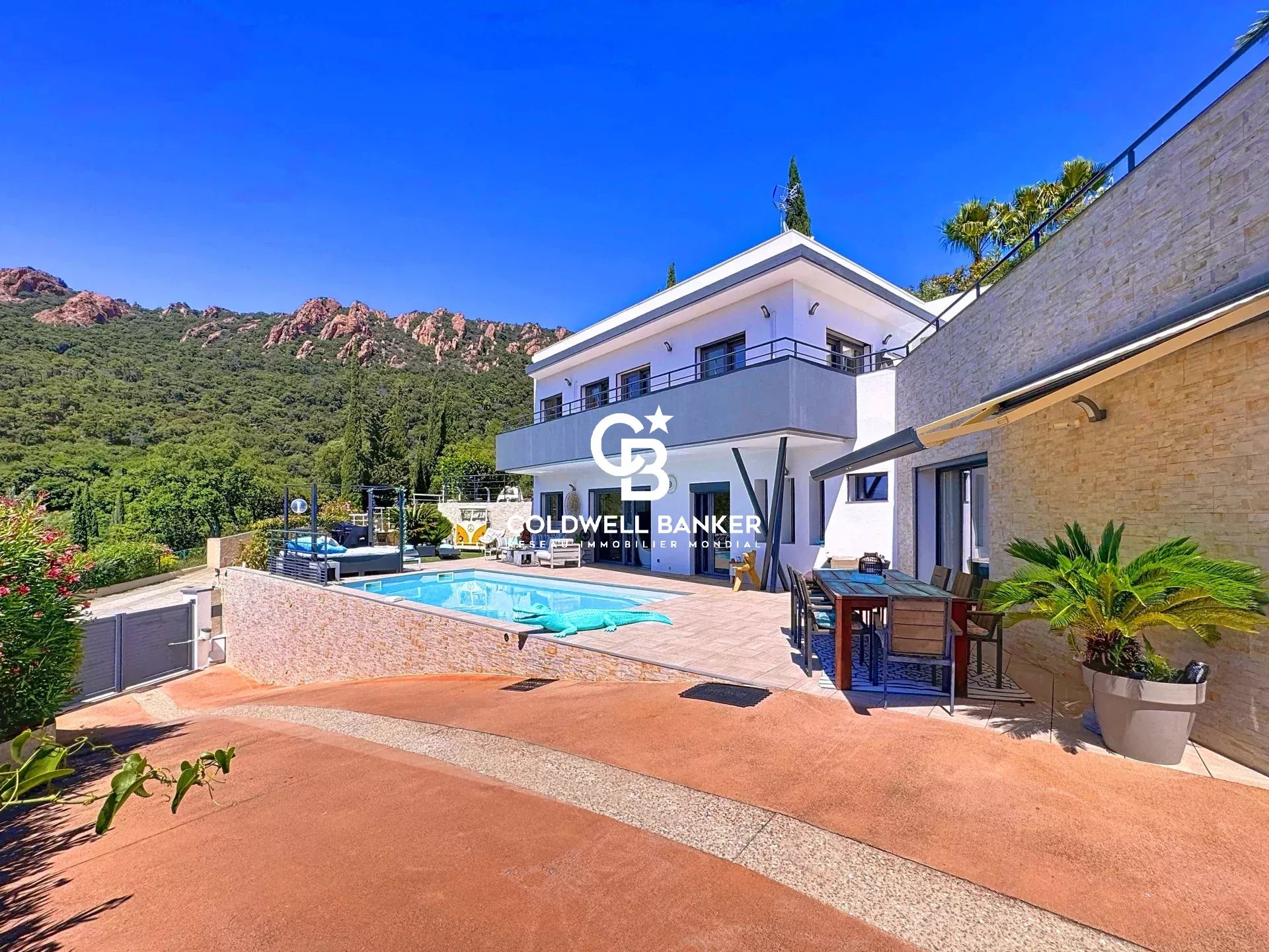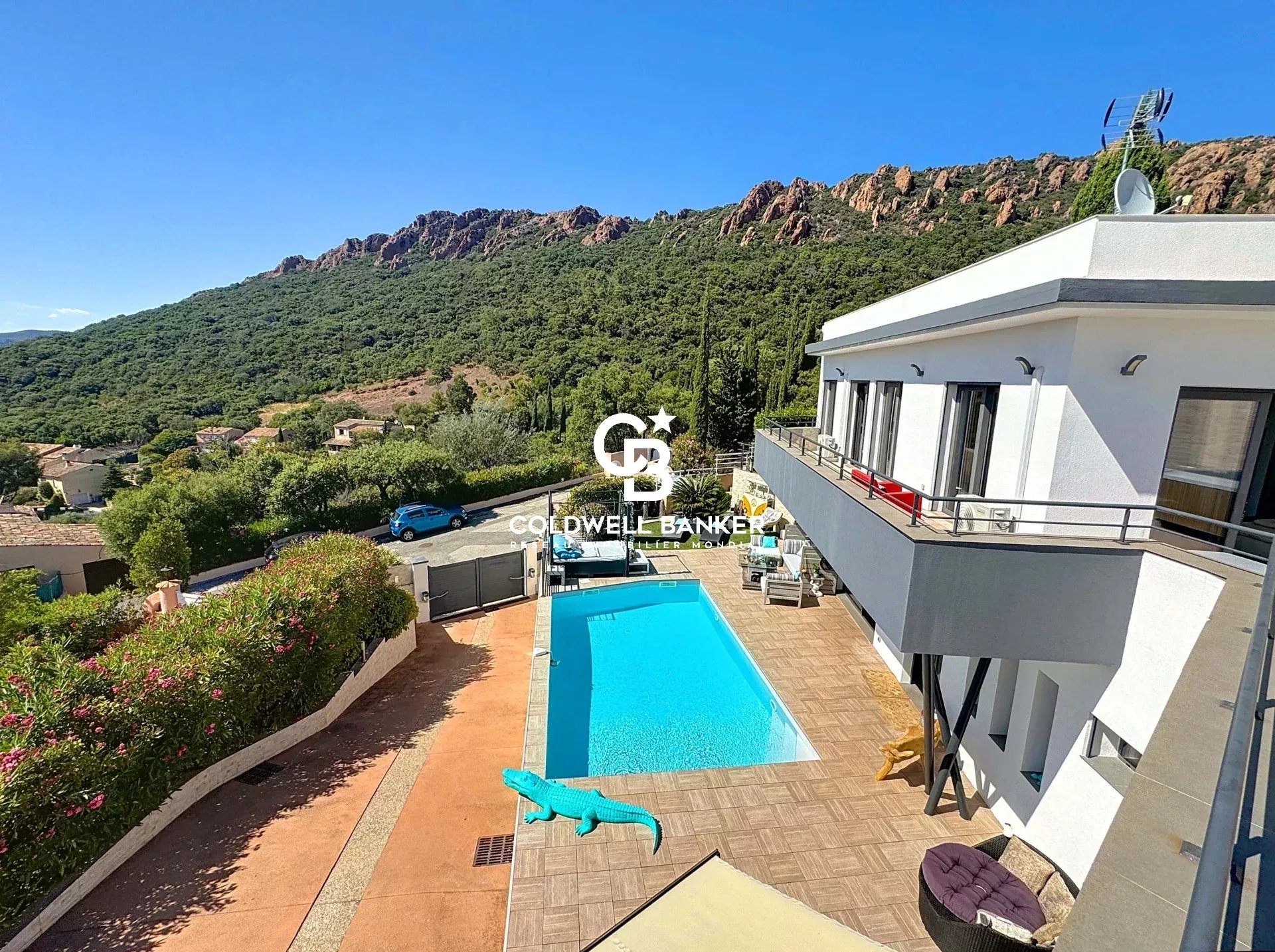 À quelques minutes des plages d’Agay, entre mer et roches rouges, cette propriété contemporaine d’exception s’élève en lisière du Massif de l’Esterel. Son architecture épouse avec finesse les codes intemporels du style “Art déco“ revisité, pour une réalisation élégante. Art de vivre raffiné et esthétisme Édifiée en 2011 sur un terrain paysager de 800 m², cette villa déploie 160 m² habitables (191 m² au total) au sein d’un environnement paisible et préservé. Lignes pures, volumes ouverts, lumière omniprésente Une pièce de vie d’environ 60 m² s’ouvre sur une terrasse et un espace détente extérieur. Le séjour, sublimé par un aménagement spacieux évoque une mise en scène chaleureuse. Cheminée élégante et escalier flottant, suspendu et massif complète le décor. La cuisine ouverte, raffinée allie design et convivialité : îlot central, mobilier sans poignées, équipements haut de gamme intégrée. Un lieu de partage aussi fonctionnel que sophistiqué. Espace nuit : sérénité & intimité : • Une suite parentale de plain-pied, avec dressing et salle de bains complète , offre un confort absolu. • À l’étage, deux belles chambres avec leurs salles d’eau privatives s’ouvrent sur une vaste terrasse agrémentée d’un jacuzzi et d’un salon de détente au panorama saisissant : Vue spectaculaire sur le massif de l’Esterel avec aperçu mer, la promesse d’un cadre de vie exceptionnel. Design intérieur : une signature affirmée : • Harmonies de béton brut, verre, bois clair, acier et pierre naturelle • Tons chauds, ponctués d’accents pop art et vintage • Objets déco soigneusement choisis, plantes XXL, touches street art subtilement intégrées Une composition élégante entre matières nobles et modernité, où chaque détail raconte une histoire. Extérieurs en continuité parfaite avec l’intérieur: Les lignes épurées de la façade dialoguent harmonieusement avec la nature environnante, dans une connexion constante à la lumière et à l’environnement. La villa invite à la détente avec un extérieur paysager structuré autour d’une grande terrasse de 200 m², une piscine neuve (5 x 8 m), solarium, lit baldaquin, canapés lounge... Prestations haut de gamme : • Puits canadien pour une climatisation naturelle et tempérée • Plancher chauffant, climatisation intégrée, triple vitrage anti-effraction • Domotique, aspiration centralisée, éclairage indirect, ventilation naturelle • Huisseries premium, performance énergétique élevée, panneaux photovoltaïques Un garage, des places de parking et possibilité d’aménager une quatrième chambre complètent l’offre Une villa d’exception entre mer, nature et design: À la croisée de l’architecture contemporaine et de l’esprit « Art déco » réinventé, cette propriété propose une lecture inspirée : durabilité, ergonomie, esthétisme, et intelligence de l’espace. Proximité des plages, des commodités et d’un environnement naturel classé, pour une invitation à vivre avec style et élégance, au cœur d’un site exceptionnel. Plaquette de présentation et descriptif détaillé sur demande contact: Williams AUREILLE +33 (0) 682 822 539 - williams.aureille@coldwellbanker.fr