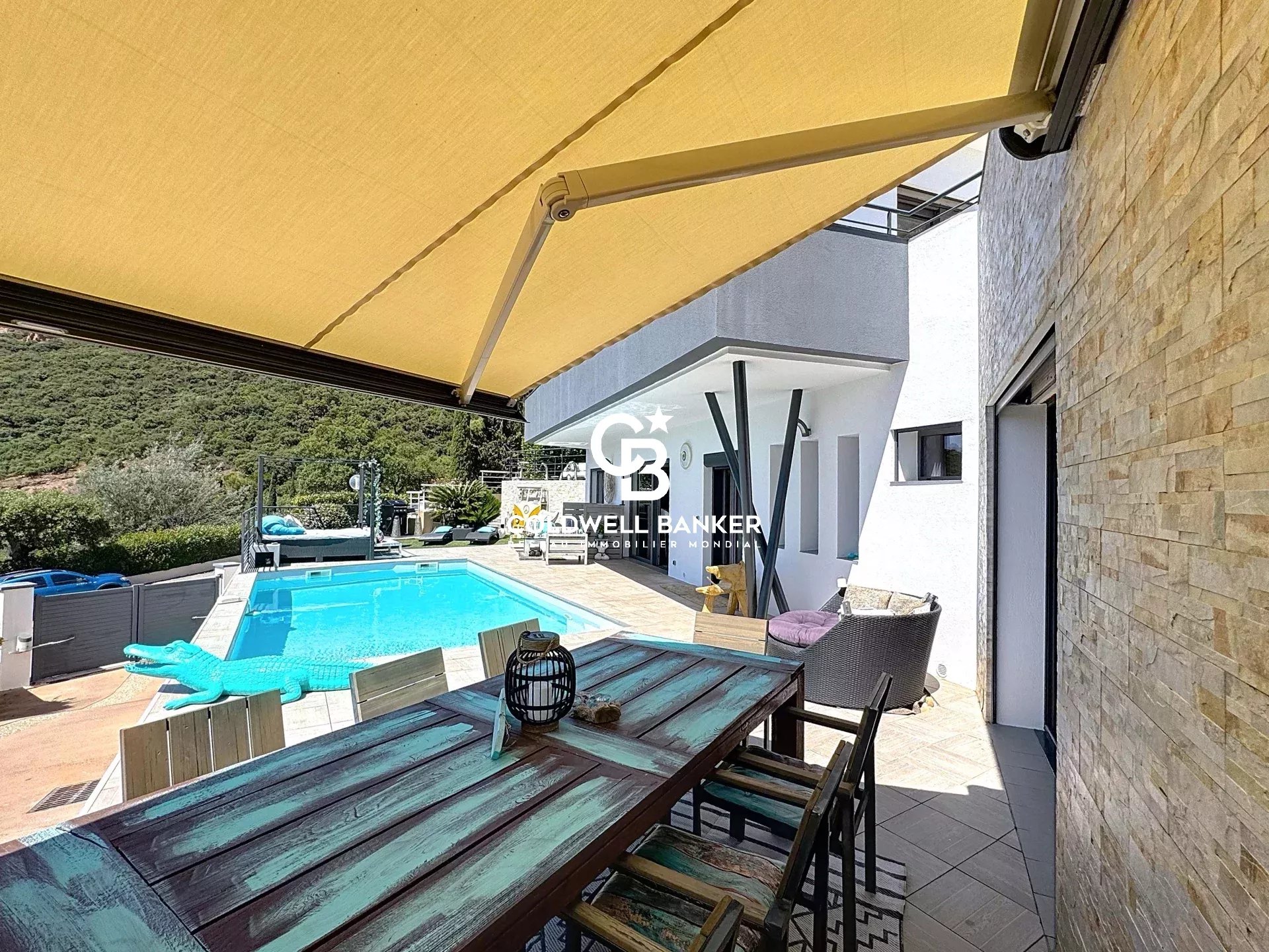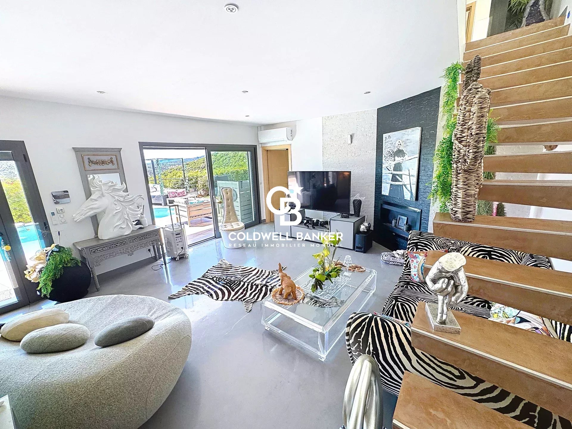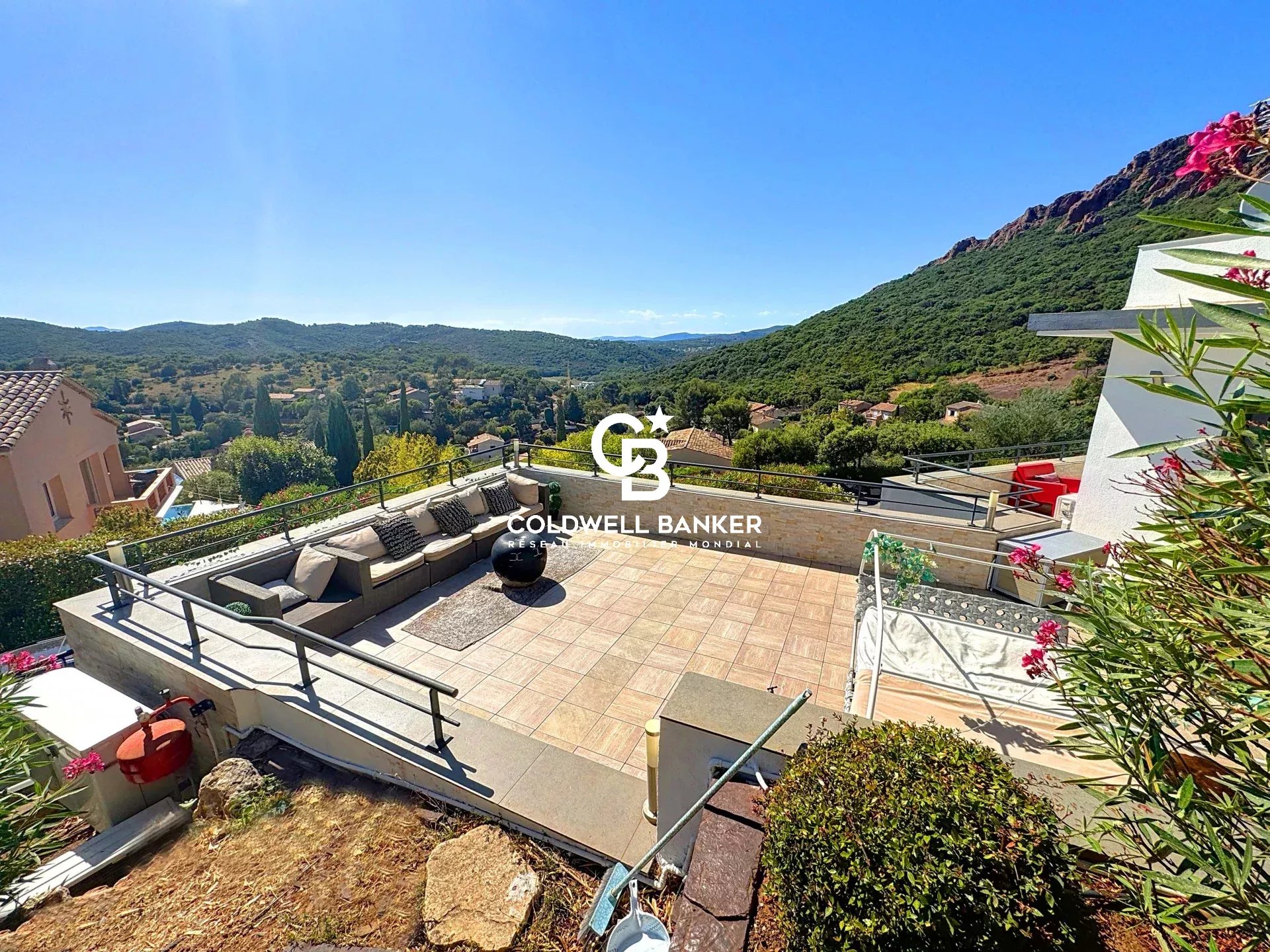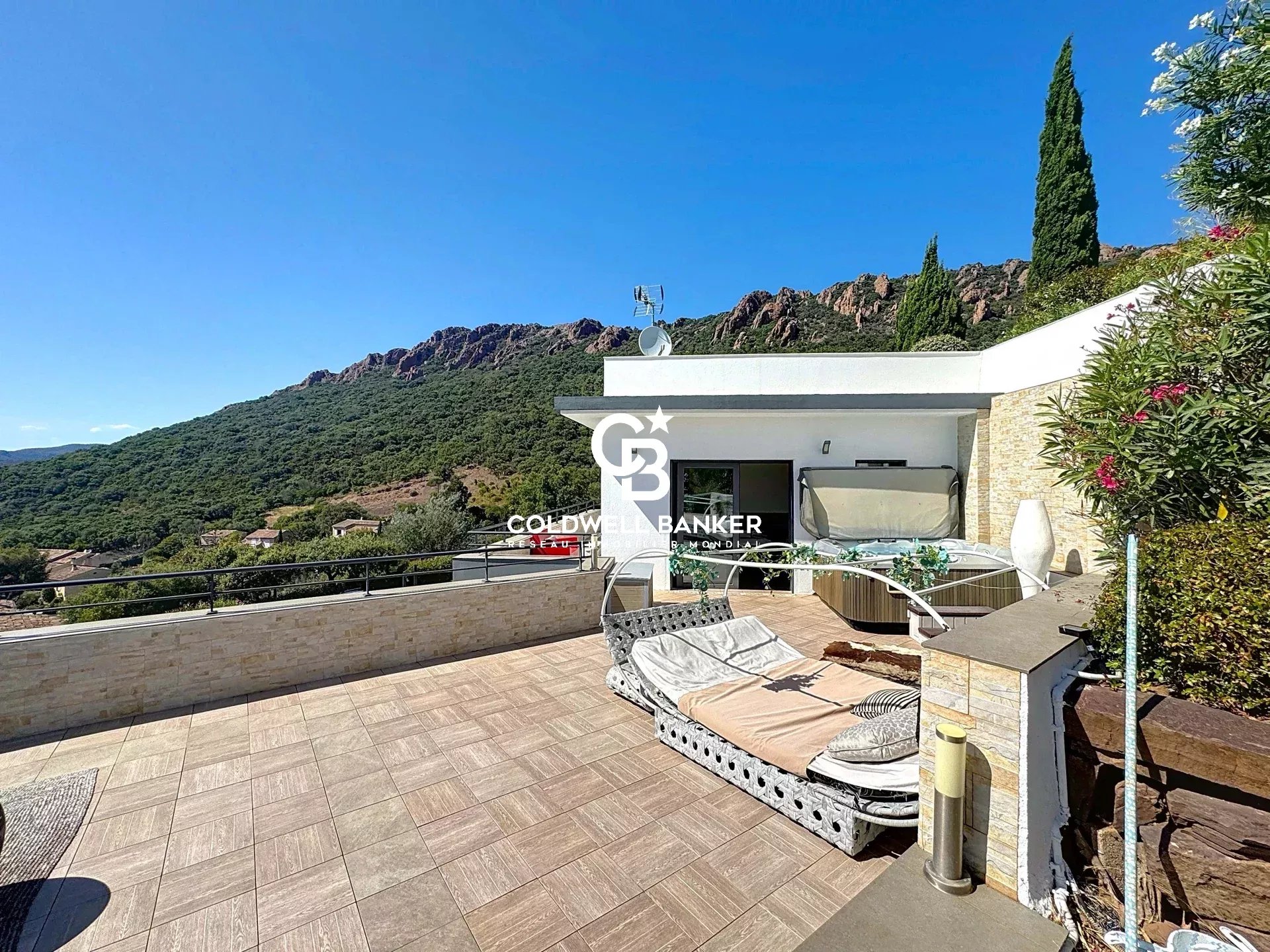 À quelques minutes des plages d’Agay, entre mer et roches rouges, cette propriété contemporaine d’exception s’élève en lisière du Massif de l’Esterel. Son architecture épouse avec finesse les codes intemporels du style “Art déco“ revisité, pour une réalisation élégante. Art de vivre raffiné et esthétisme Édifiée en 2011 sur un terrain paysager de 800 m², cette villa déploie 160 m² habitables (191 m² au total) au sein d’un environnement paisible et préservé. Lignes pures, volumes ouverts, lumière omniprésente Une pièce de vie d’environ 60 m² s’ouvre sur une terrasse et un espace détente extérieur. Le séjour, sublimé par un aménagement spacieux évoque une mise en scène chaleureuse. Cheminée élégante et escalier flottant, suspendu et massif complète le décor. La cuisine ouverte, raffinée allie design et convivialité : îlot central, mobilier sans poignées, équipements haut de gamme intégrée. Un lieu de partage aussi fonctionnel que sophistiqué. Espace nuit : sérénité & intimité : • Une suite parentale de plain-pied, avec dressing et salle de bains complète , offre un confort absolu. • À l’étage, deux belles chambres avec leurs salles d’eau privatives s’ouvrent sur une vaste terrasse agrémentée d’un jacuzzi et d’un salon de détente au panorama saisissant : Vue spectaculaire sur le massif de l’Esterel avec aperçu mer, la promesse d’un cadre de vie exceptionnel. Design intérieur : une signature affirmée : • Harmonies de béton brut, verre, bois clair, acier et pierre naturelle • Tons chauds, ponctués d’accents pop art et vintage • Objets déco soigneusement choisis, plantes XXL, touches street art subtilement intégrées Une composition élégante entre matières nobles et modernité, où chaque détail raconte une histoire. Extérieurs en continuité parfaite avec l’intérieur: Les lignes épurées de la façade dialoguent harmonieusement avec la nature environnante, dans une connexion constante à la lumière et à l’environnement. La villa invite à la détente avec un extérieur paysager structuré autour d’une grande terrasse de 200 m², une piscine neuve (5 x 8 m), solarium, lit baldaquin, canapés lounge... Prestations haut de gamme : • Puits canadien pour une climatisation naturelle et tempérée • Plancher chauffant, climatisation intégrée, triple vitrage anti-effraction • Domotique, aspiration centralisée, éclairage indirect, ventilation naturelle • Huisseries premium, performance énergétique élevée, panneaux photovoltaïques Un garage, des places de parking et possibilité d’aménager une quatrième chambre complètent l’offre Une villa d’exception entre mer, nature et design: À la croisée de l’architecture contemporaine et de l’esprit « Art déco » réinventé, cette propriété propose une lecture inspirée : durabilité, ergonomie, esthétisme, et intelligence de l’espace. Proximité des plages, des commodités et d’un environnement naturel classé, pour une invitation à vivre avec style et élégance, au cœur d’un site exceptionnel. Plaquette de présentation et descriptif détaillé sur demande contact: Williams AUREILLE +33 (0) 682 822 539 - williams.aureille@coldwellbanker.fr