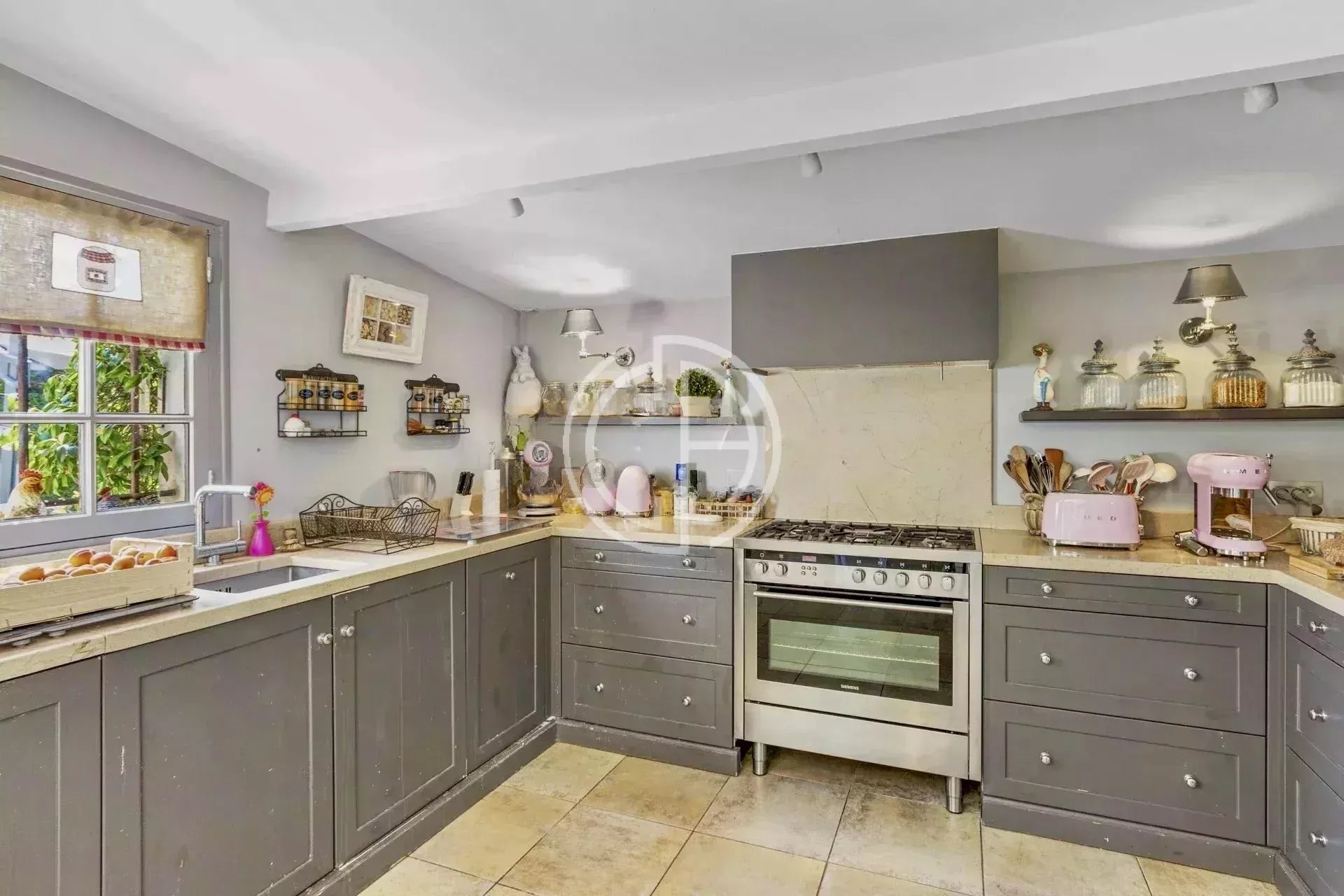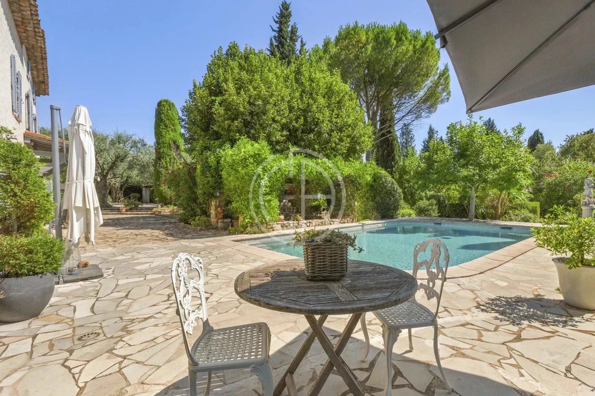 MOUGINS SUD- Charme absolu pour ce véritable mas construit sur une ancienne oliveraie. Incarnation de l'art de vivre provençal, vous serez séduit pas son authenticité et son atmosphère chaleureuse. Édifié sur un terrain arboré avec piscine au sel, il conserve ses matériaux d'époque : sols anciens, portes d'origine et murs en pierres. Les divers salons, la vaste salle à manger, la cuisine et arrière-cuisine, et les multiples espaces de vie comme la véranda séduisent par leur charme singulier. Une buanderie, un cellier, une salle d'eau avec WC complète ce niveau. Possibilité de faire une chambre de plain pieds. À l'étage, la partie nuit se compose de deux chambres dont une suite avec dressing, d'une salle d'eau supplémentaire et une chambre d'enfant/ bureau. Les extérieurs, pensés pour célébrer chaque moment de la journée offrent un jardin paysager agrémenté de terrasses ombragées, un espace repas sous la pergola et sa glycine qui apporte une touche de poésie. Un bien rare à Mougins, idéal pour les amateurs de propriétés intemporelles recherchant à la fois la proximité du village et la tranquillité d'un environnement verdoyant. A 8mn de Cannes, proches des commerces, facile d'accès. Les informations sur les risques auxquels ce bien est exposé sont disponibles sur le site www.georisques.gouv.fr
