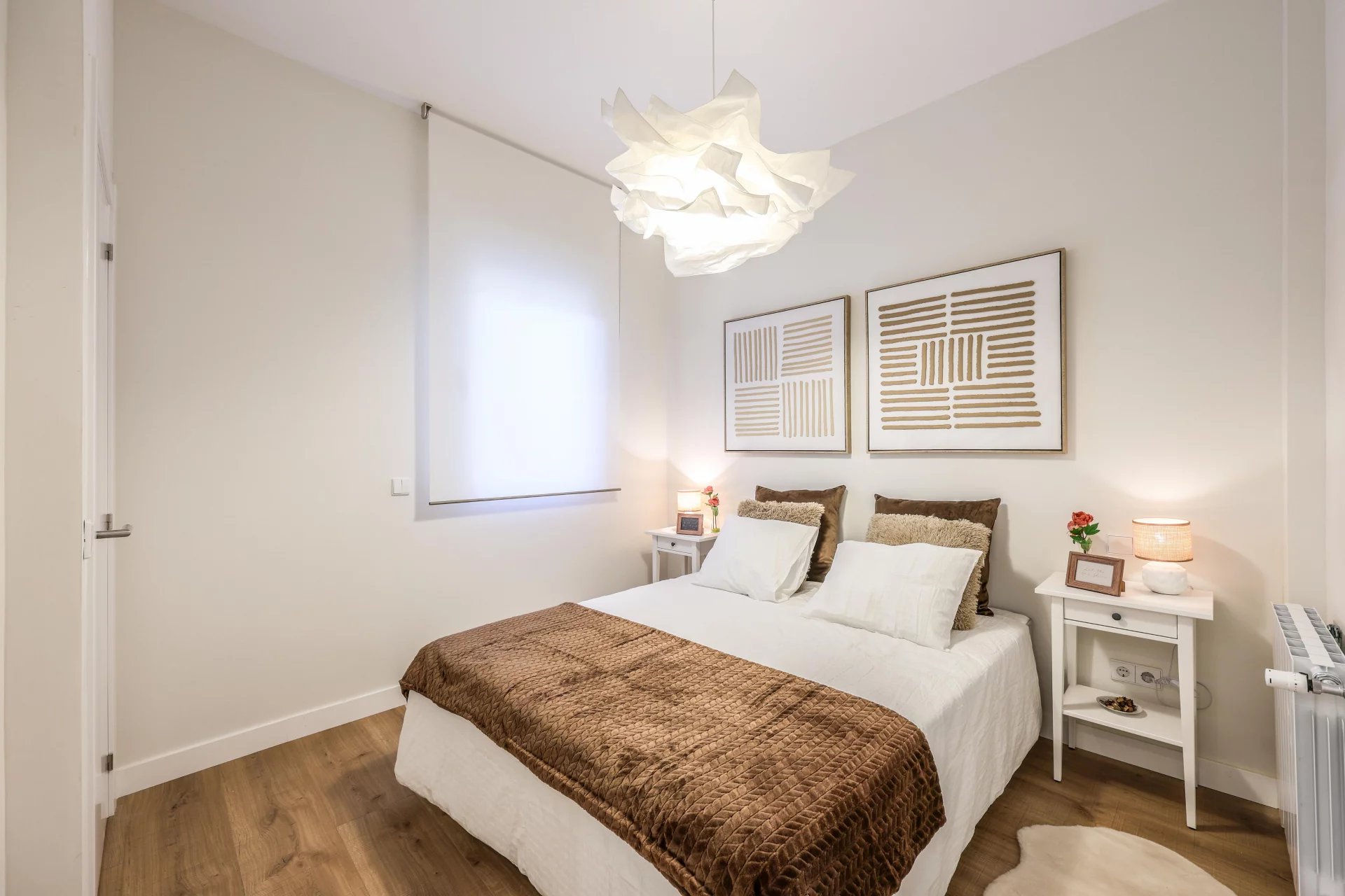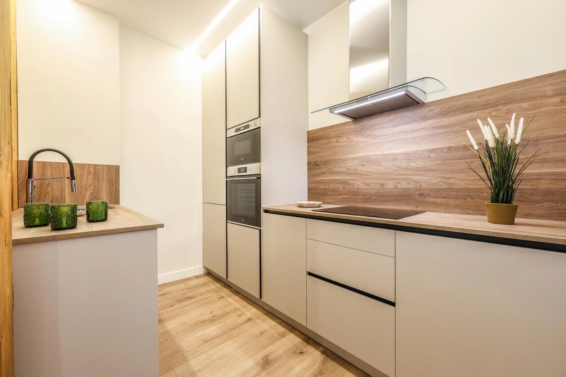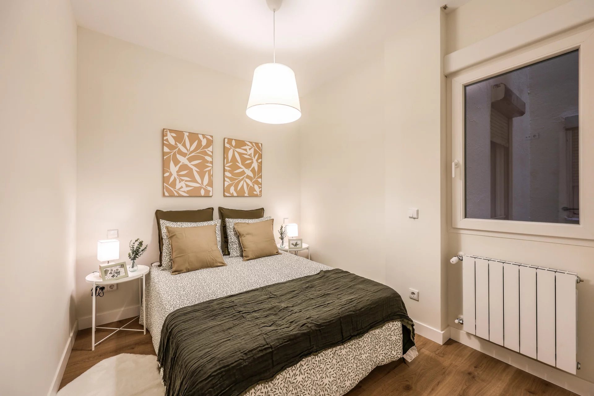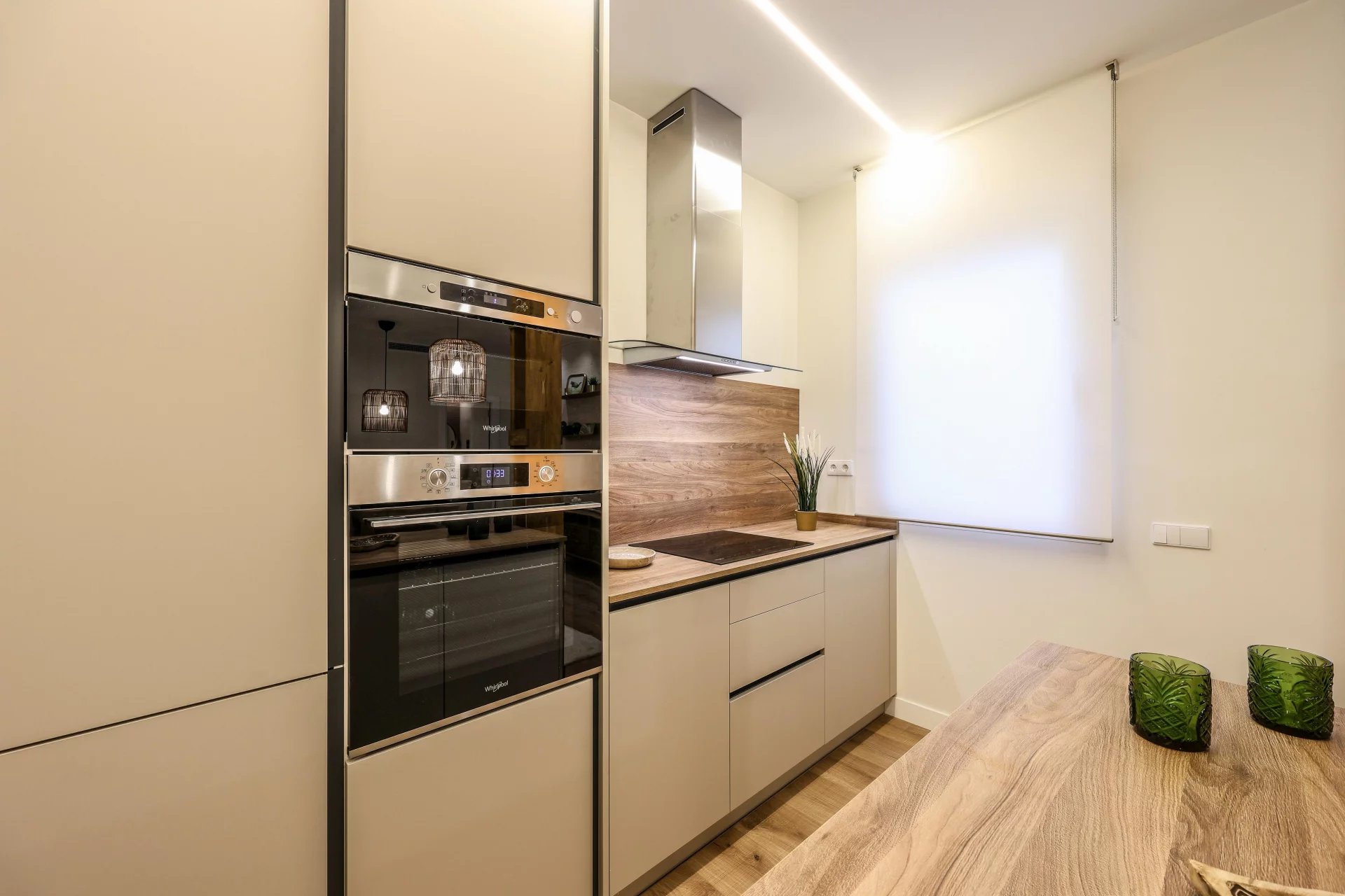 There are two bathrooms and a small laundry area. The apartment has undergone a comprehensive renovation using high-quality materials. It includes ducted air conditioning throughout all rooms, and the windows are tilt-and-turn with motorized blinds. The apartment is delivered fully furnished.