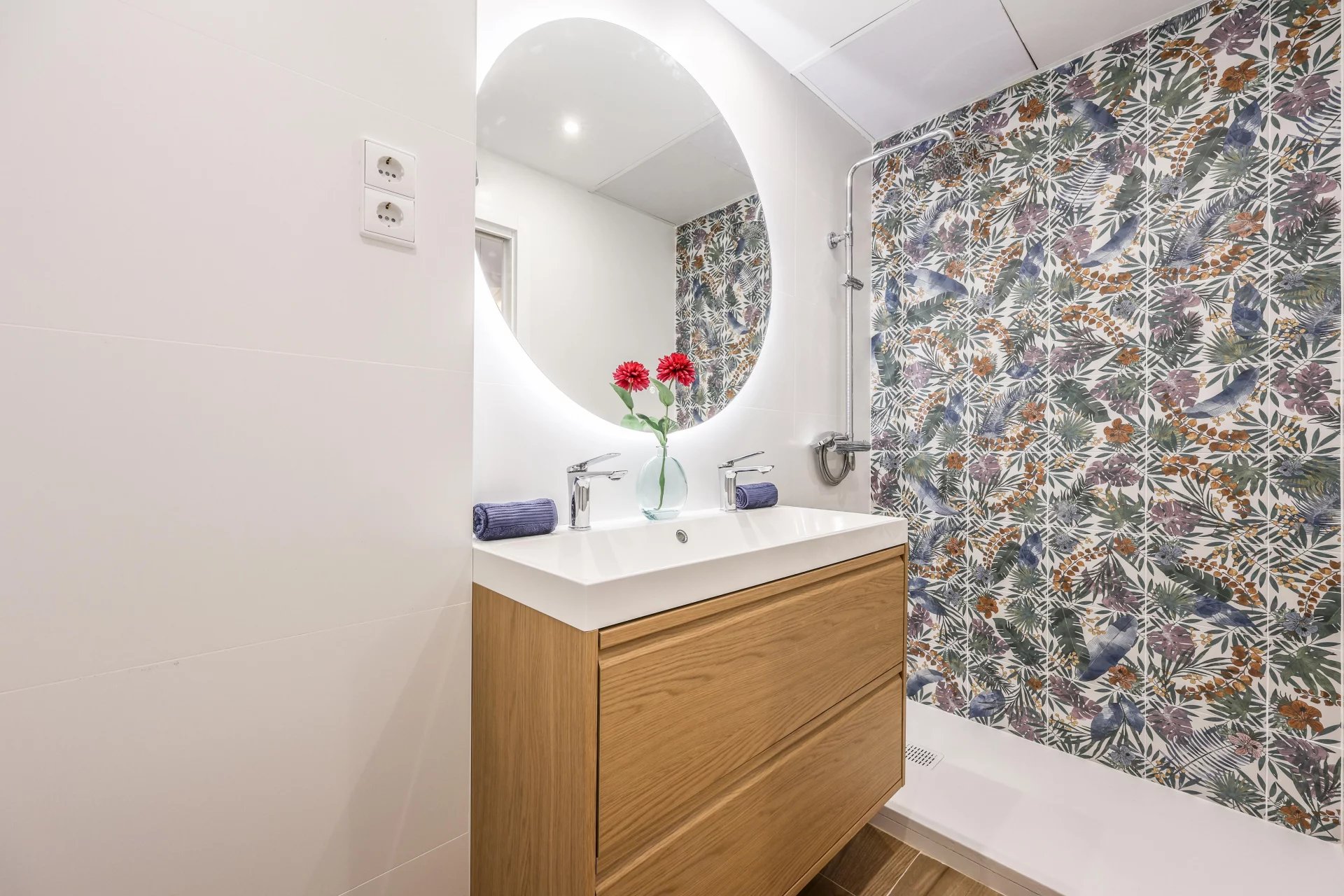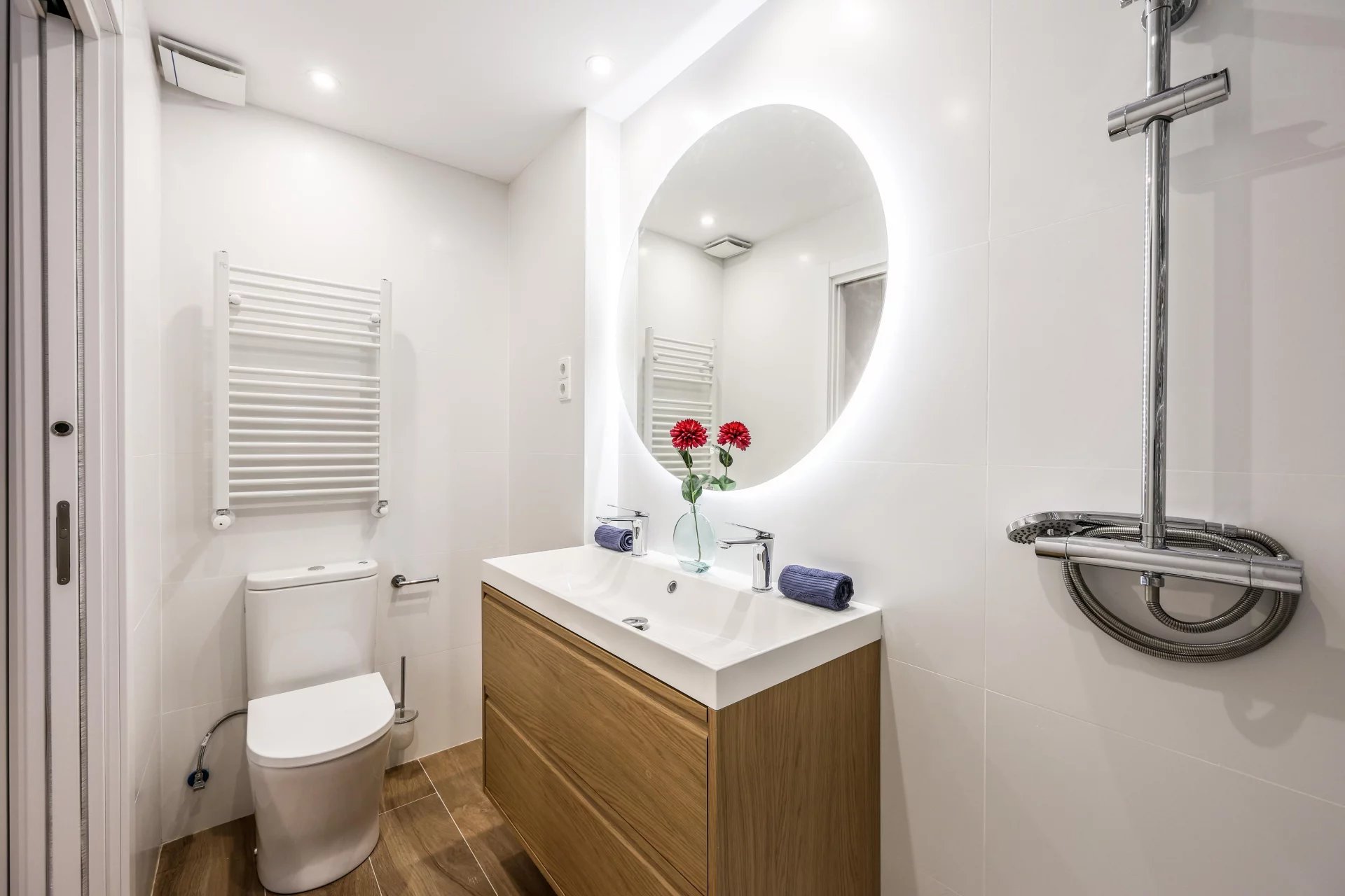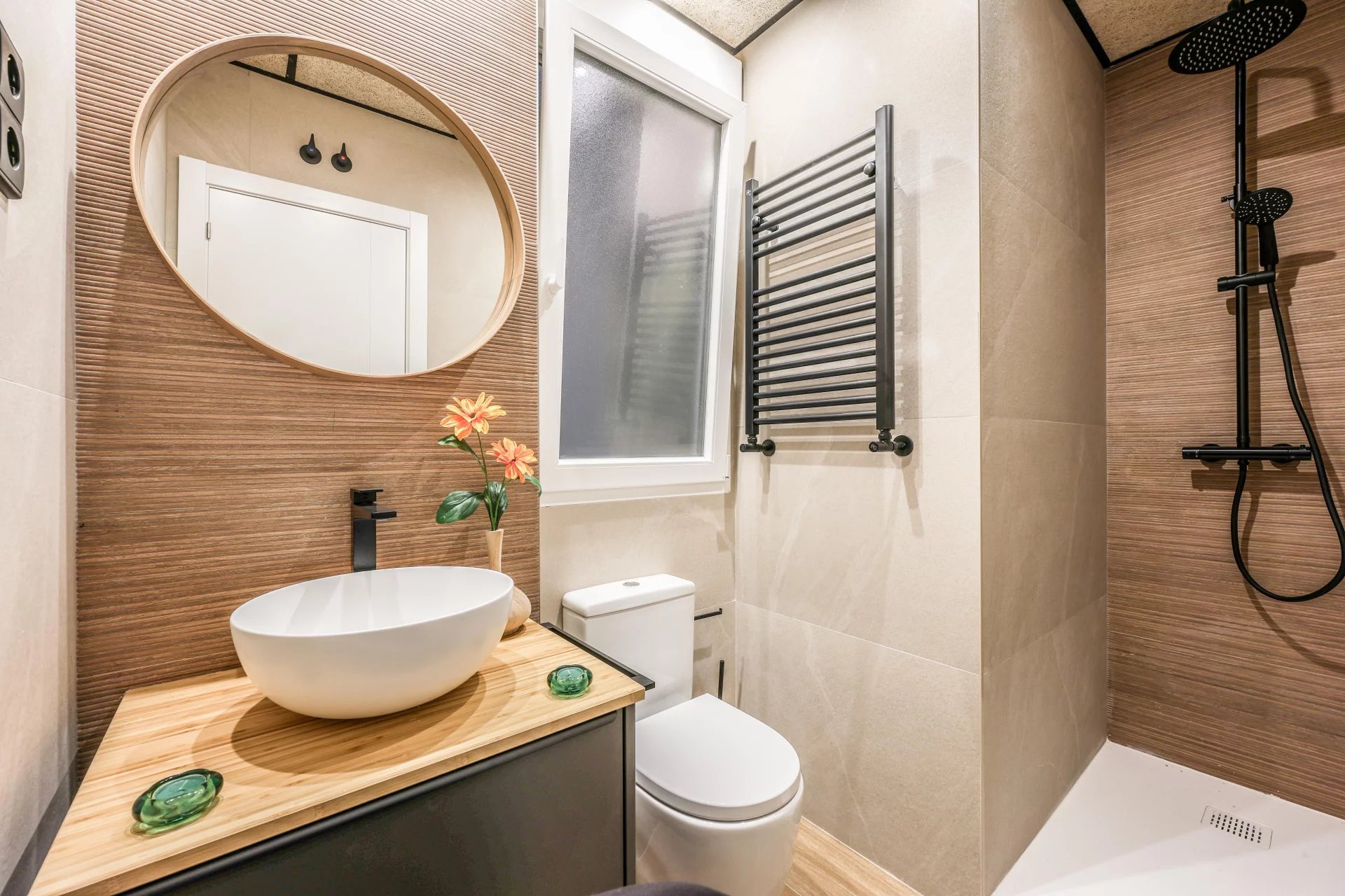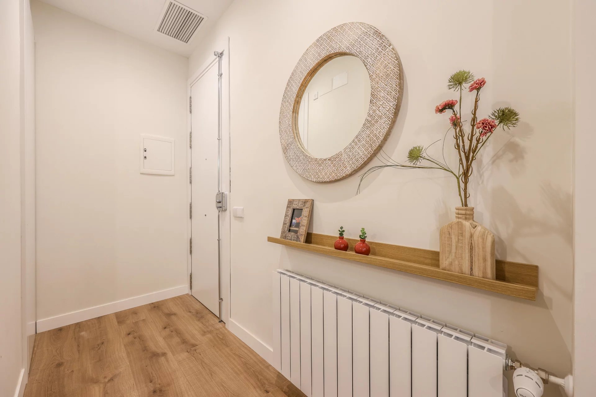 There are two bathrooms and a small laundry area. The apartment has undergone a comprehensive renovation using high-quality materials. It includes ducted air conditioning throughout all rooms, and the windows are tilt-and-turn with motorized blinds. The apartment is delivered fully furnished.