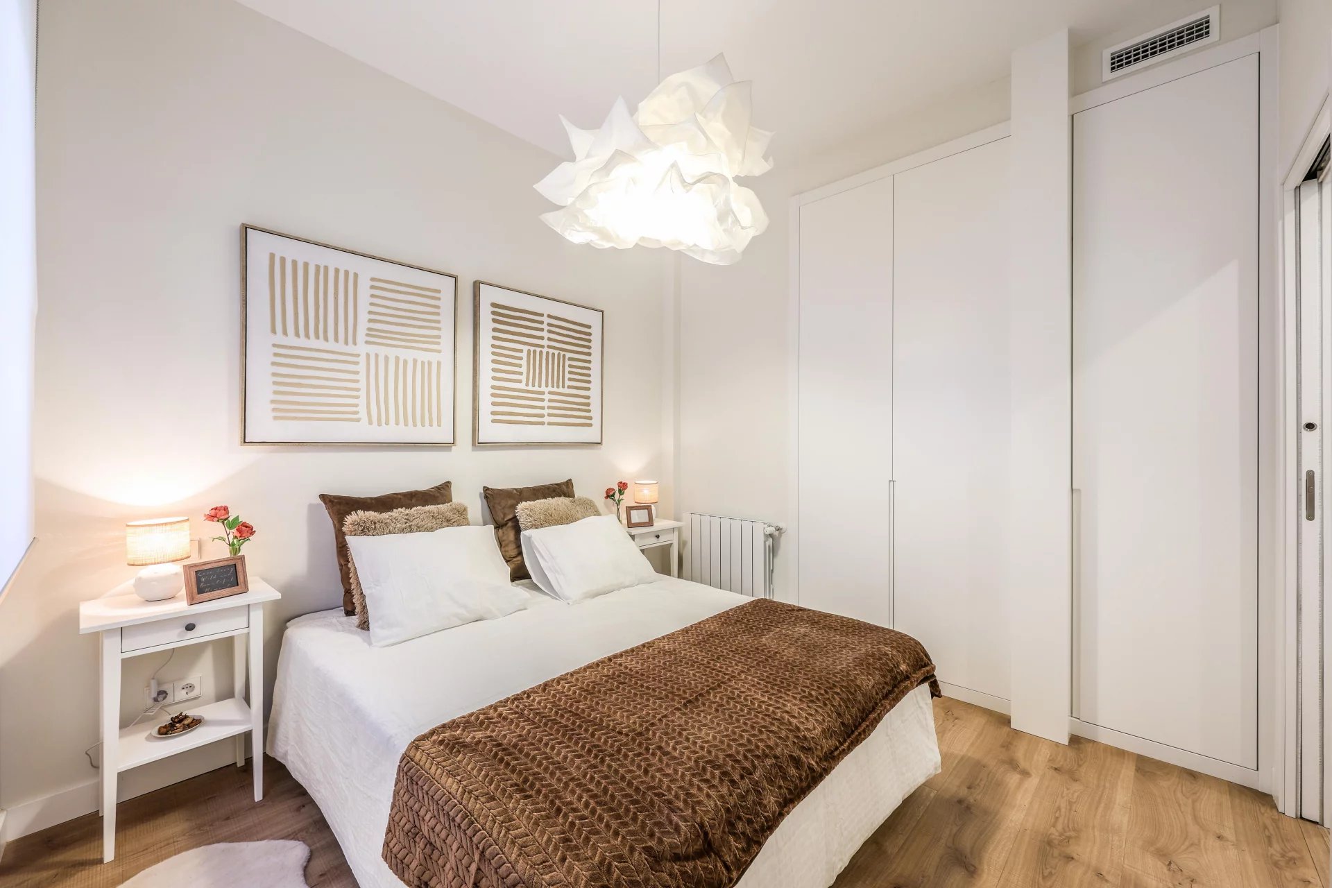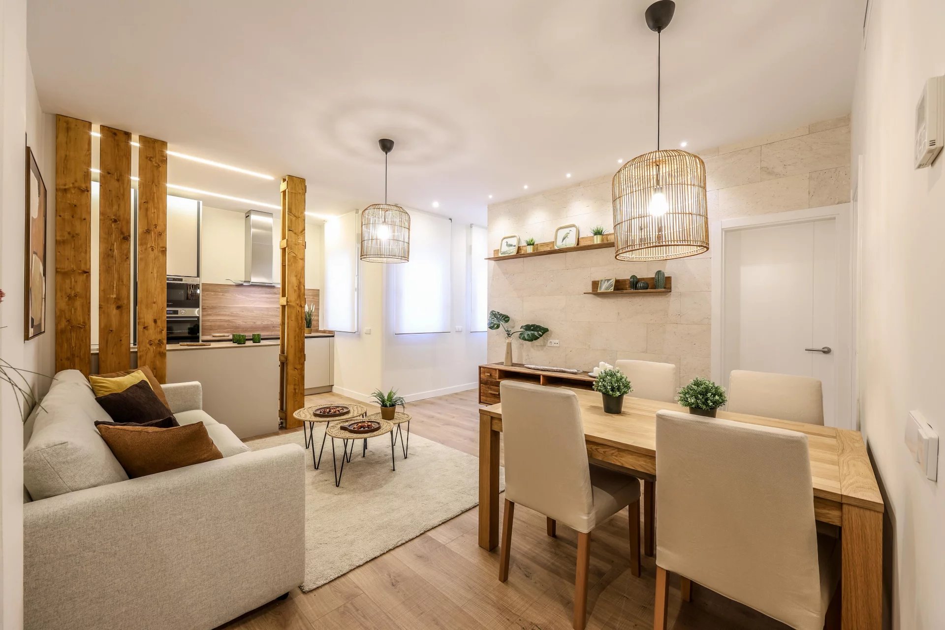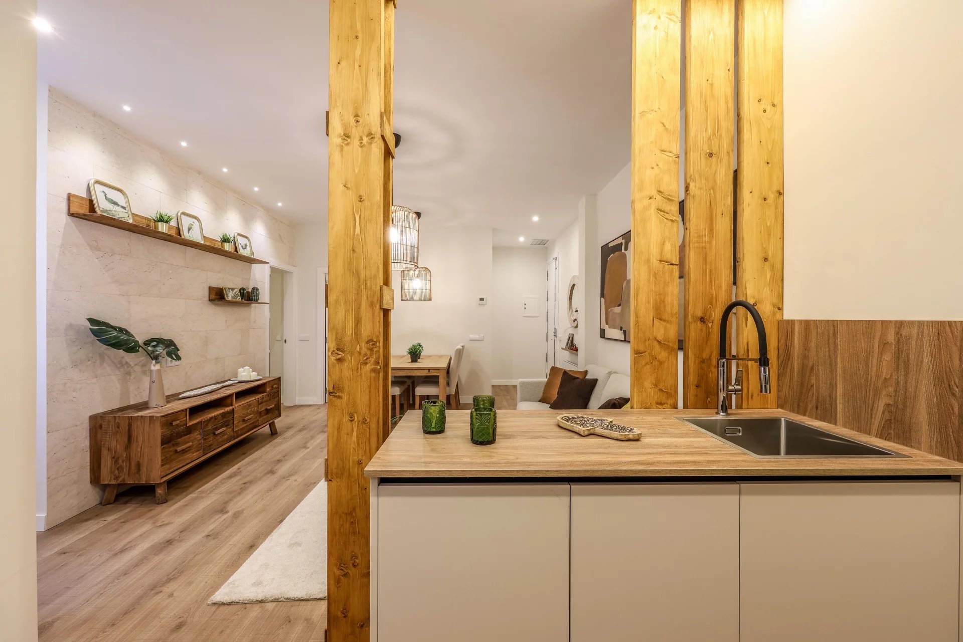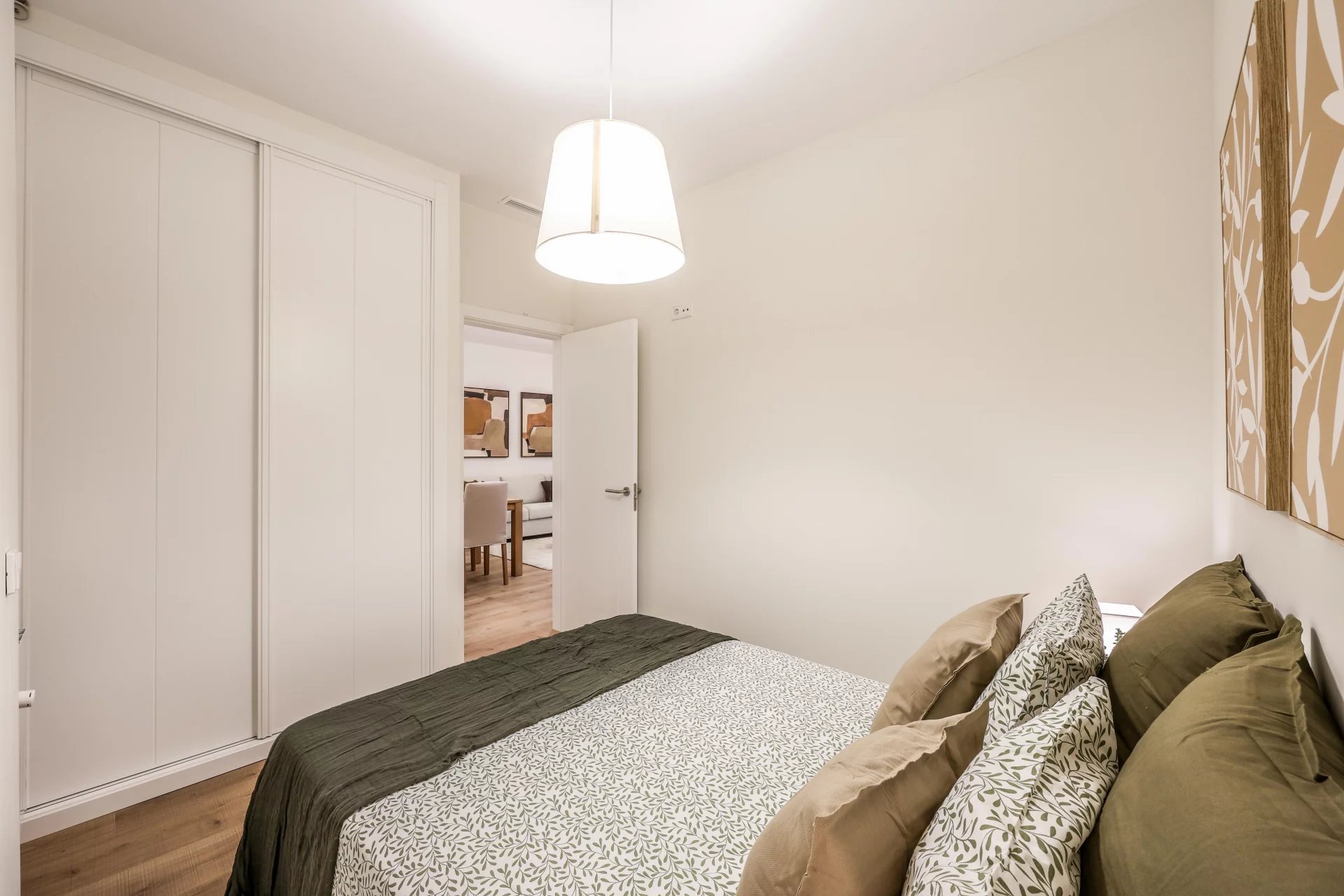 This first-floor interior apartment offers 63 m² of well-planned living space. It features a spacious living room with a fully equipped open kitchen that includes integrated appliances. The property has two double bedrooms with built-in wardrobes that come fully dressed.