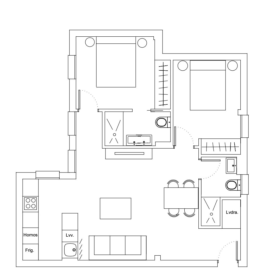 Veraltia offers this first-floor interior apartment featuring 63 m² of well-designed space. It includes a spacious living room with an open kitchen fully equipped with integrated appliances. The home has two double bedrooms with built-in wardrobes that come fully dressed, as well as two bathrooms and a compact laundry area.