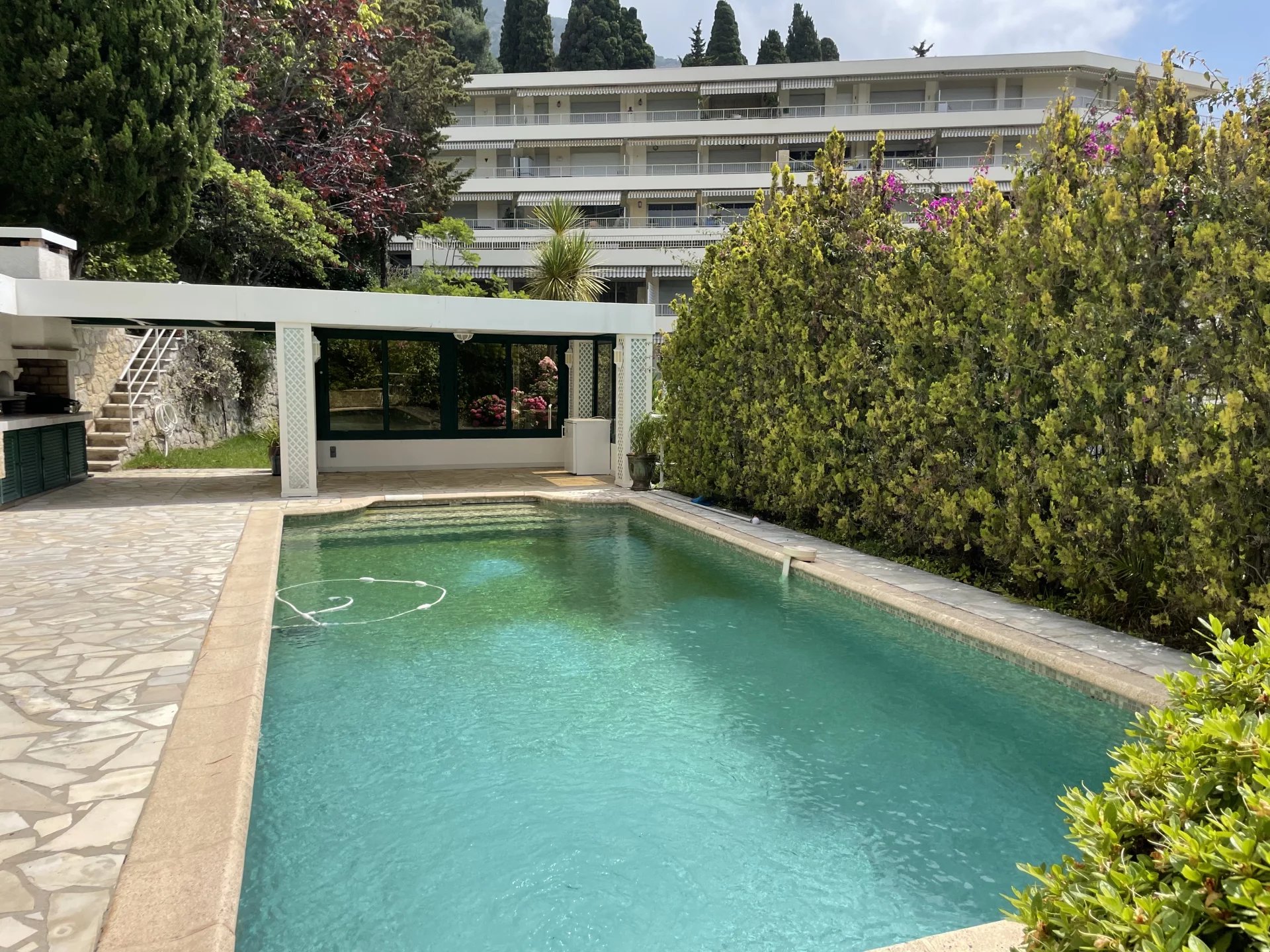 Situato in una delle zone più ricercate della Costa Azzurra, nel cuore di Mentone Garavan, questo appartamento duplex offre un ambiente di vita tanto lussuoso quanto rilassante. Incastonato tra mare e cielo, unisce i vantaggi di una villa indipendente alla sicurezza e al comfort di un moderno appartamento. L'ingresso conduce a un'ampia sala di ricevimento con zona pranzo, ampliata da una terrazza di 92 m² esposta a sud. Una seconda terrazza ospita una piscina privata. Una cucina separata e completamente attrezzata si apre su questo spazio esterno, dotato di pool house, cucina estiva, barbecue e giardino alberato. Al piano superiore, la suite padronale ha una terrazza privata, un ampio spogliatoio e un bagno privato. Ci sono altre due camere da letto, entrambe con bagno privato con doccia, servizi igienici e aree esterne private. Completano la vendita un garage doppio e una spaziosa cantina.