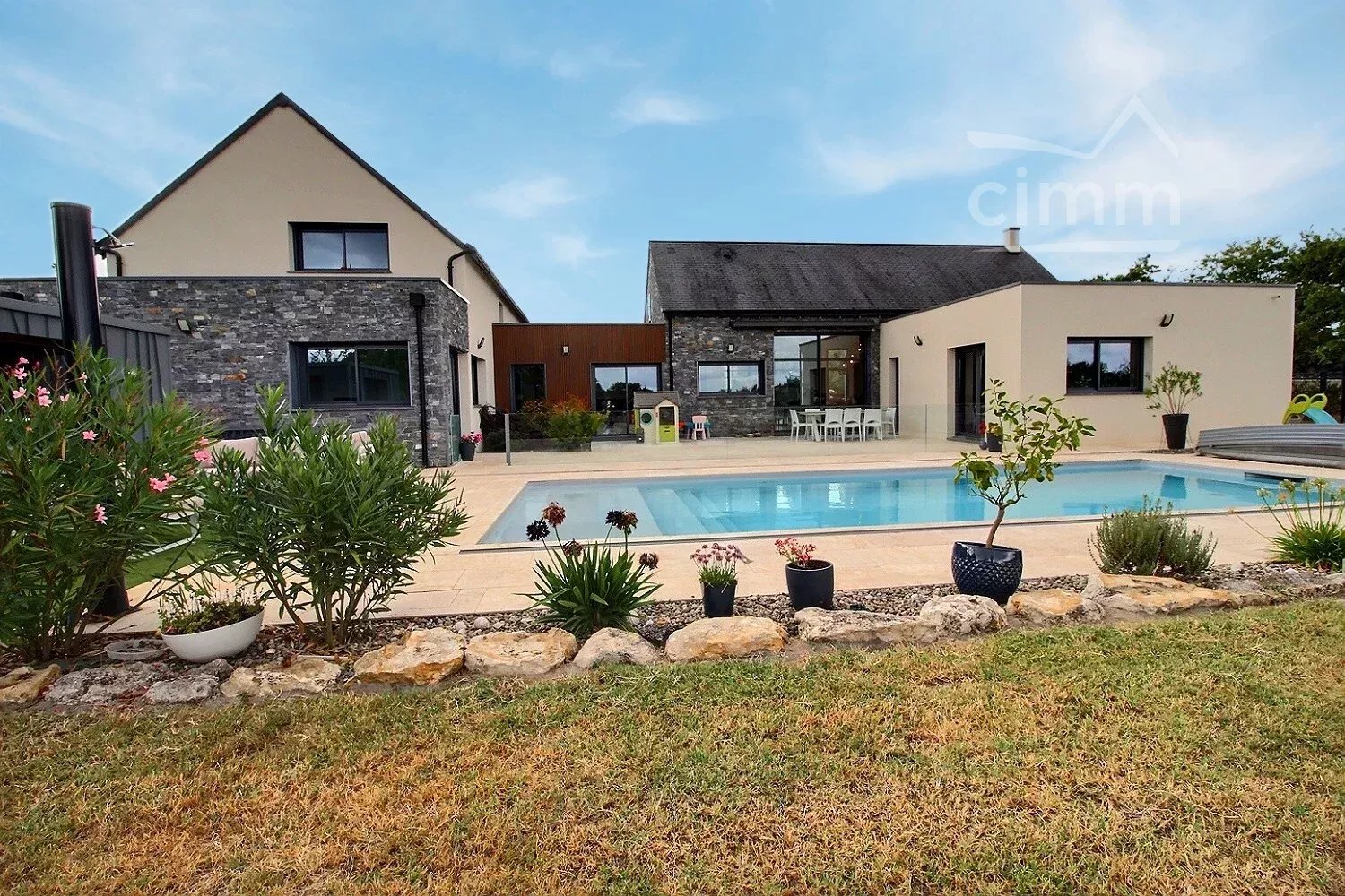 Les extérieurs sont pensés comme un véritable lieu de vie : une belle terrasse donnant sur une piscine sécurisée de 4m x 9m au sel ( avec douche solaire ), une cuisine d'été au design contemporain, une mare, un grand abri pour le mobilier extérieur et un terrain de pétanque.