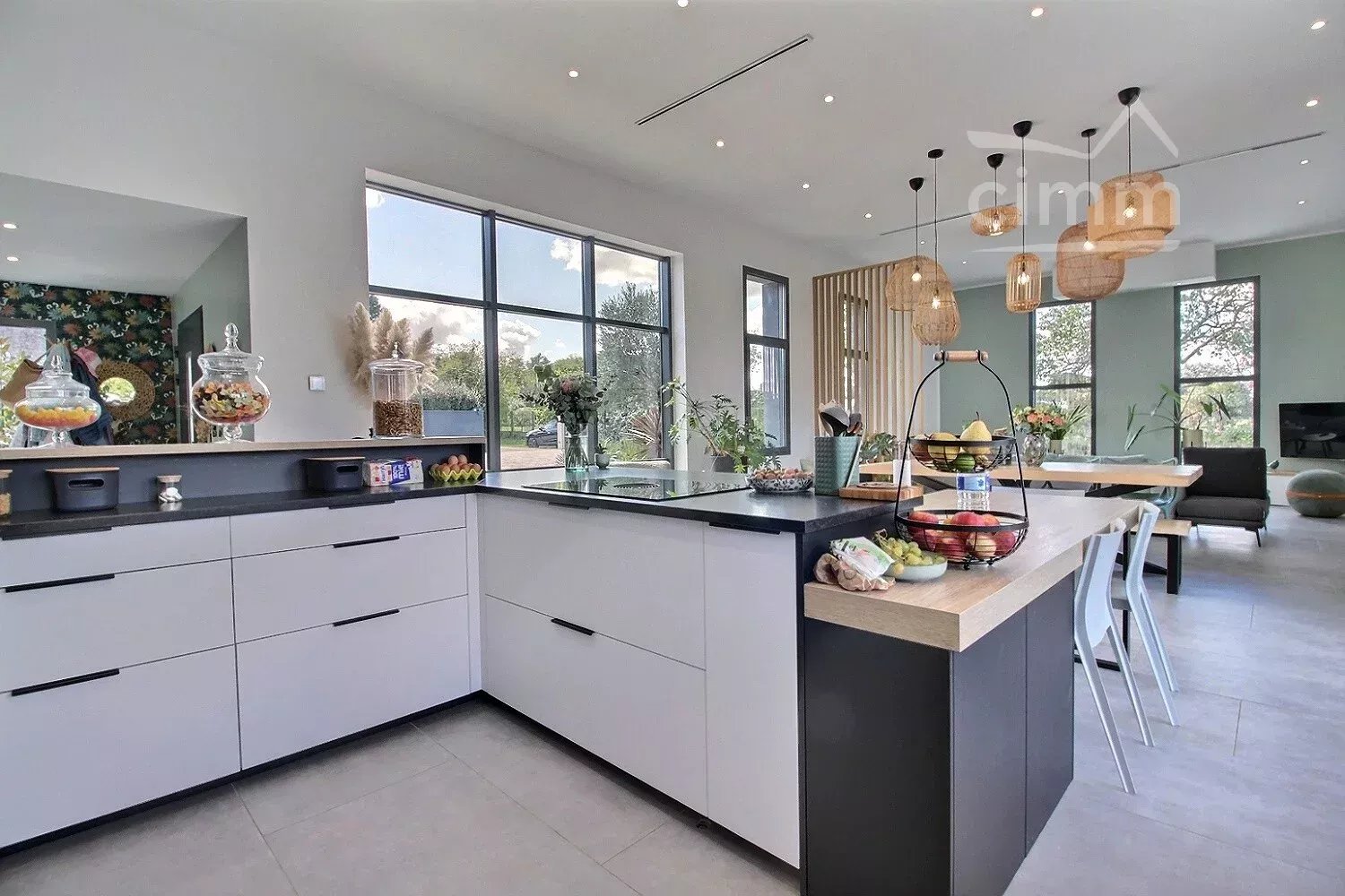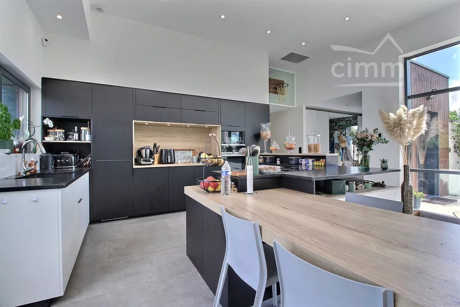 Dès l'entrée, vous serez séduit par l'ambiance à la fois chaleureuse et contemporaine du vaste séjour baigné de lumière naturelle avec ses grandes baies vitrées, avec vue sur le jardin et la piscine. La hauteur sous plafond de 4,50m amplifie cette sensation d'espace et de clarté.