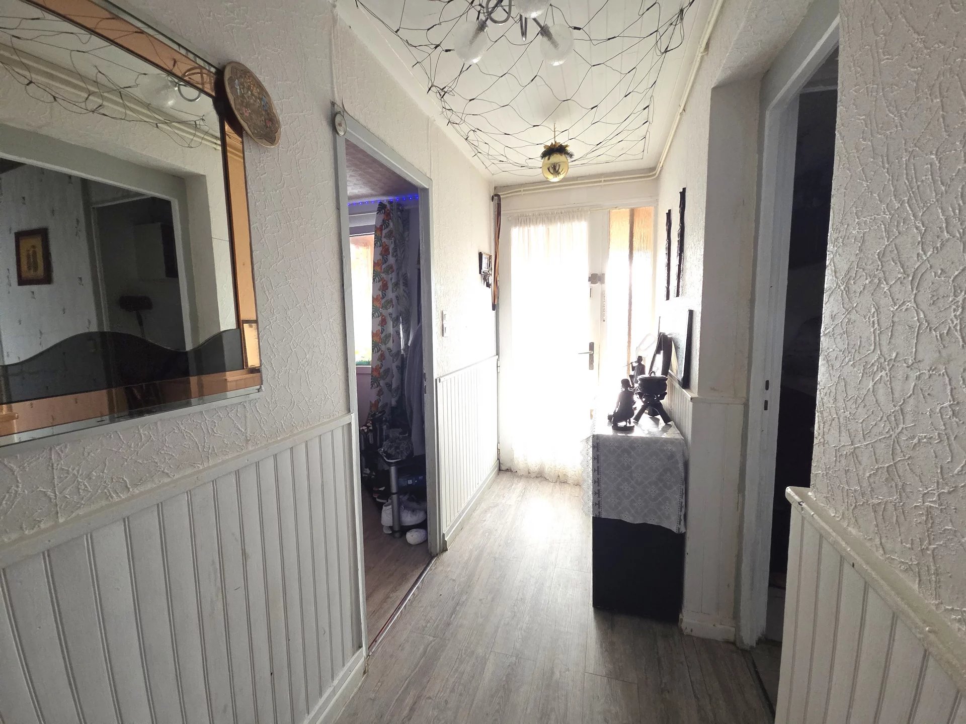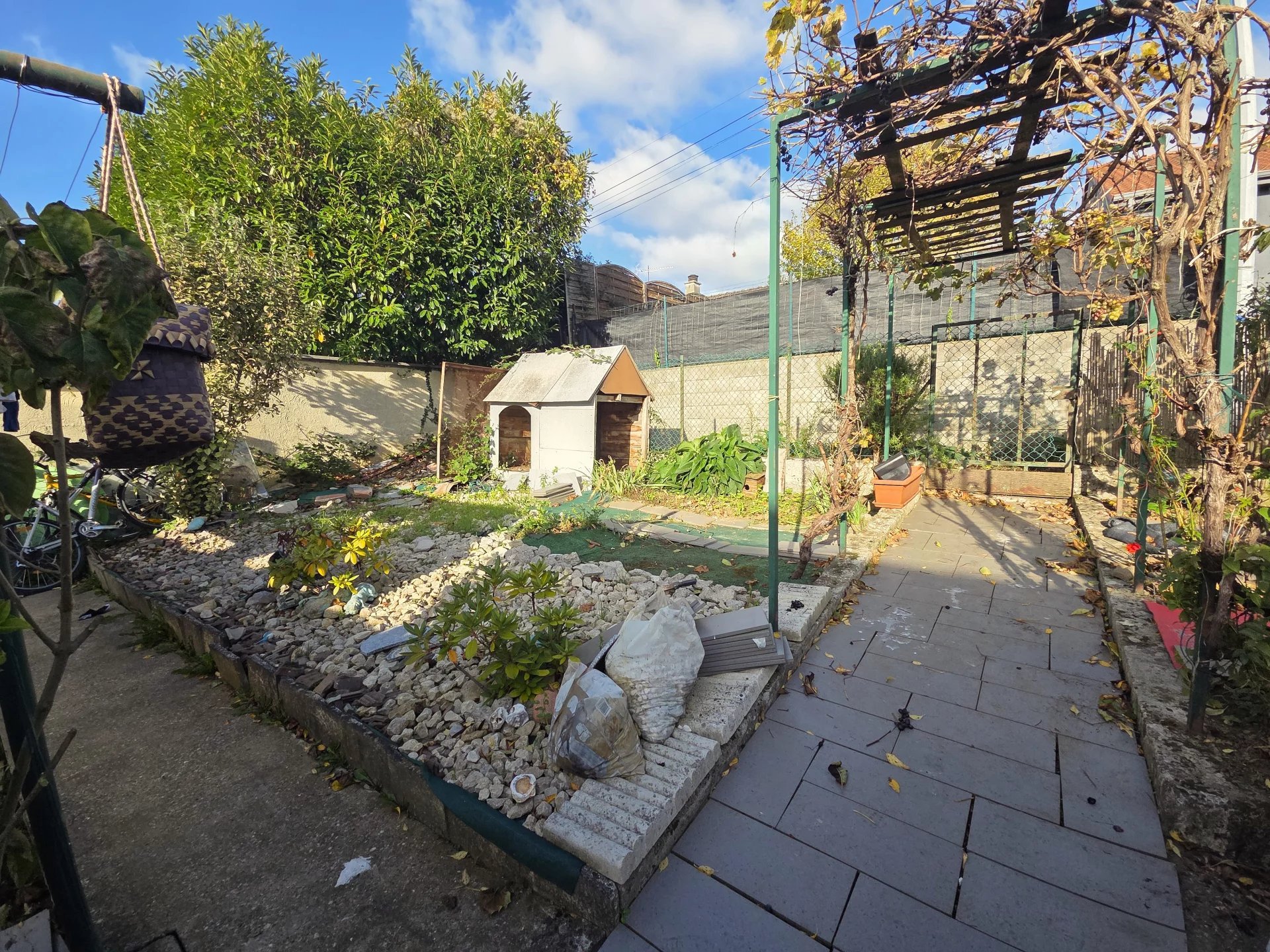 Une salle de bains en bon état, un WC séparé, un garage et un abri de jardin complètent l’ensemble.