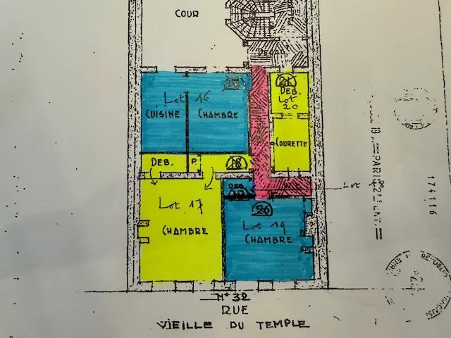 Marais - Rue Vieille du Temple - 2 lots non contigus au 2ème étage par escaliers. Le 1ER lot sur cour dispose d'une pièce et d'une cuisine, d'une surface totale de 17,83 m2 Le second lot sur rue se compose d'une pièce avec douche de 14,44m2. WC commun sur le palier (Détail de la configuration sur le plan en bleu)