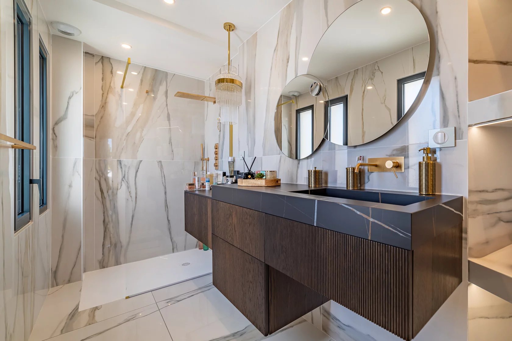 D’une surface habitable d’environ 220 m² sur un terrain de 745 m², cette maison d’exception séduit par son architecture raffinée, ses volumes généreux et ses prestations haut de gamme.
